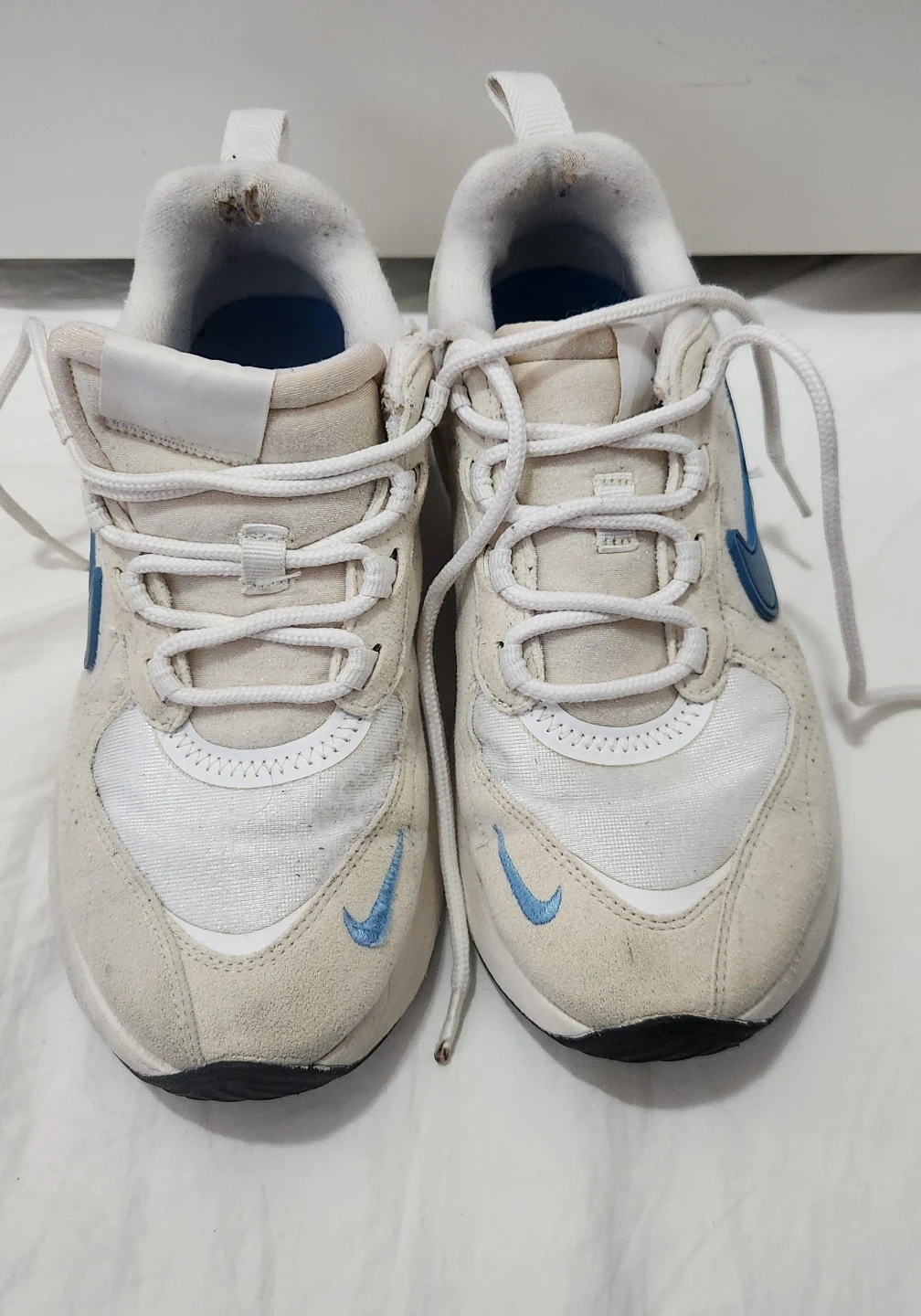 Selling a pair of Nike Air Max 200 sneakers in white with blue accents. They show some signs of wear, as you can see in the photos, but still have lots of life left in them. Great for everyday wear or workouts! Size US 6.5 UK 4 EUR 37.5
