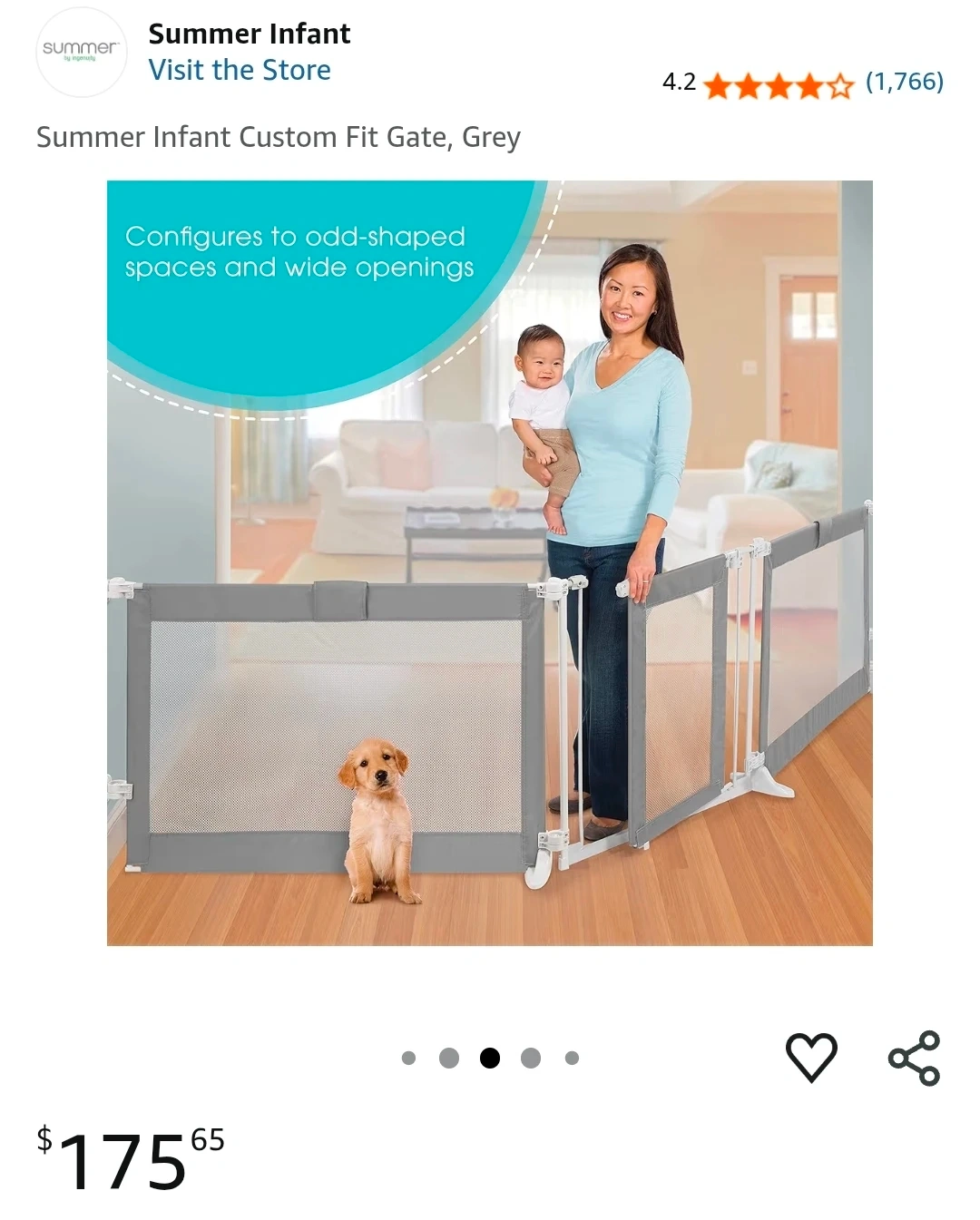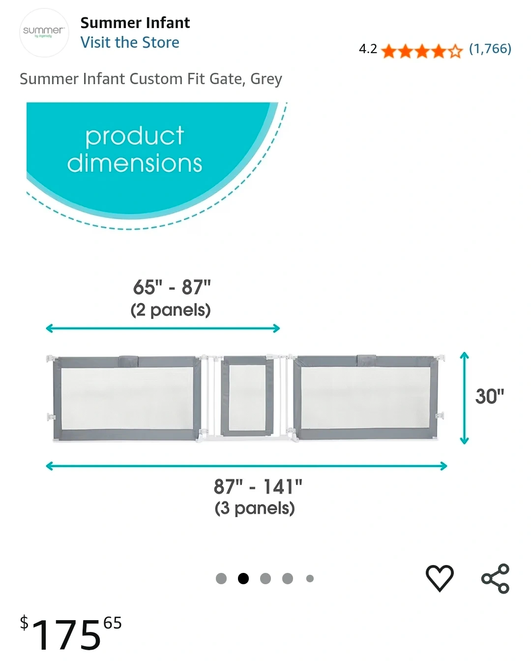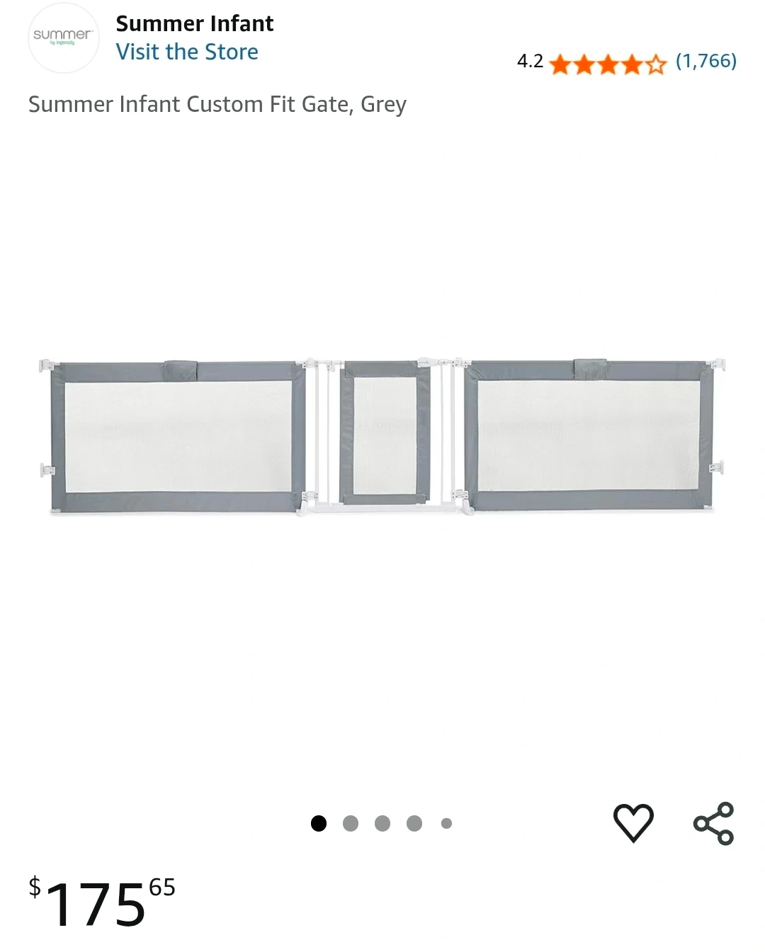 Selling a Summer Infant Custom Fit Gate in grey! It's in great shape and perfect for keeping your little one safe. The gate can fit openings from 65" to 141" wide and is 30" tall. Originally bought for $175.65