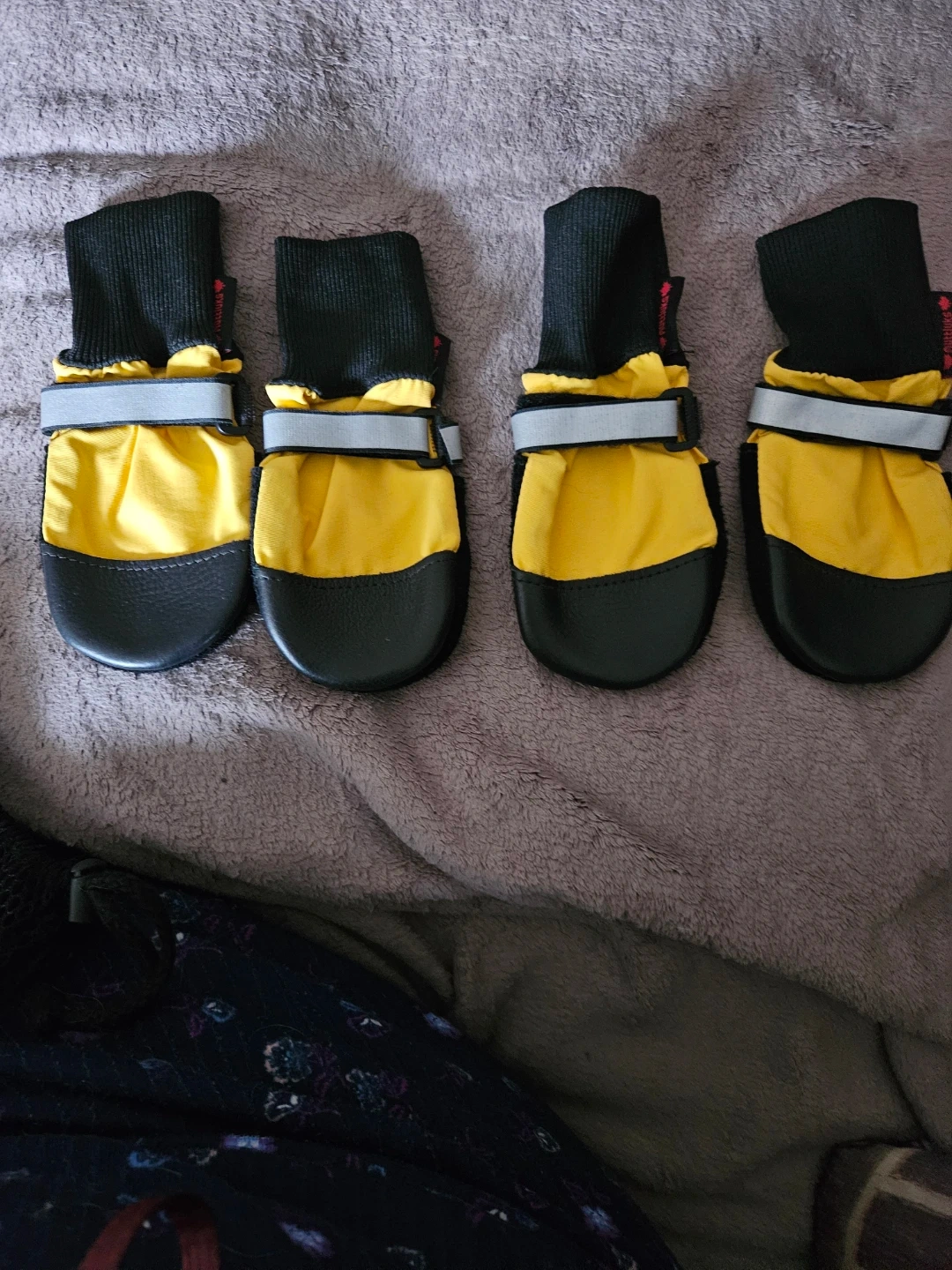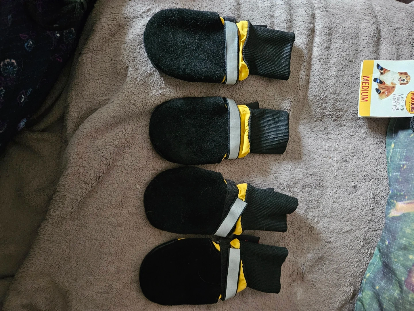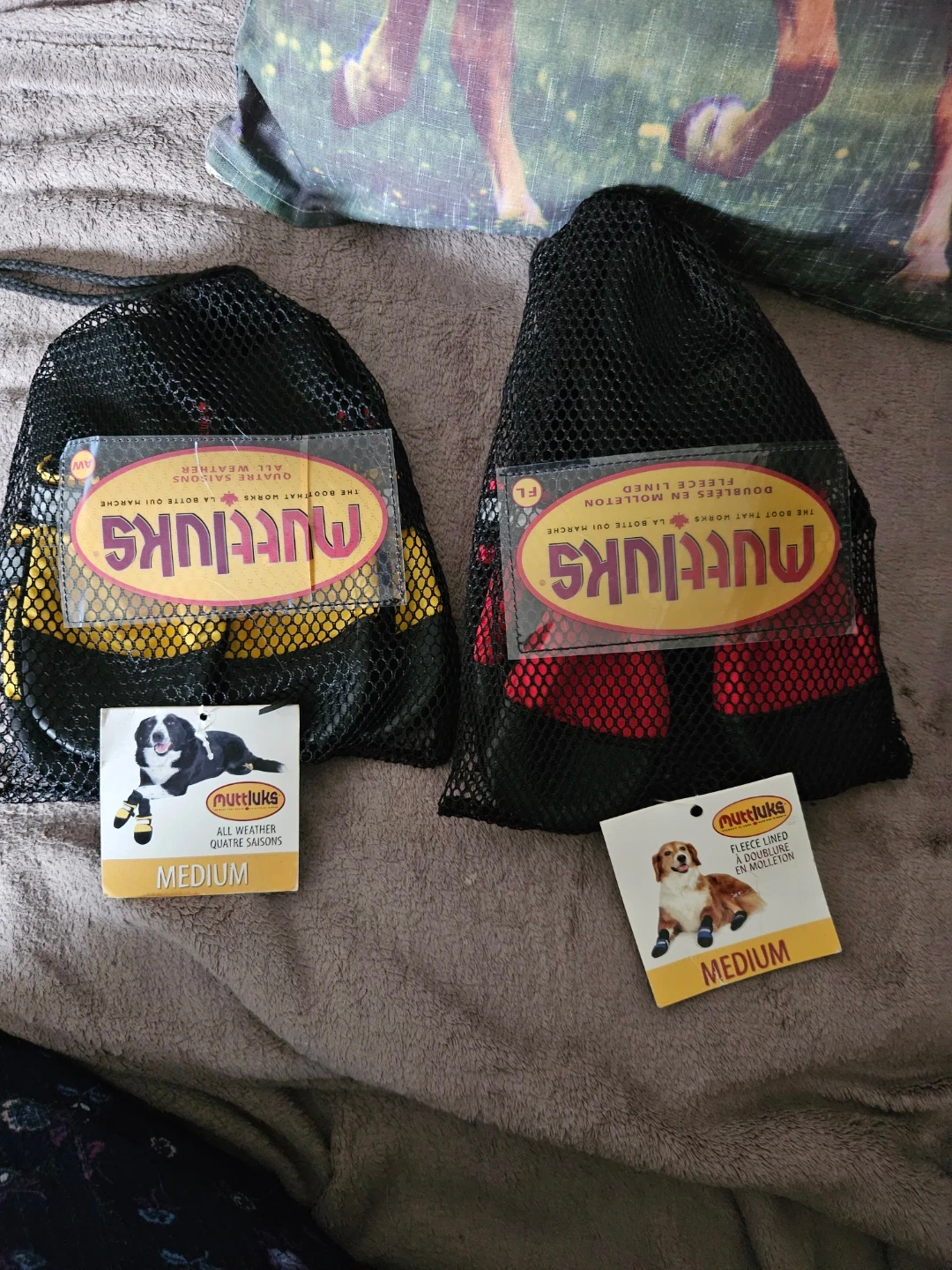 I have a 1 set of yellow Muttluks dog boots in size medium. One pair is all weather and one is fleece lined. Great for protecting your furry friends paws!