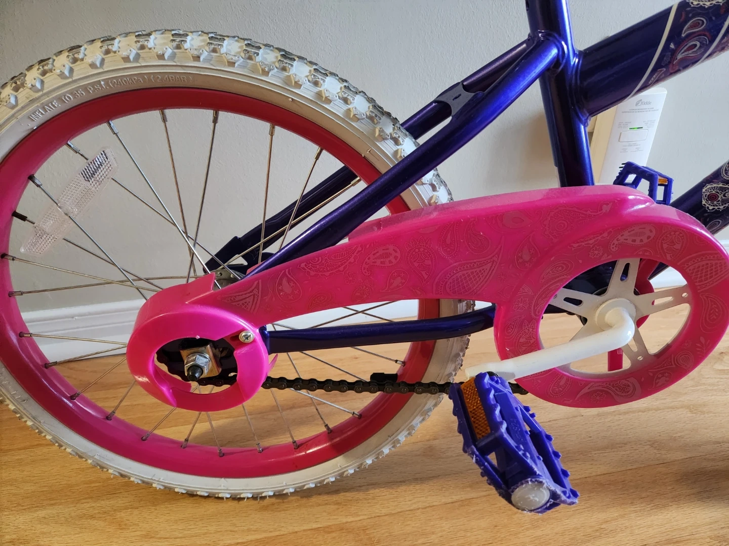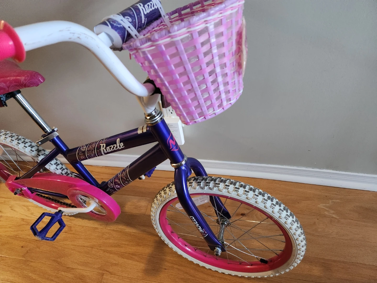 Selling a cute Razzle kids bike! It's in great shape and ready for a new rider. Features a fun purple and pink colour scheme, a comfy patterned seat, and a basket for carrying treasures on your adventures