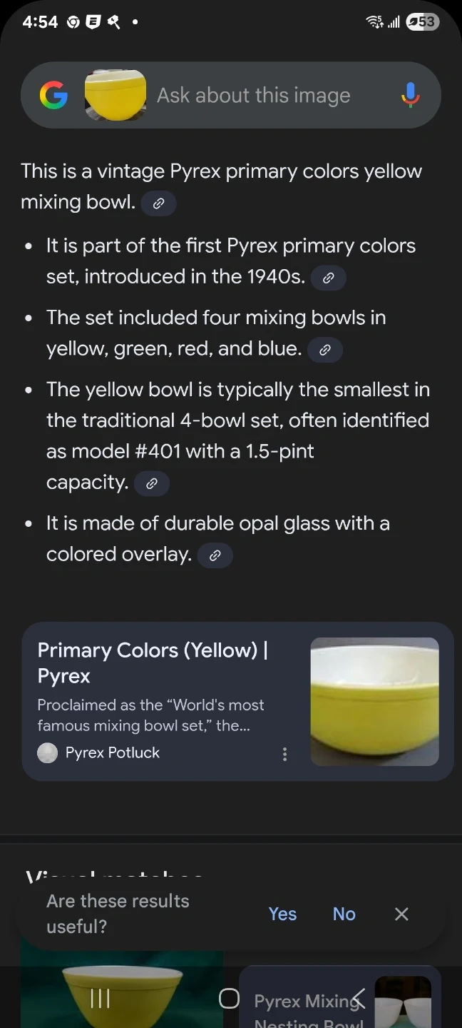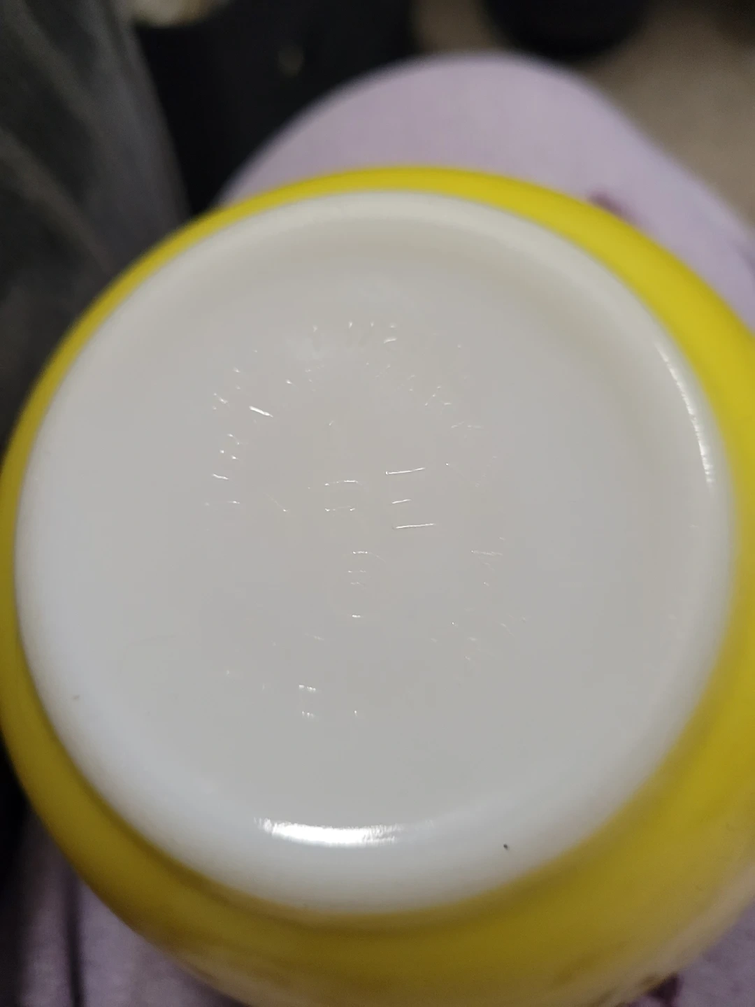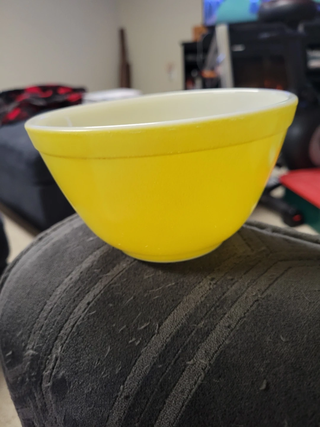 Selling a vintage Pyrex mixing bowl in a cheerful yellow! It's part of the primary colours set from the 1940s. This yellow bowl is the smallest in the traditional 4-bowl set, identified as model #401 with a 1.5-pint capacity. It's made of durable opal glass Pick up lower Stoney Creek