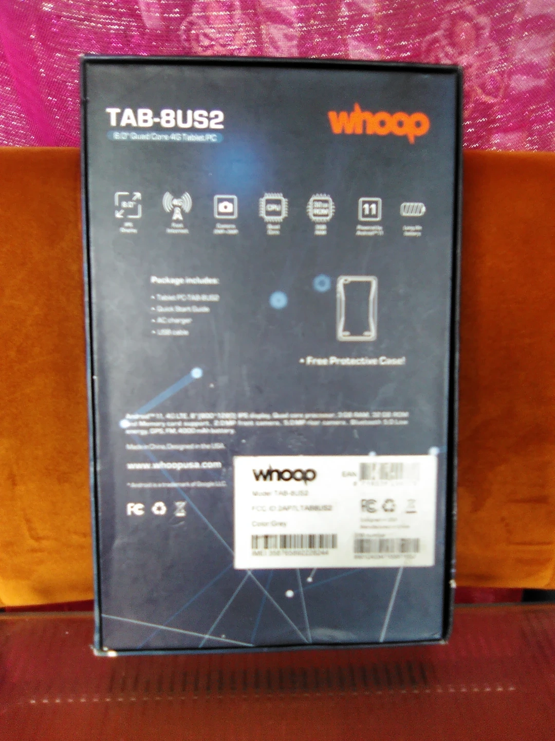 Selling a Whoop TAB-8US2 8" Quad Core 4G Tablet PC. It comes with the box and includes the tablet PC, AC charger, and USB cable. It also includes a free protective case!