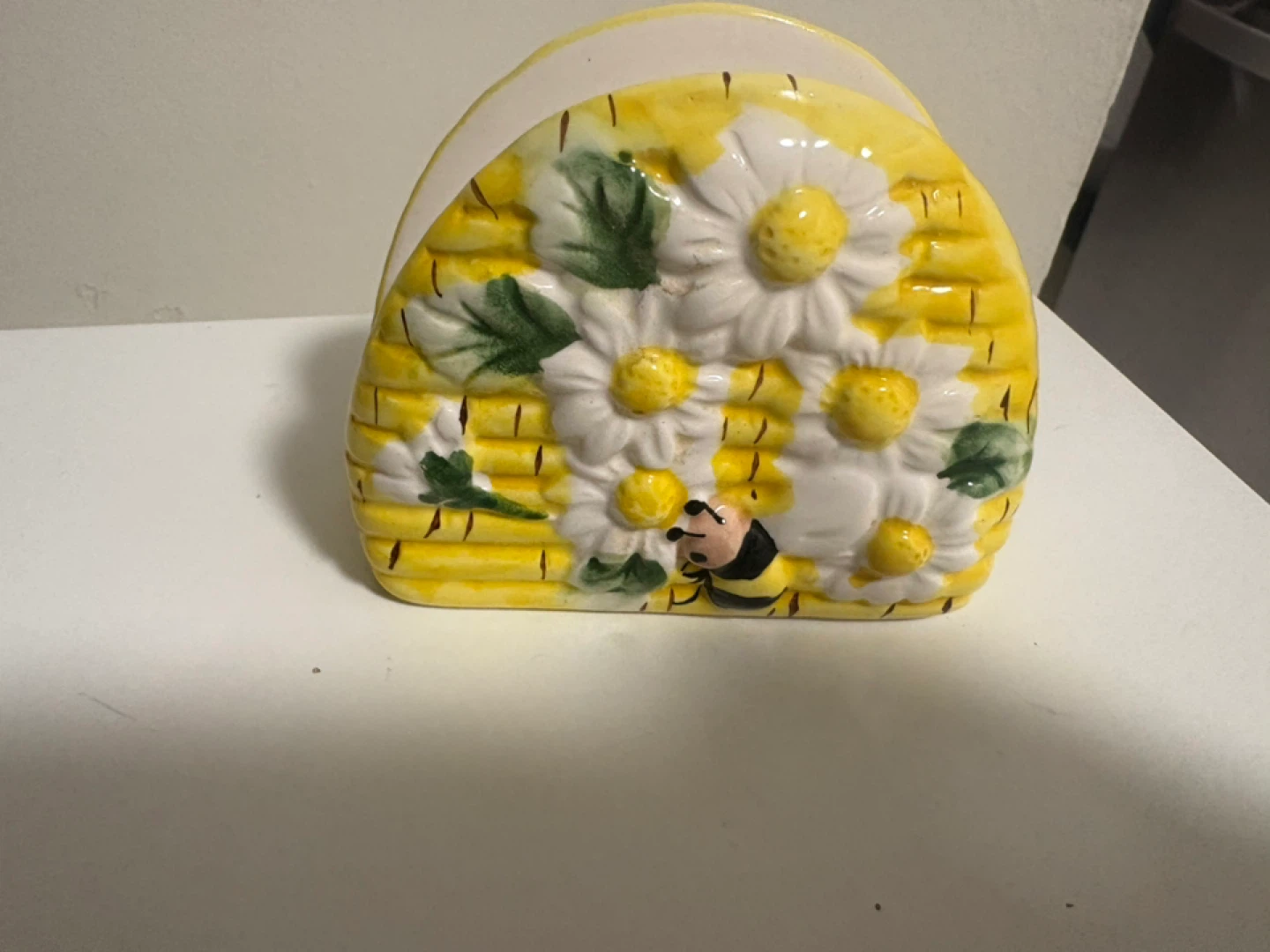 This adorable napkin holder is shaped like a beehive and decorated with daisies and a little bee! It's perfect for adding a touch of whimsy to your kitchen or dining table. The colours are yellow, white, and green. It's in great condition and ready to brighten up your home