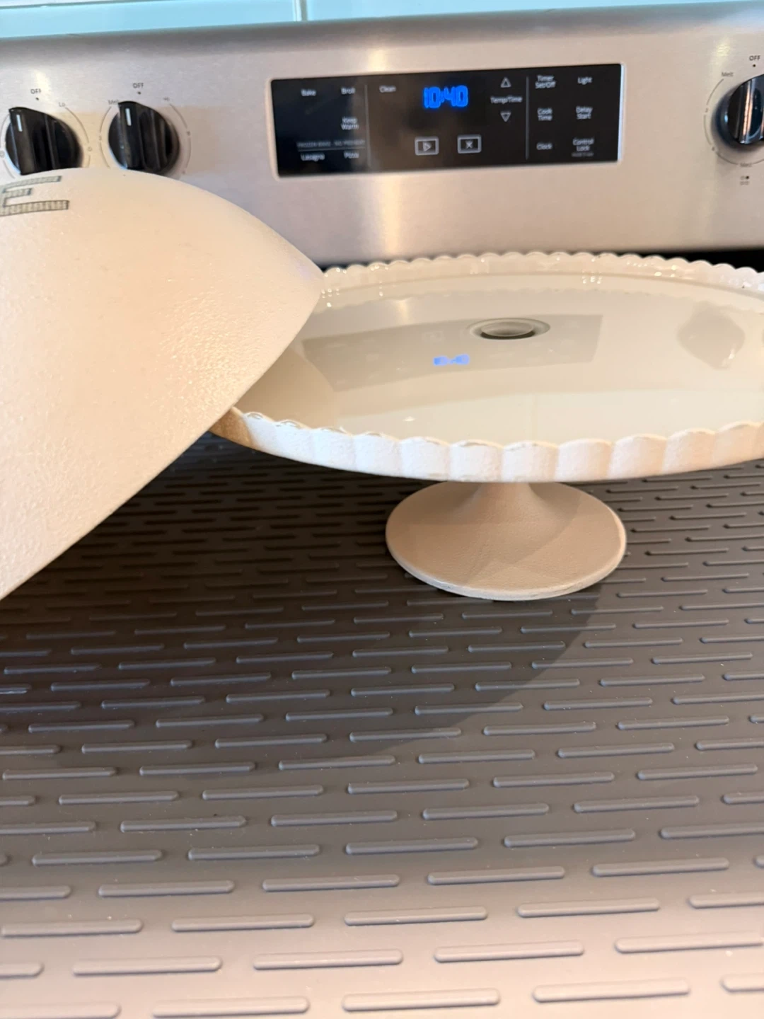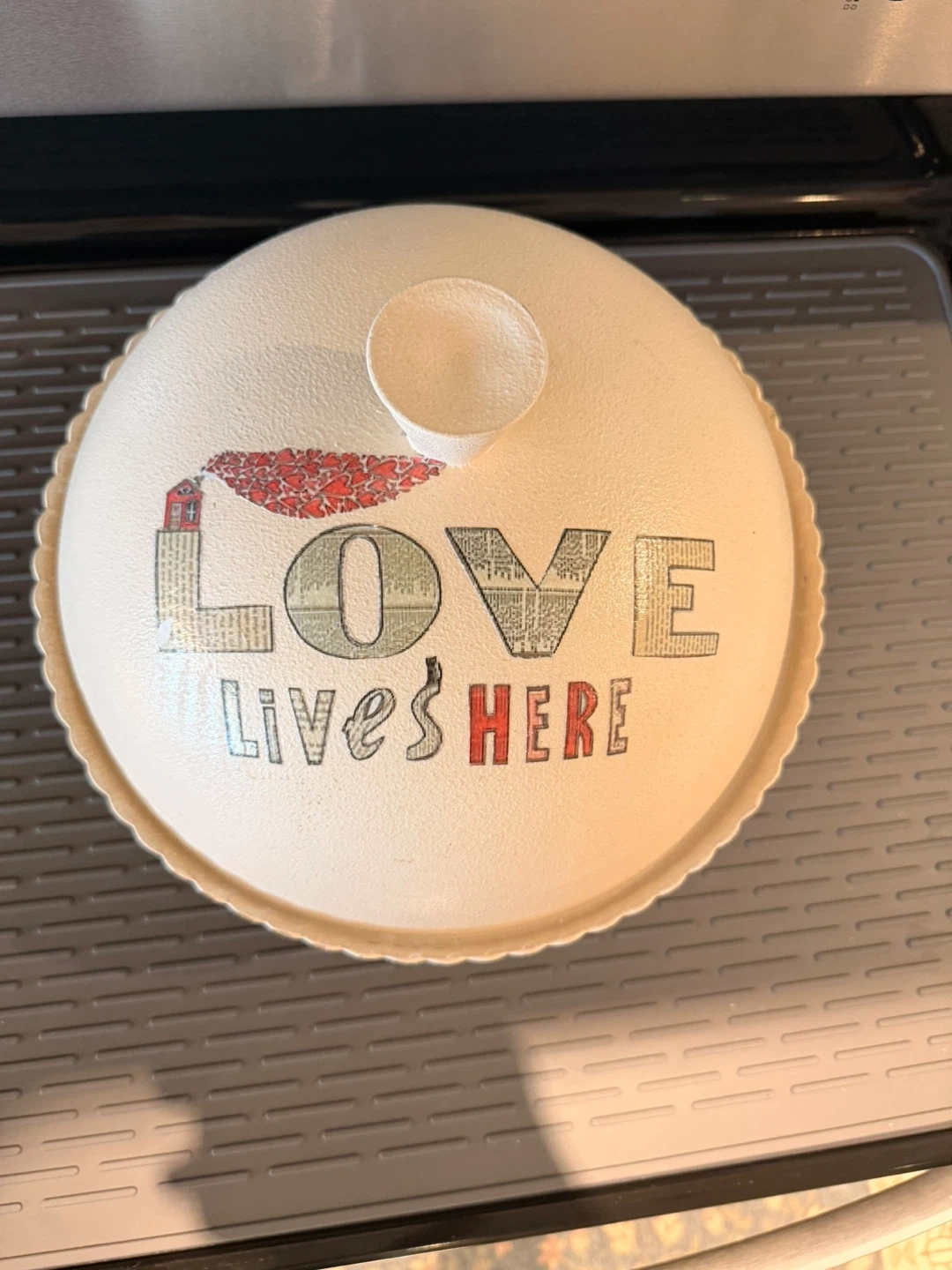 Selling a hand made cute cake stand with a lid! It has a sweet design that says 'Love Lives Here'. Perfect for displaying your baked goods or desserts!