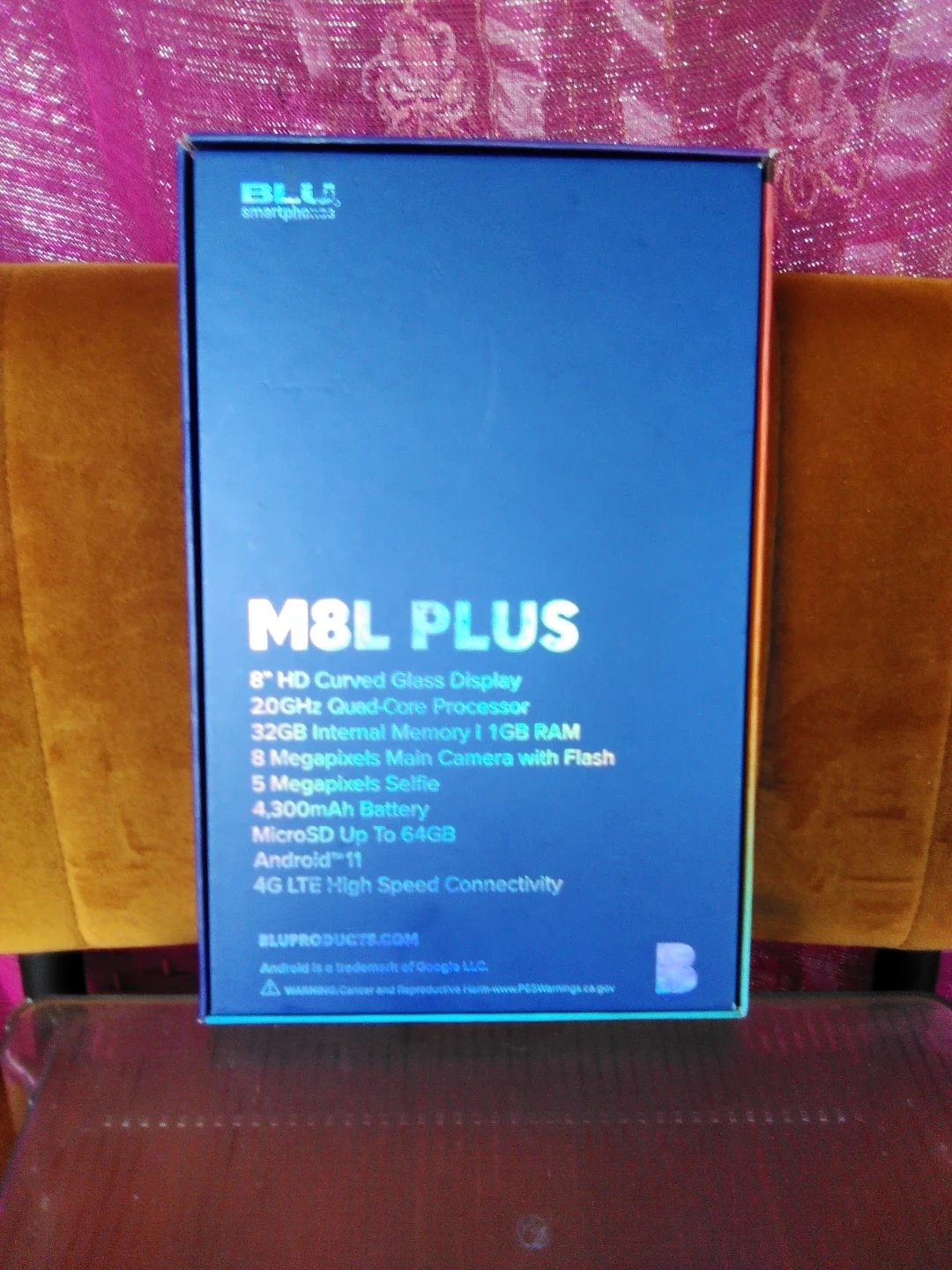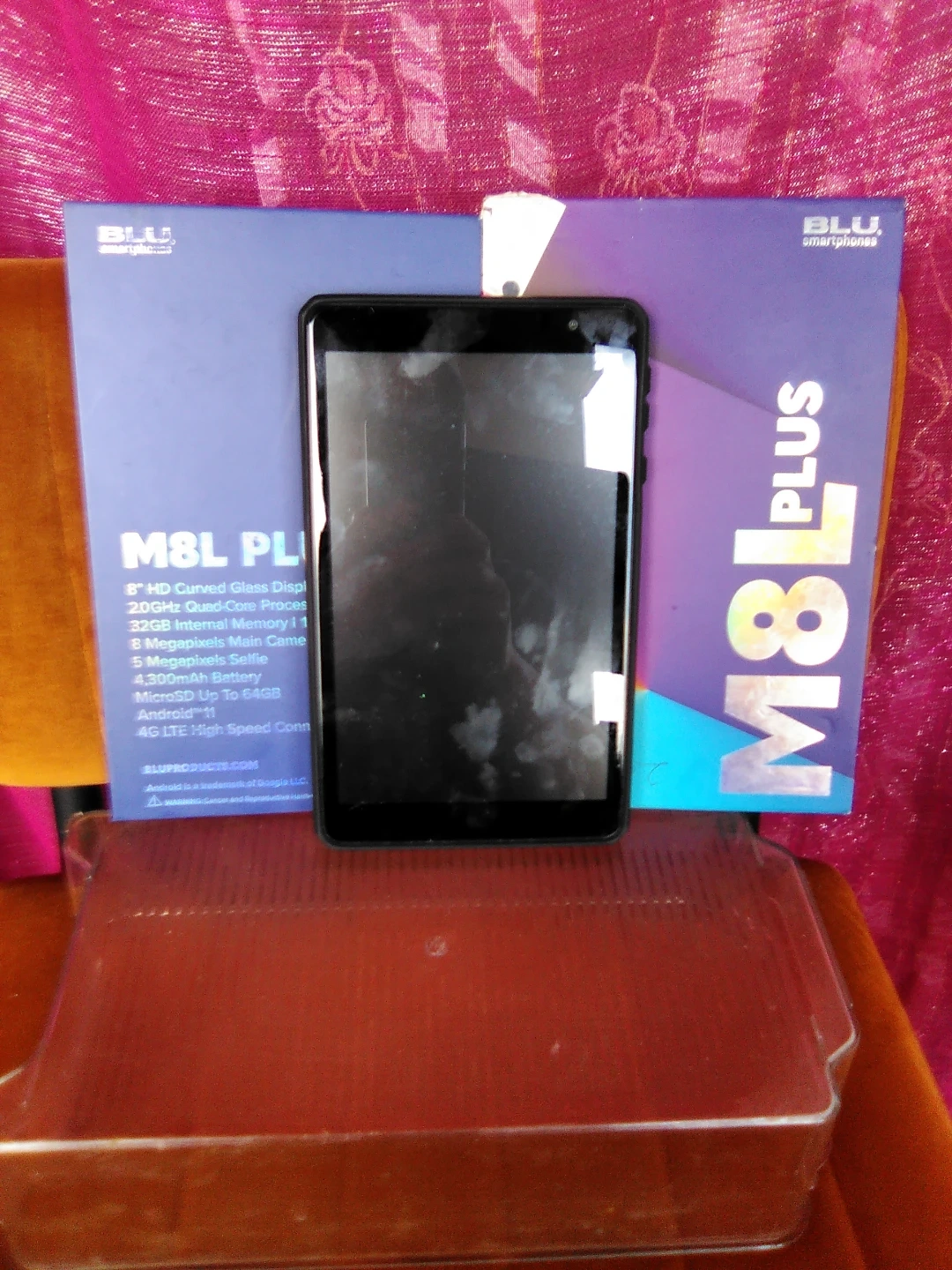 Selling a BLU M8L Plus smartphone. It features an 8" HD curved glass display, 2.0GHz quad-core processor, 32GB internal memory with 1GB RAM, 5-megapixel main camera with flash, and a 5-megapixel selfie camera. It also has a 4,300mAh battery and supports MicroSD up to 64GB. The phone runs on Android 11 and has 4G LTE high-speed connectivity. Comes with the original box