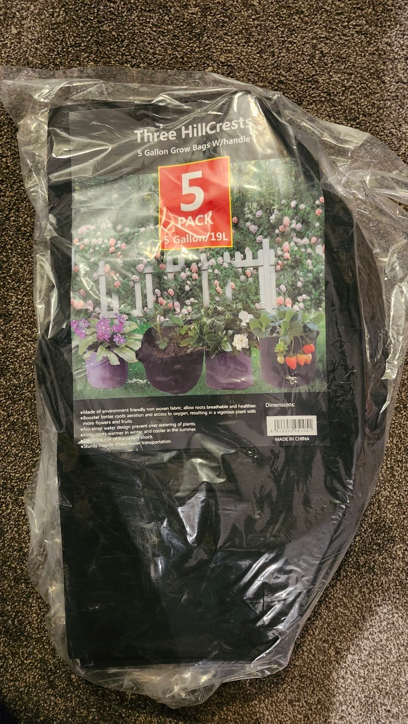 Selling a pack of 5 Three HillCrests 5-gallon grow bags with handles! These are made of environment-friendly non-woven fabric, allowing roots to breathe and stay healthier. They also help boost root aeration and access to oxygen, resulting in vigorous plant growth with more flowers and fruits. The no-strap water design prevents overwatering, and they keep roots warmer in winter and cooler in the summer. Sturdy handles make transportation easier