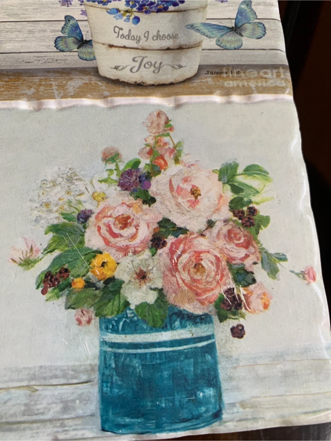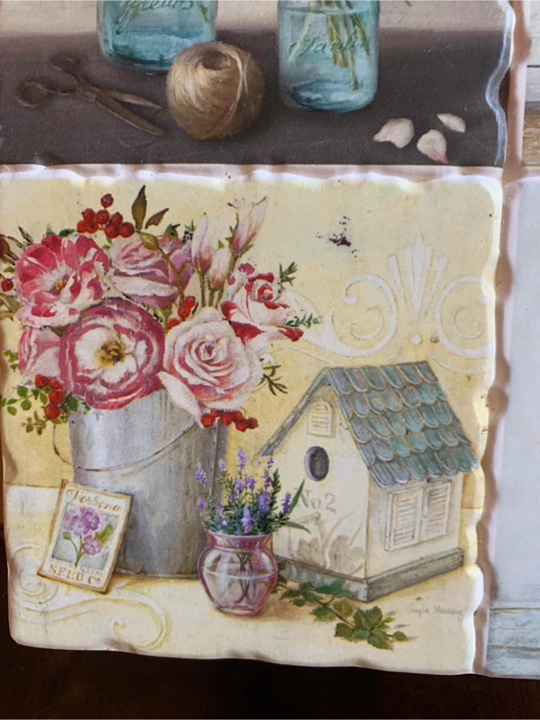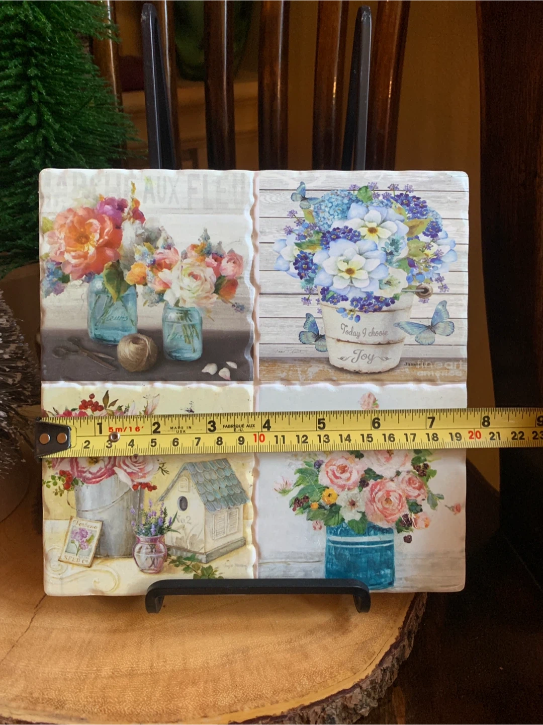 Here's a lovely garden ceramic trivet featuring a floral design! It's a 8” square tile with a beautiful arrangement of flowers in mason jars and buckets. The back is a cork material for heat resistance and table protection. Besides using it for a trivet, you could hang it on a wall or display it with a plate stand. A sweet piece for your kitchen!