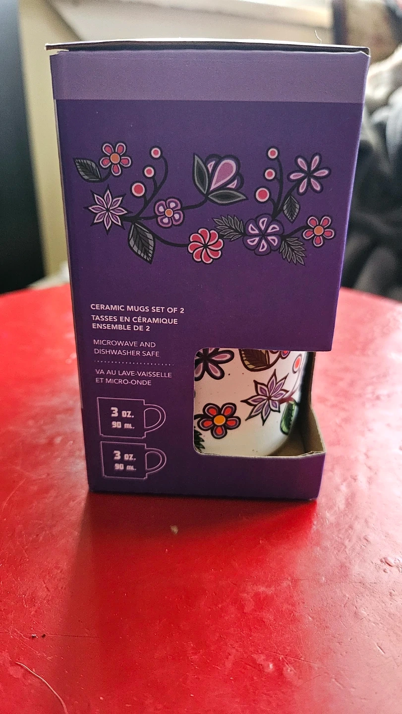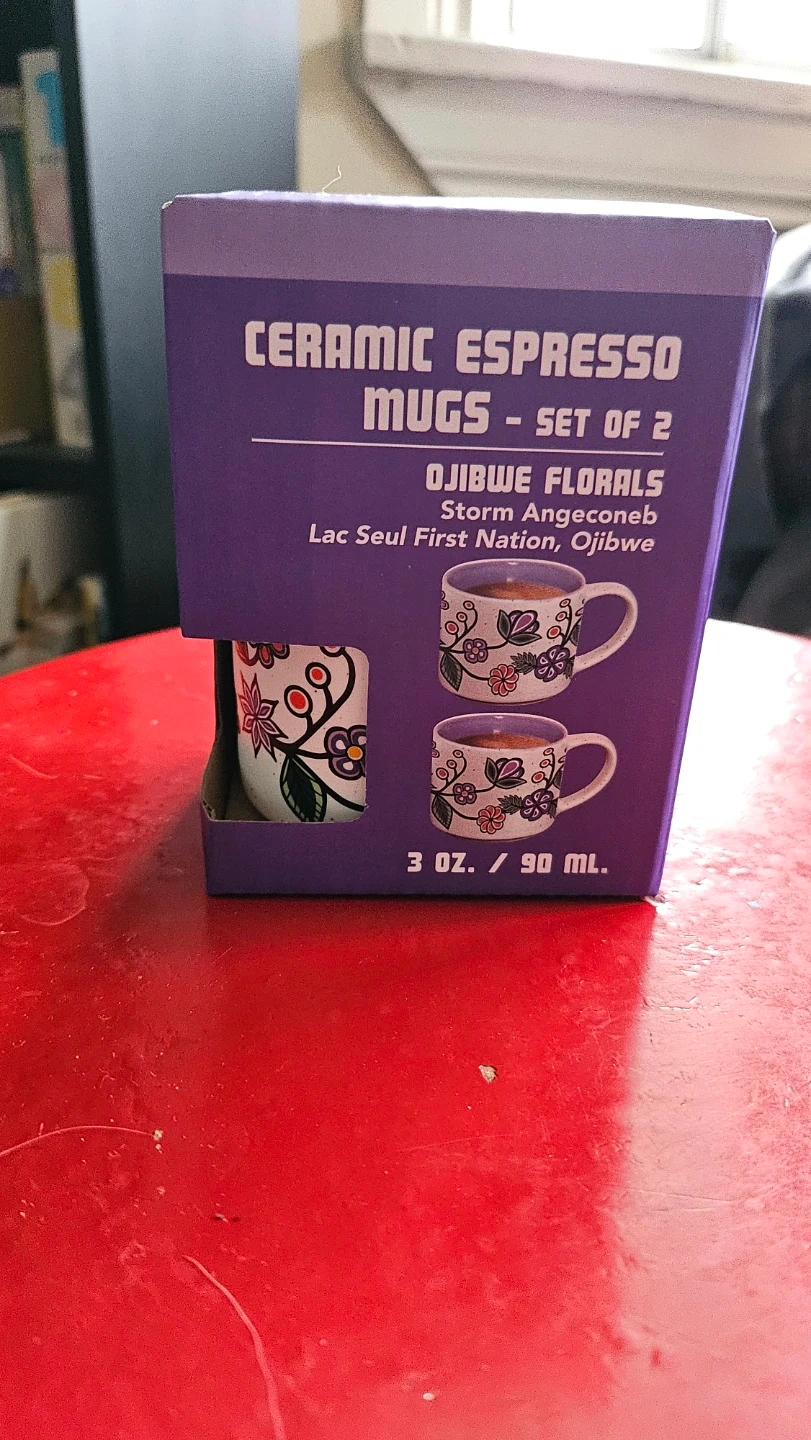 MAKE OFFER!!! Selling a set of two ceramic espresso mugs from Native Northwest! They feature Ojibwe florals by Storm Angeconeb of Lac Seul First Nation. These 3 oz mugs are great for espresso and other beverages and are microwave and dishwasher safe. Brand new in the box. Never opened.
