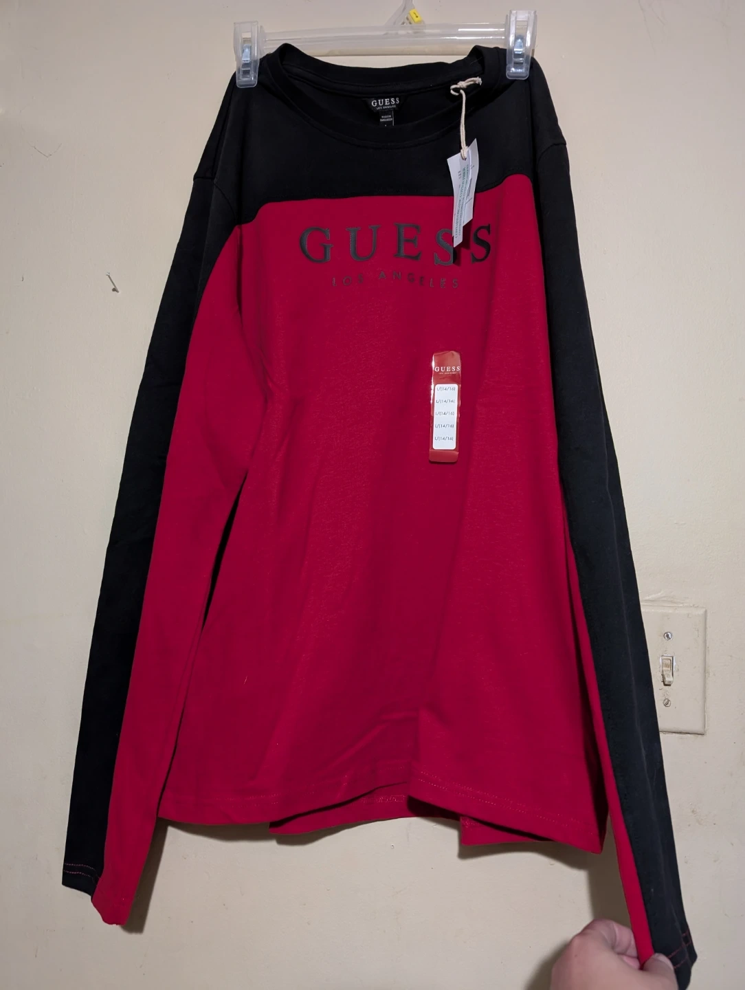 This is a brand new Guess Varsity Red A565 top in size L! The tag shows it was originally $49.99. It's a stylish long-sleeved shirt with a black and red color. $ 15 firm and pick up in Niagara falls