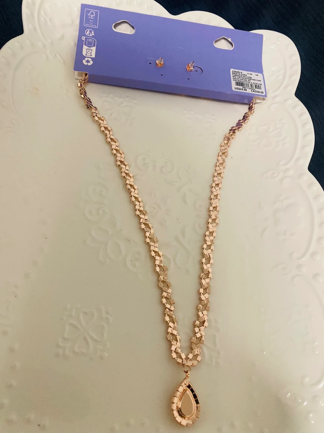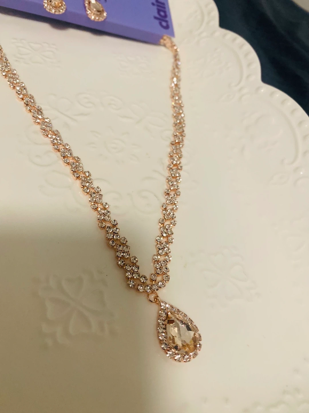 Selling a brand new Claire's necklace and earring set! The set features a beautiful rose gold colour and teardrop design. Perfect for adding a touch of sparkle to any outfit.