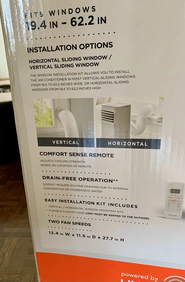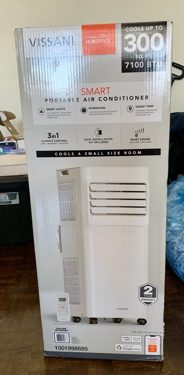 Keep cool this summer with this Vissani Smart Portable Air Conditioner, perfect for rooms up to 300 sq. ft. and boasting 7100 BTU. This unit is new, never been taken out of the box, and comes complete with an easy installation kit suitable for windows from 19.4 to 62.2 inches. Here are some features: * Cools up to 300 sq. ft. * 7100 BTU * Smart alerts and scheduling features * 3-in-1 climate control: cool, fan, and dehumidify * Easy installation kit included * Two fan speeds * Dimensions: 12.4 in W x 11.5 in D x 27.7 in H This unit is looking for a new home, and if you're reading this, it's still available! Don't miss out on staying cool.