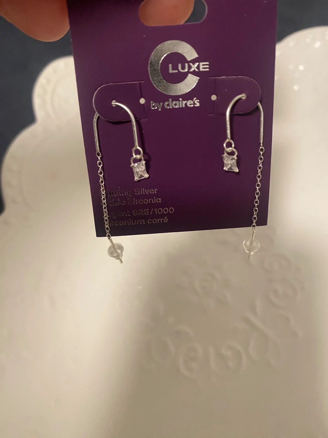 Selling a pair of Claire's Luxe earrings. They are 925 stamped sterling silver with cubic zirconia accents and feature a delicate chain detail. Perfect for adding a touch of sparkle to any outfit!