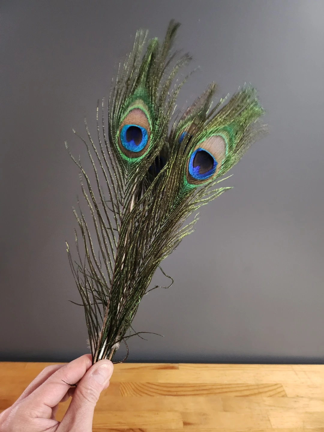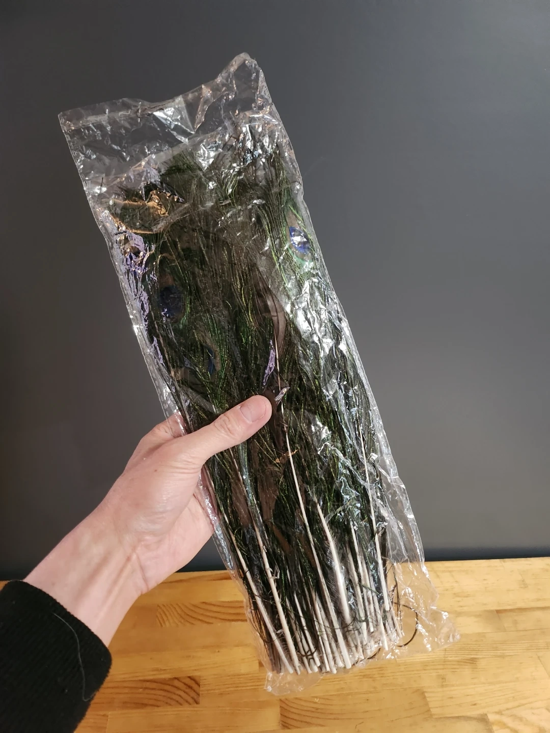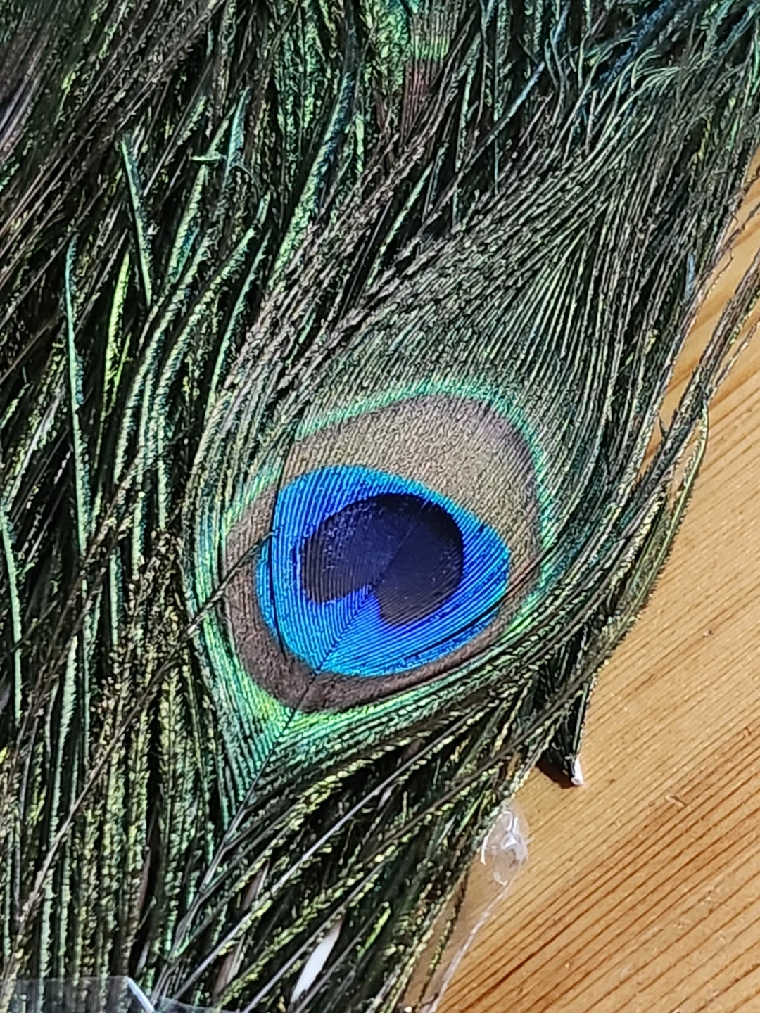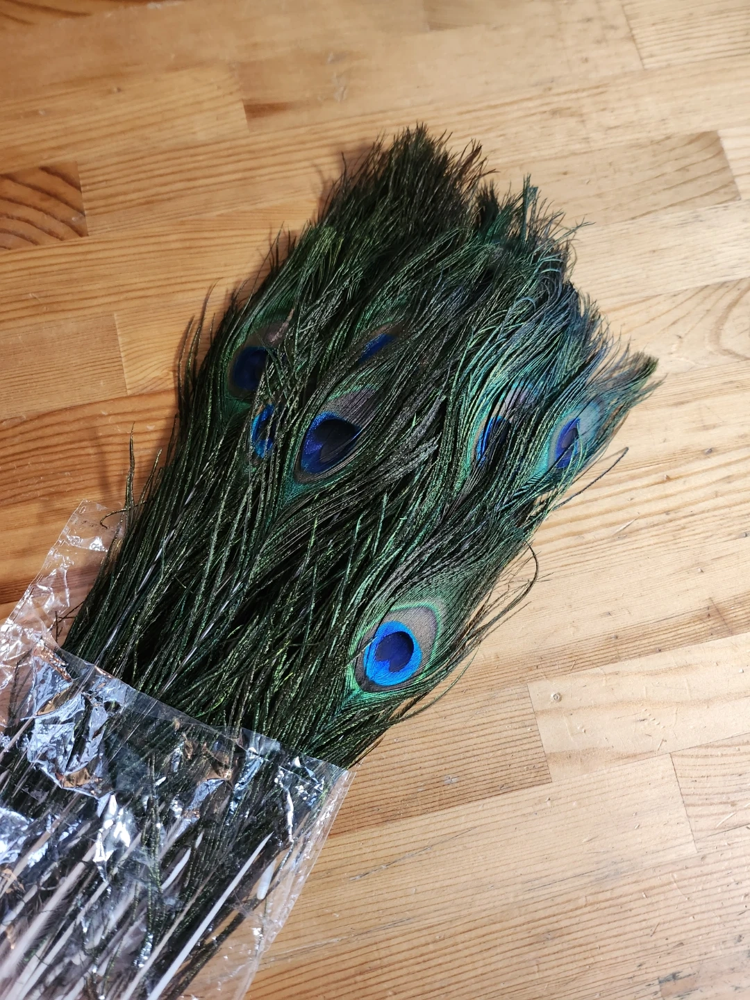 Bunch of decorative peacock feathers! They have beautiful iridescent colours and would be great for crafts, home decoration, or costumes.