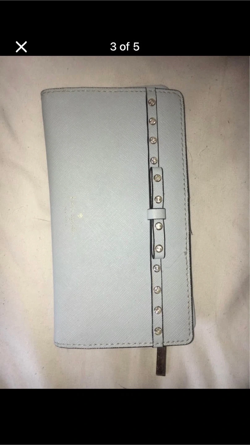 Selling a Kate Spade wallet in a light blue colour. It features a studded bow design on the front and a zipper on the back. It shows tiny signs of wear, but still has lots of life left!