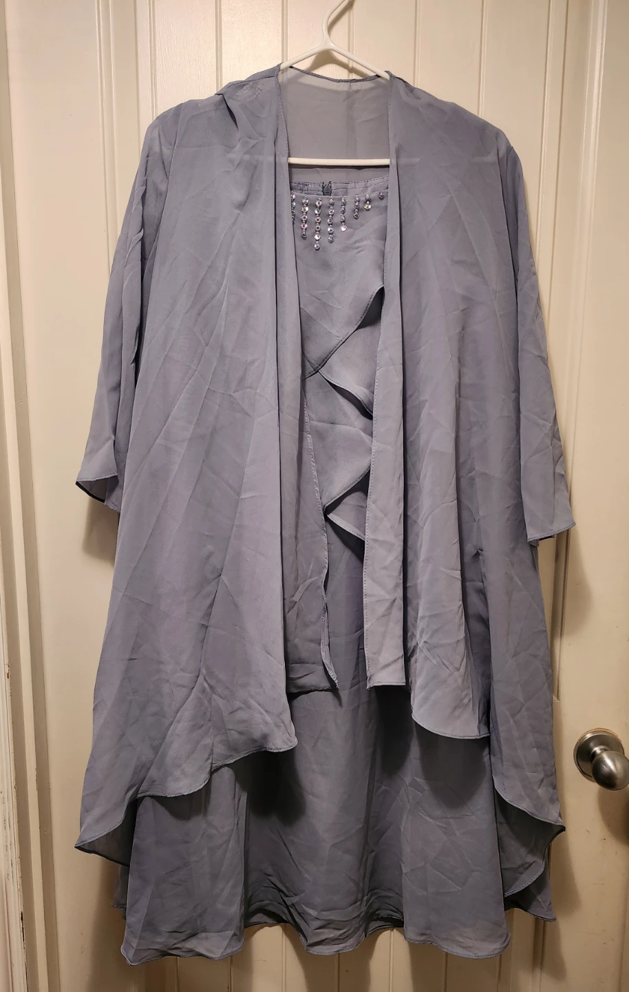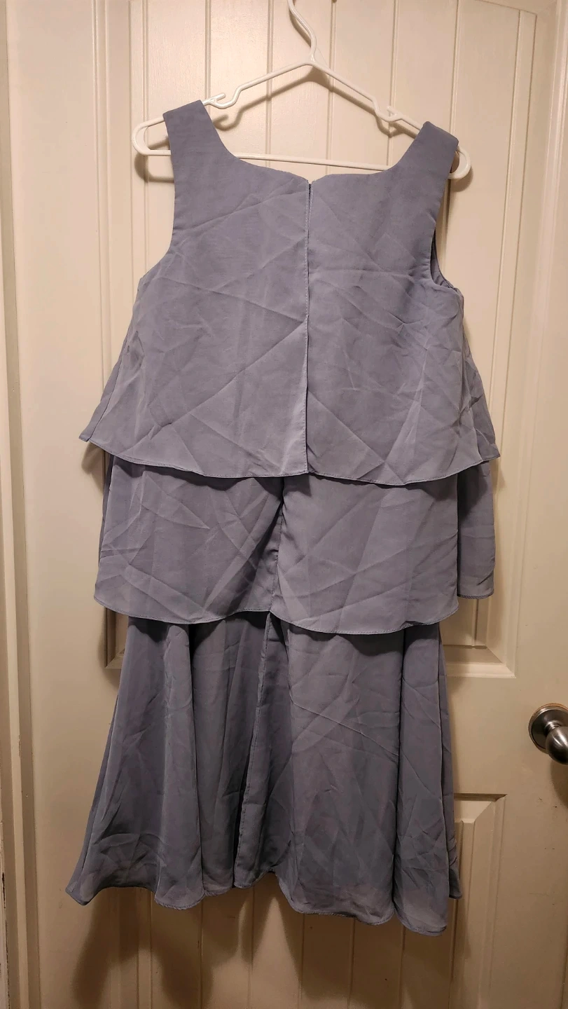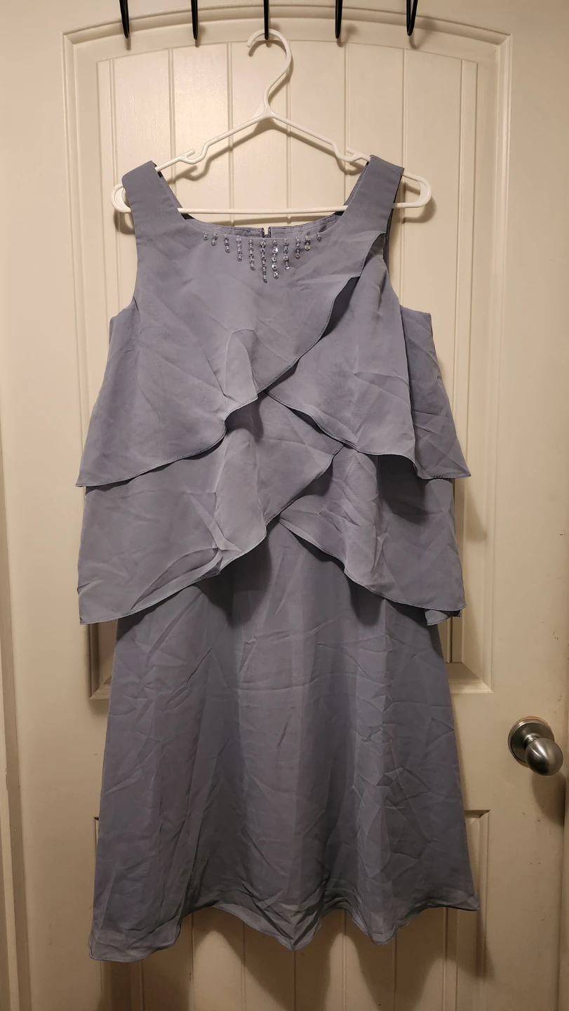 Selling a lovely blue tiered dress that comes with a matching shawl. It's in great condition and ready for a new occasion! The dress has a unique layered design that adds a touch of elegance. Size 8