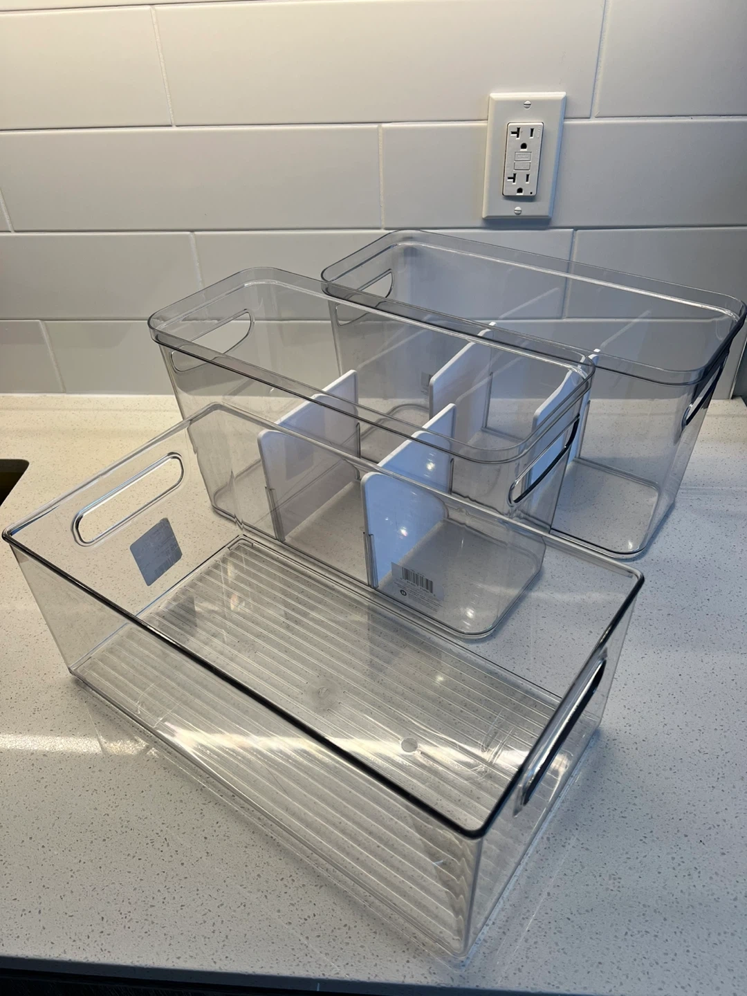 Selling a set of 3 high-quality clear organizer bins from HomeSense.