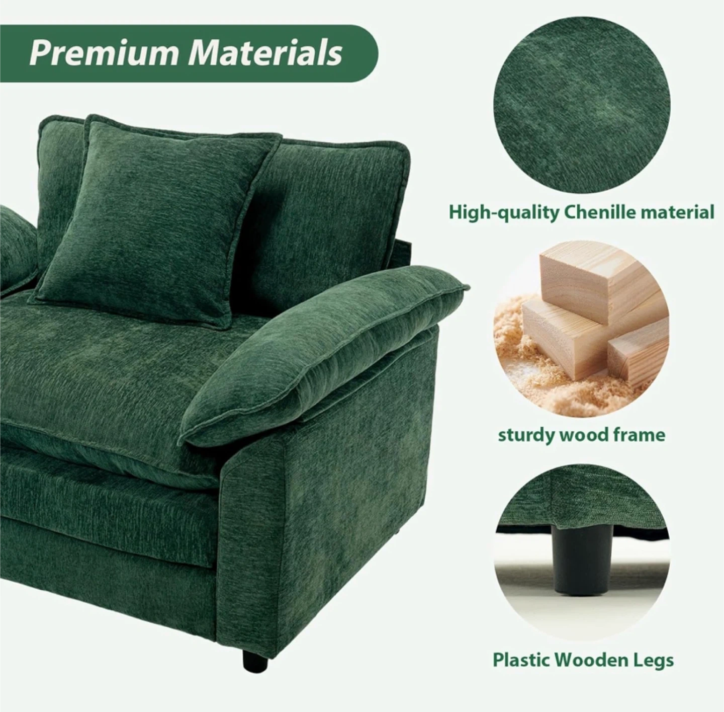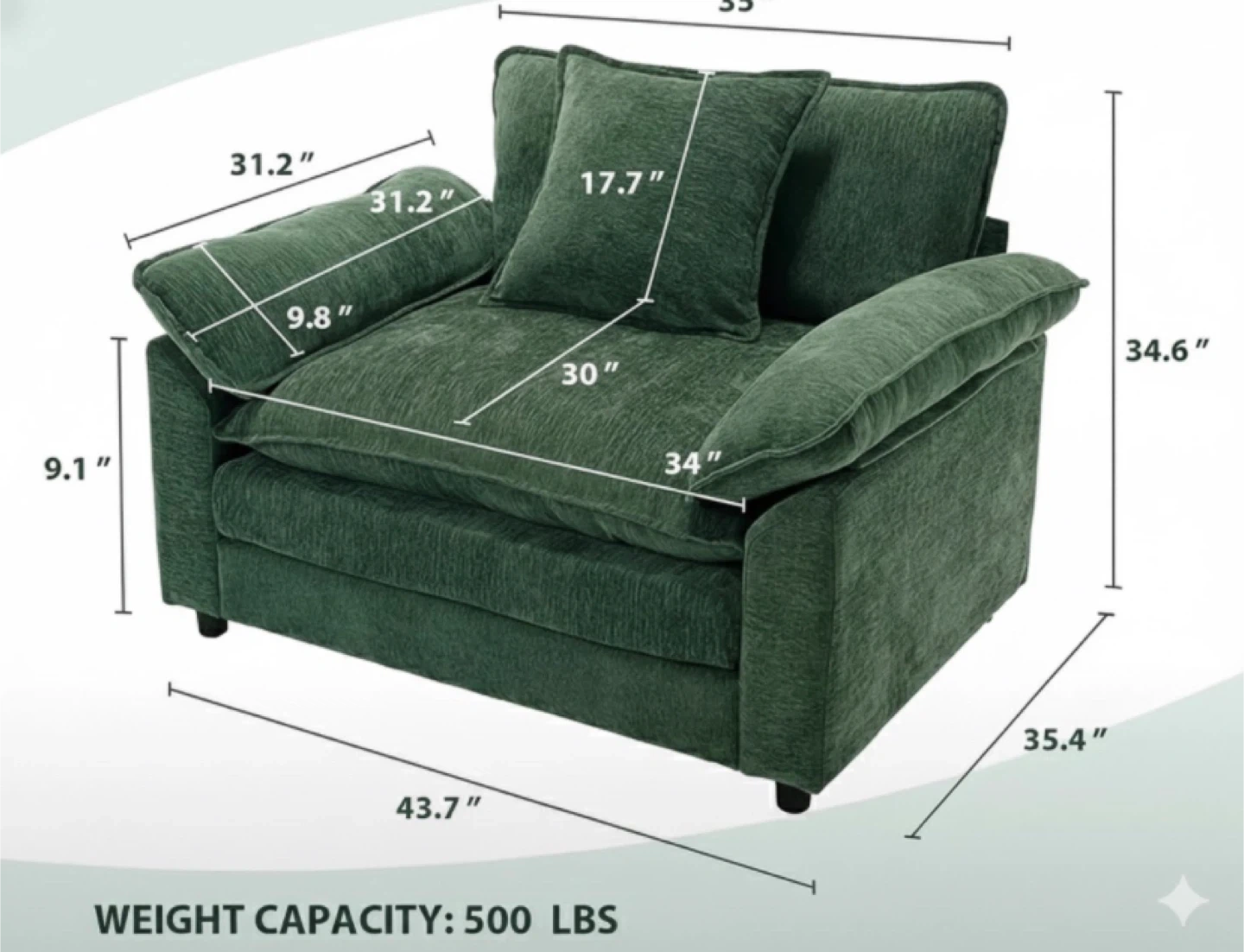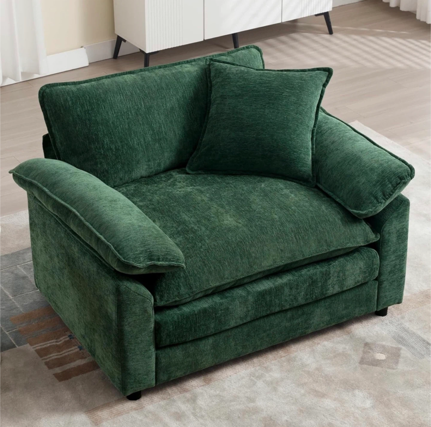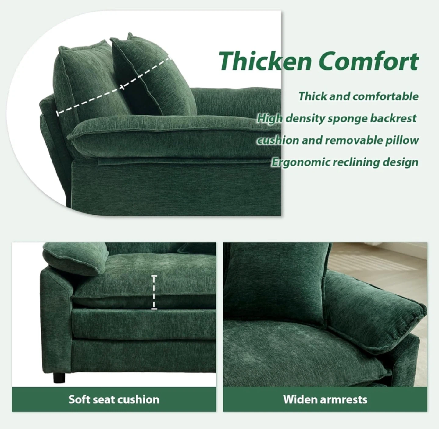 Selling a cozy green loveseat chair! It's made with high-quality chenille material and has a sturdy wood frame with plastic wooden legs. The chair features a high-density sponge backrest cushion and a removable pillow for extra comfort. The dimensions are approximately 43.7" x 35.4" x 34.6". It has a weight capacity of 500 lbs