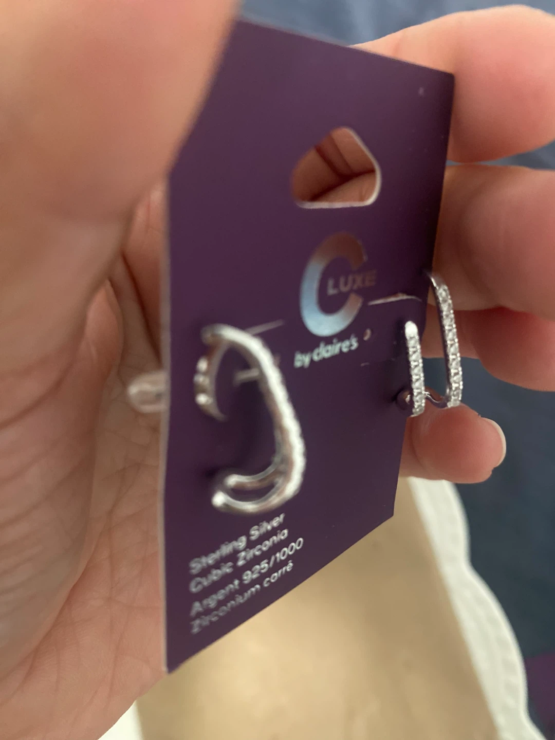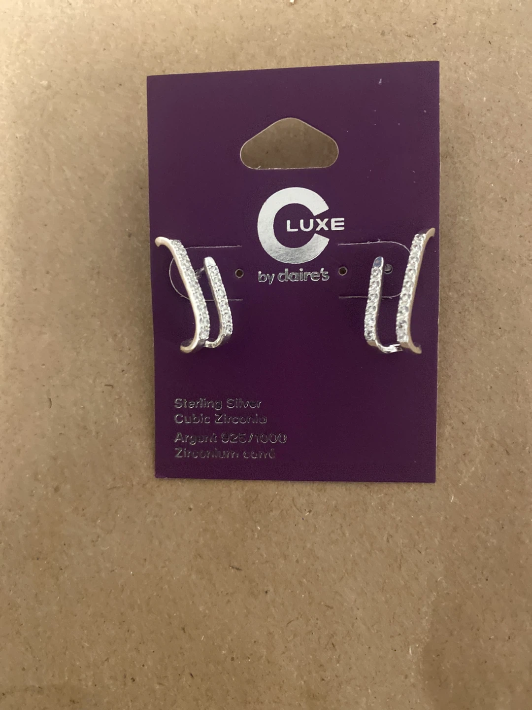Selling a pair of new Claire's Luxe earrings. They're sterling silver with cubic zirconia detailing. The earrings are new and still on the original packaging!