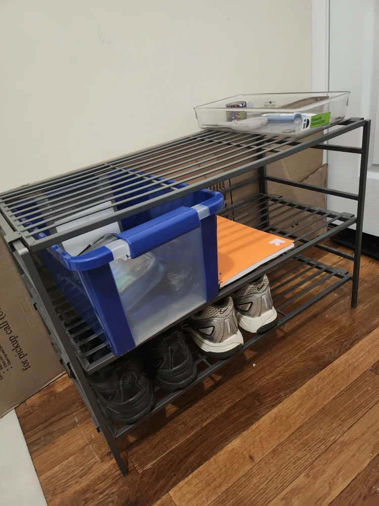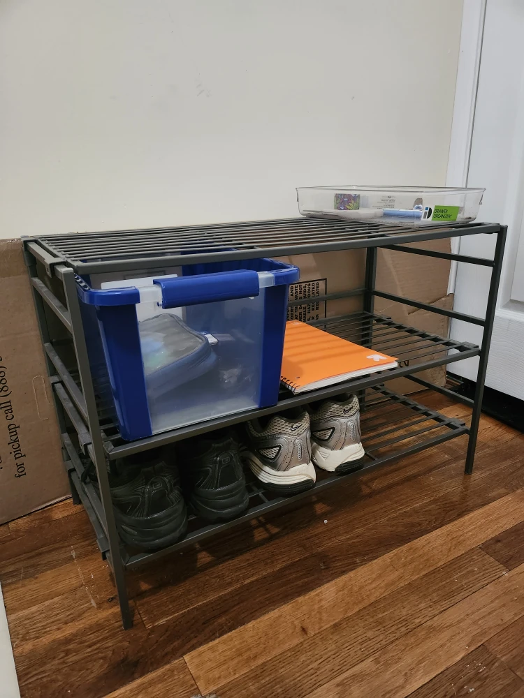 Selling a handy metal shoe rack with three tiers! It's perfect for keeping your entryway or closet organized. It's in great shape and ready to hold your shoes.
