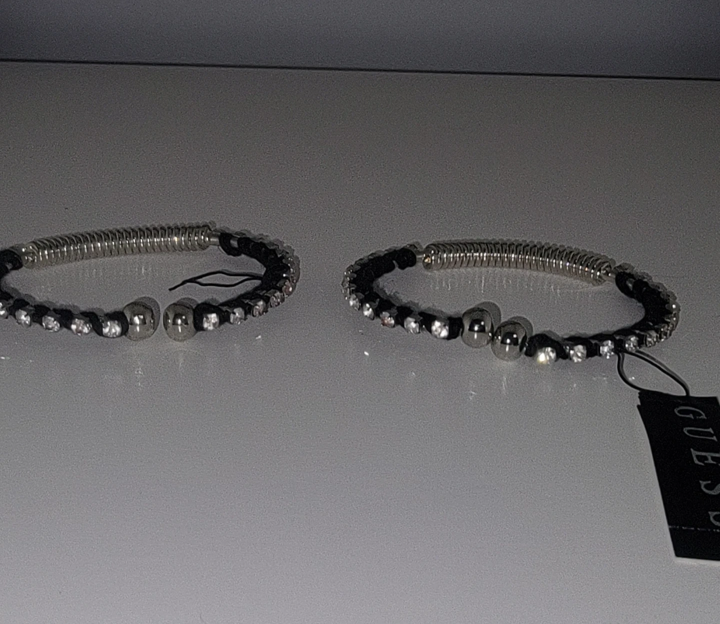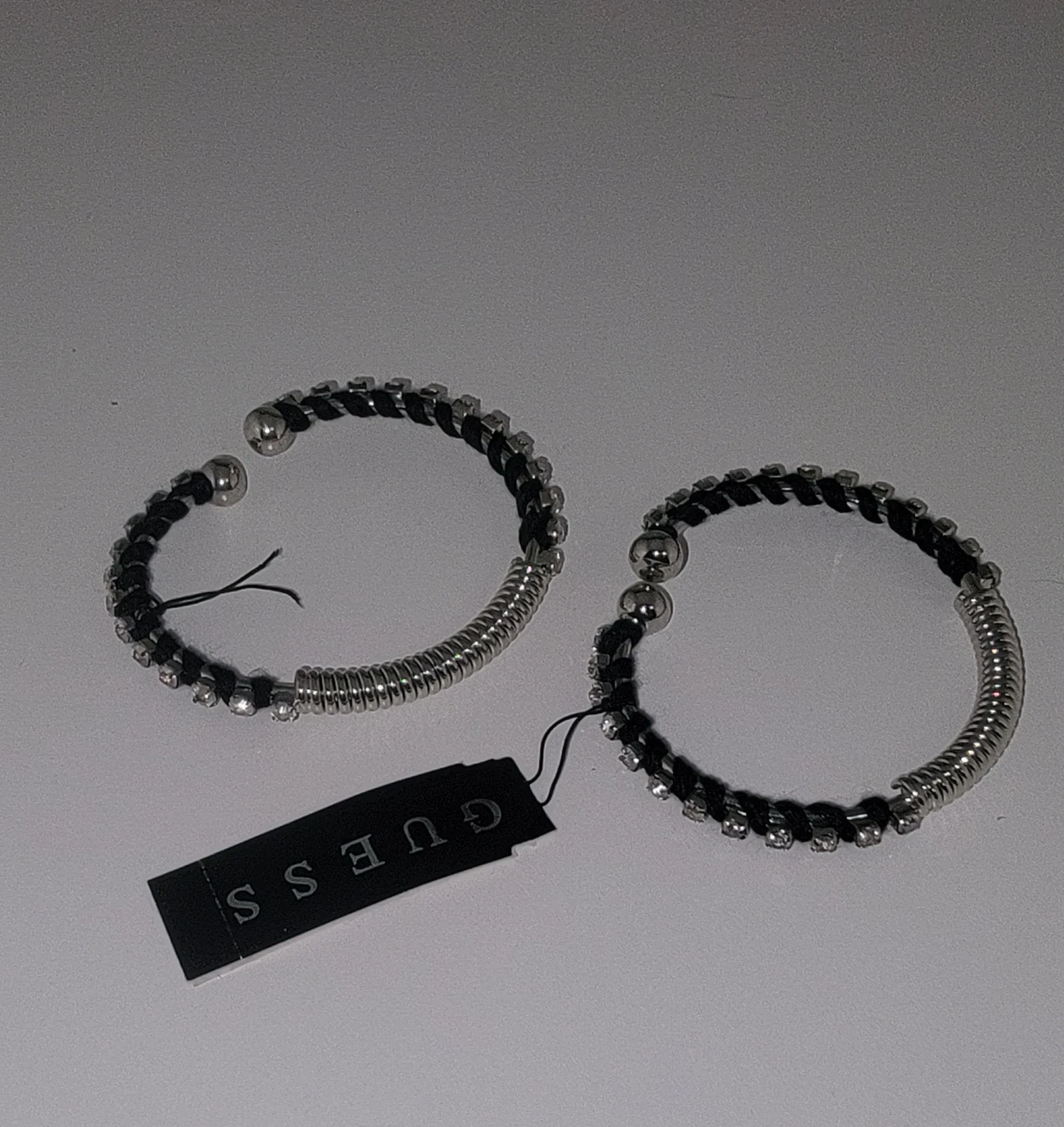 Selling a pair of Guess bangle bracelets, brand new with tags still attached! They feature a silver and black design with some sparkly details. Perfect for adding a little shine to your outfit