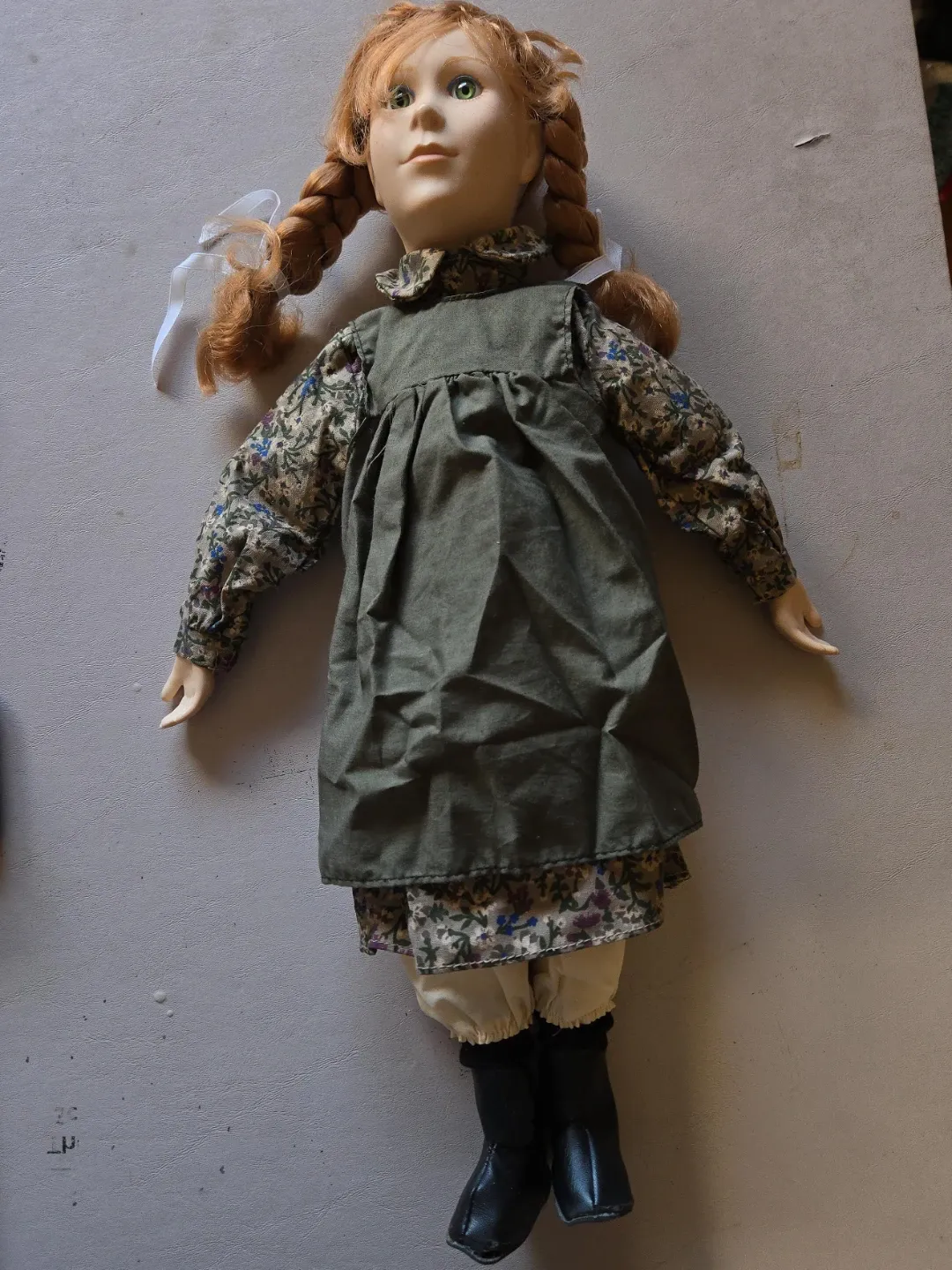 Selling a Anne of Green Gables porcelain doll with braided red hair. She has green eyes and is wearing a dress with a floral pattern and a green pinafore. Her outfit is completed with bloomers and black boots. She would make a lovely addition to any doll collection