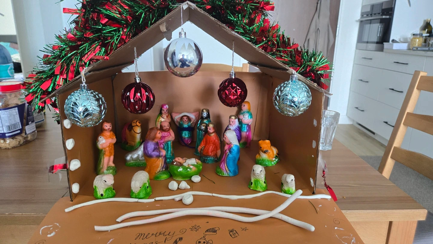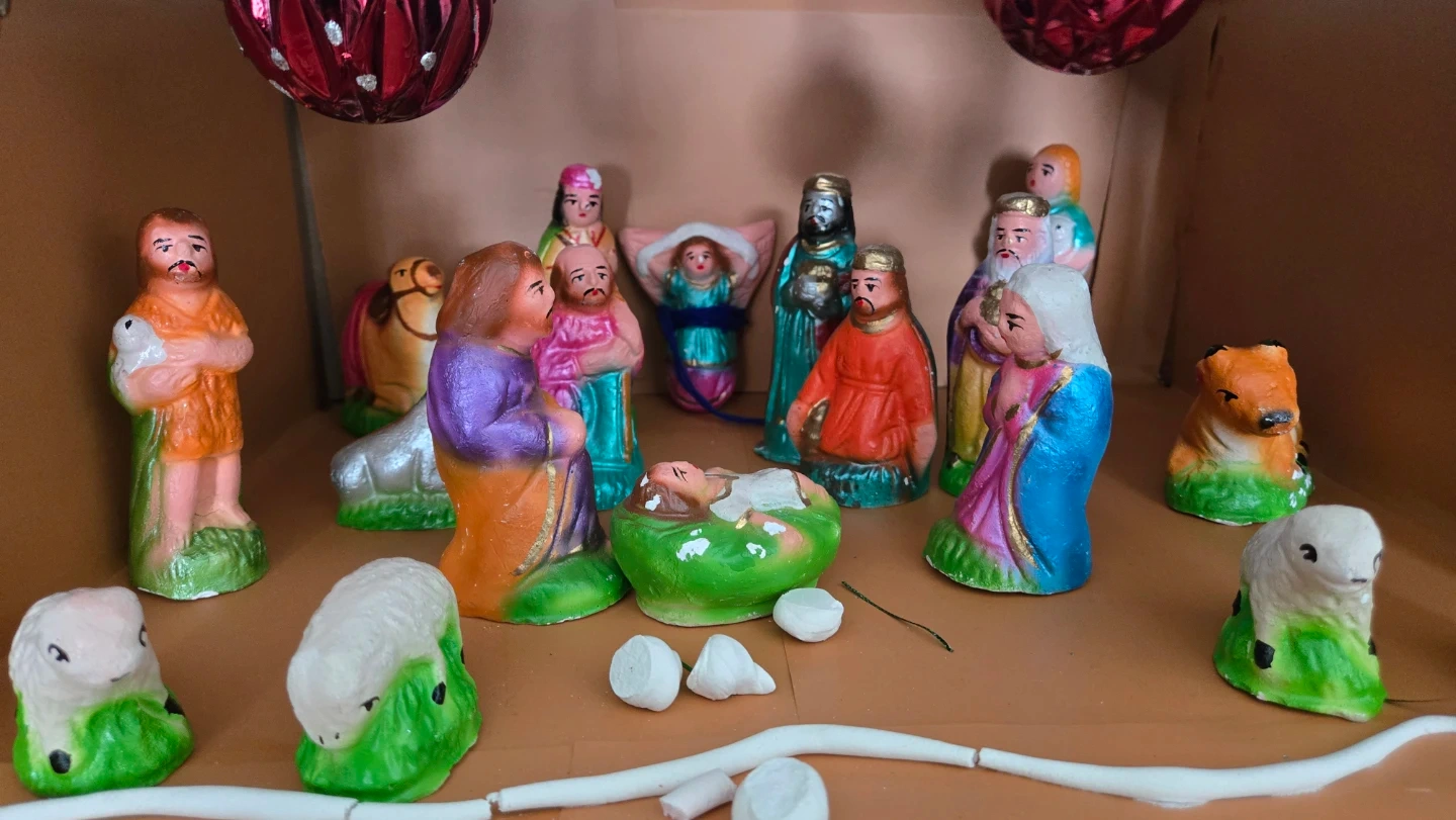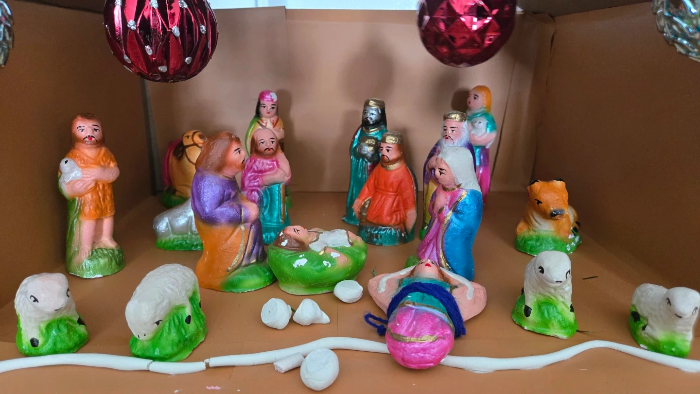A beautiful, nativity scene perfect for the holidays! This unique piece will add a touch of warmth and charm to your home during the Christmas season. The figures are carefully crafted and painted, creating a lovely display.