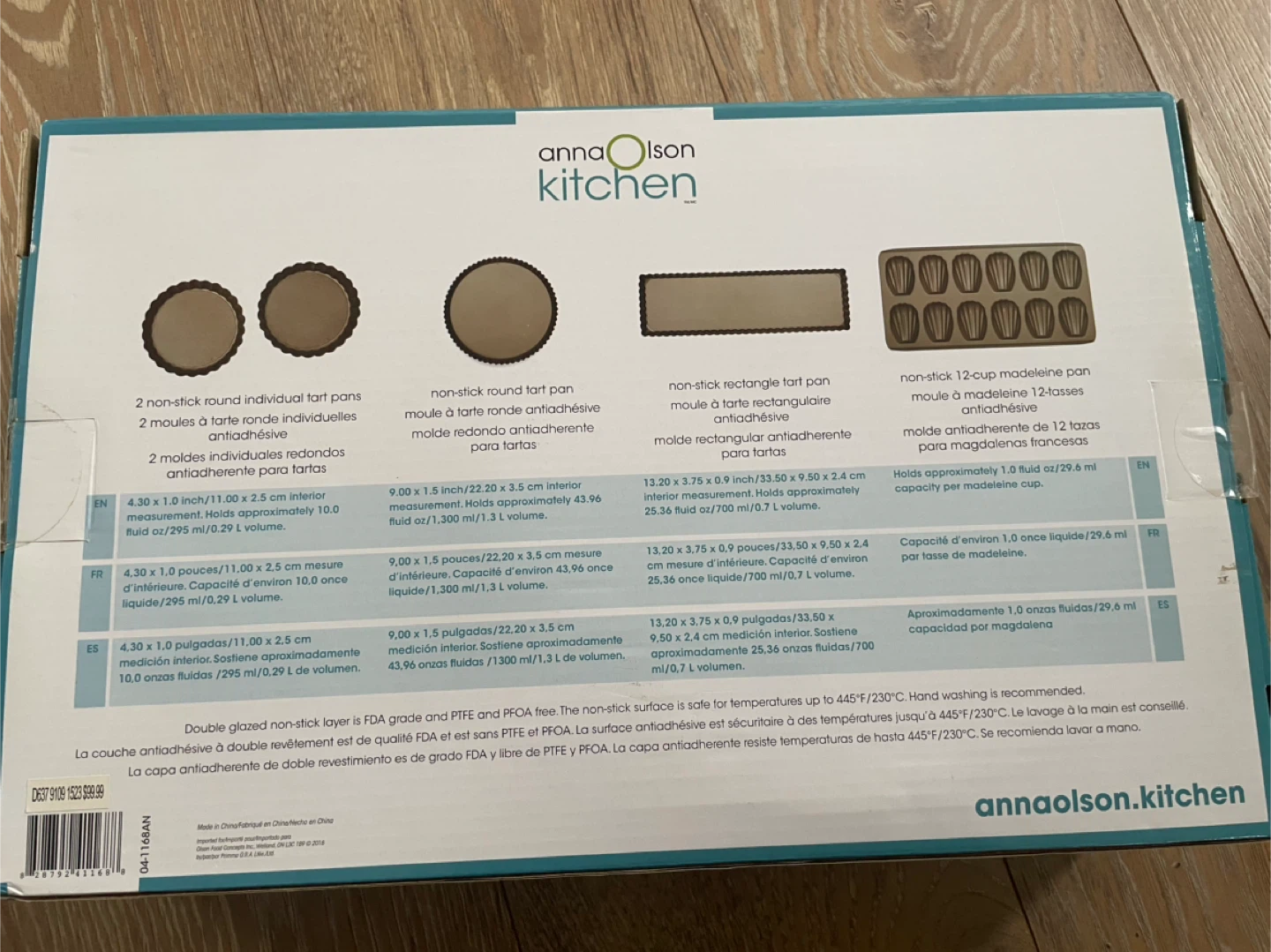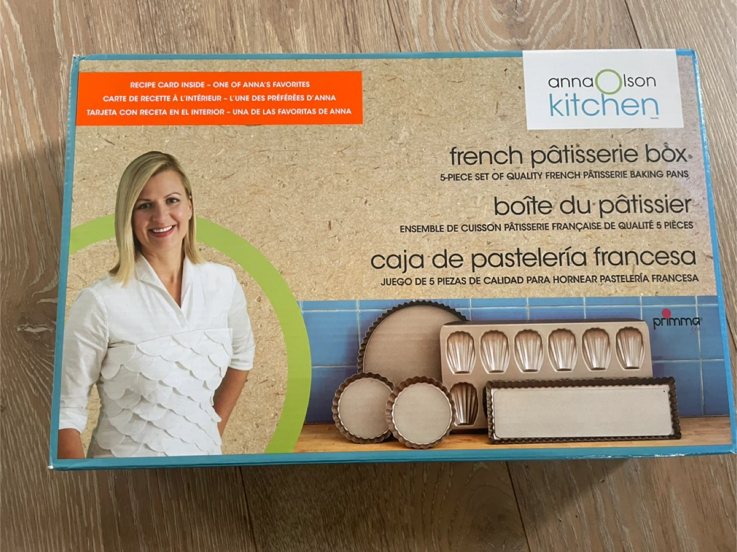 Selling a brand new Anna Olson Kitchen French Pâtisserie Box! This 5-piece set of quality French baking pans is perfect for making delicious treats. The set includes two round individual tart pans, a round tart pan, a rectangular tart pan, and a 12-cup madeleine pan. Recipe card included!