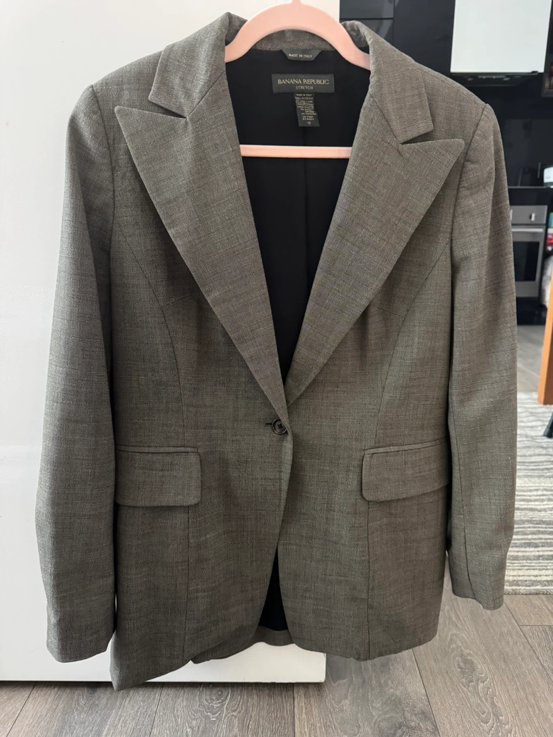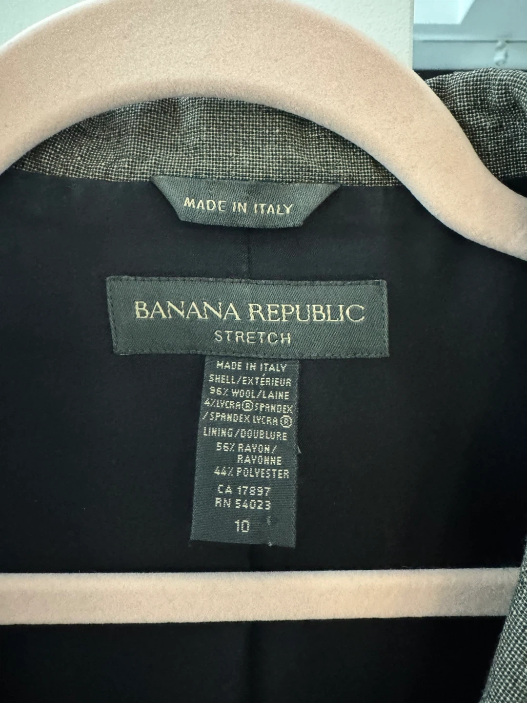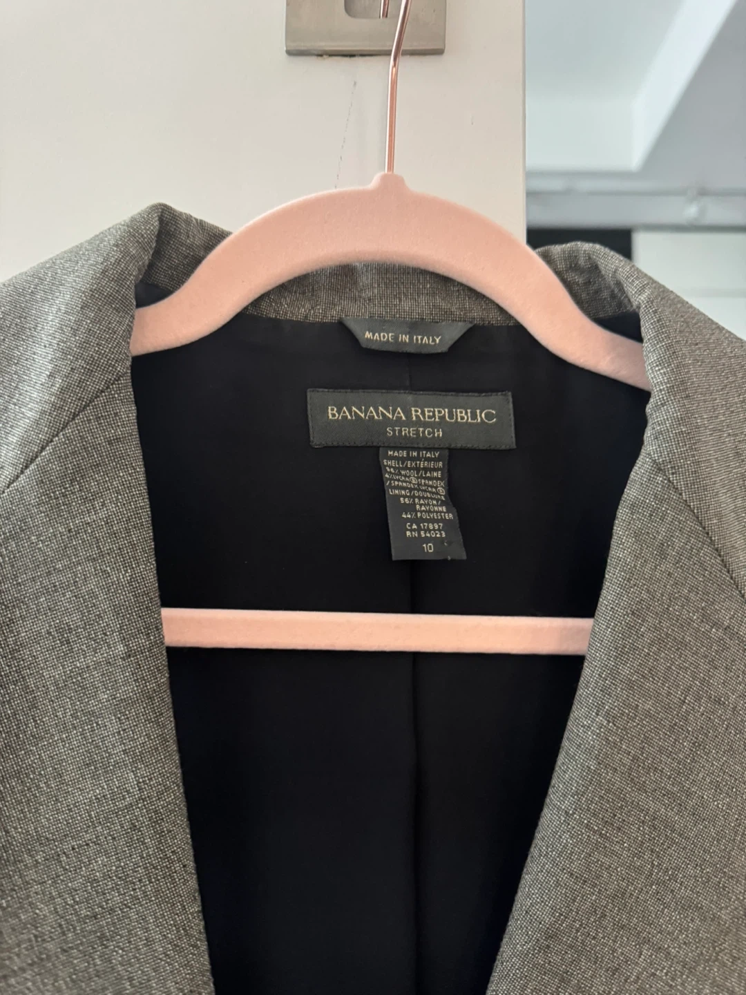 Selling a Banana Republic Stretch blazer in size 10. It's made in Italy with a shell of 96% wool and 4% spandex, and a lining of 56% rayon and 44% polyester. It’s in great condition and ready for a new home!