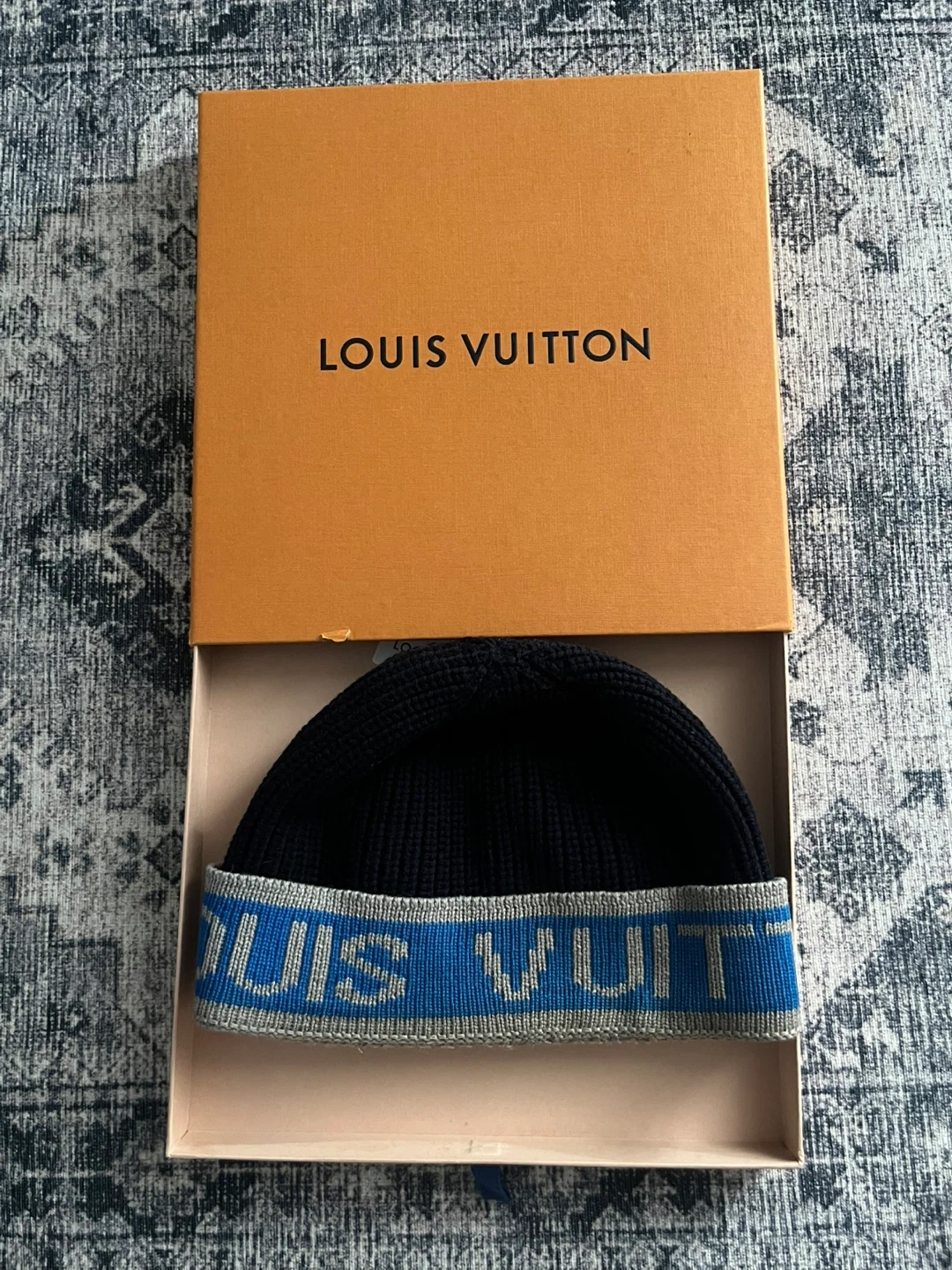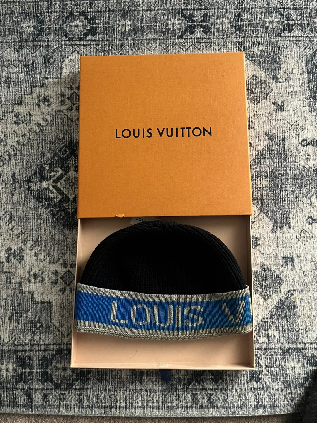 Selling a Louis Vuitton beanie. It comes with the original box. The beanie is black with a blue and grey Louis Vuitton logo band. Perfect for keeping warm in style!