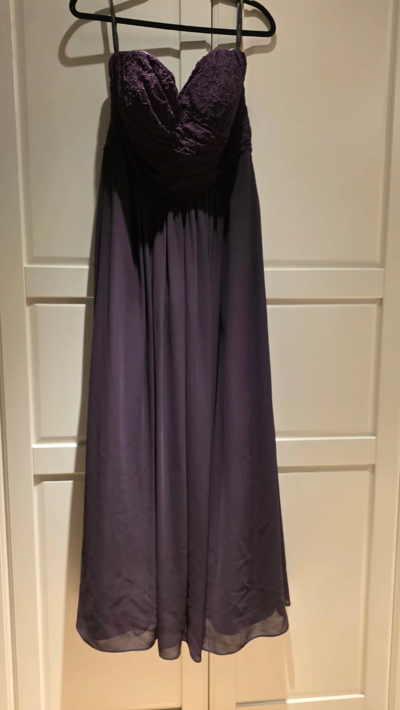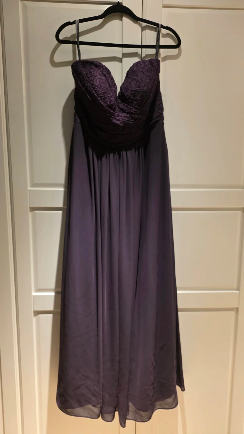 Selling a lovely purple strapless maxi dress. It's in great condition and perfect for a special occasion. The dress features a ruched bodice and a flowing skirt. The color is a beautiful, deep purple that looks great in any light