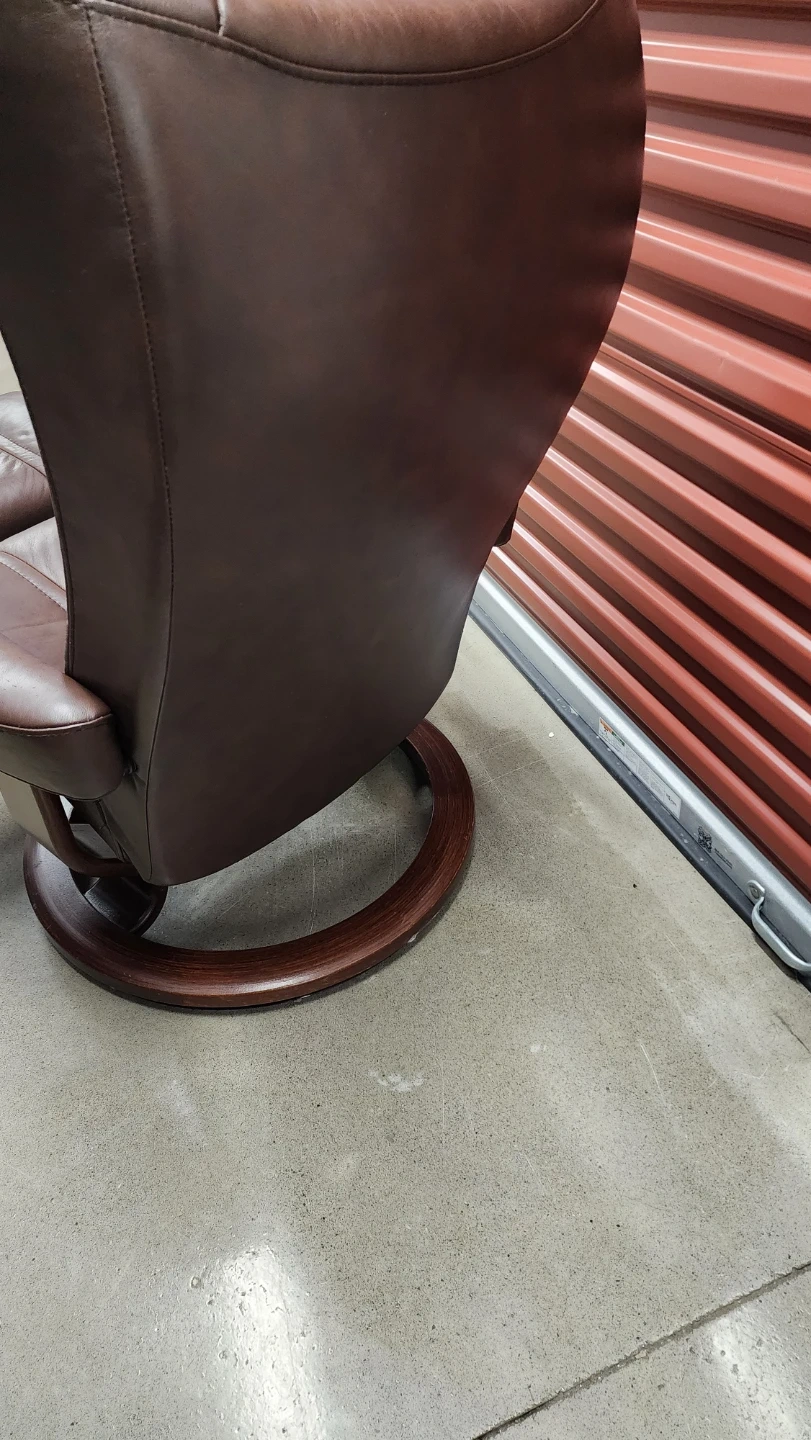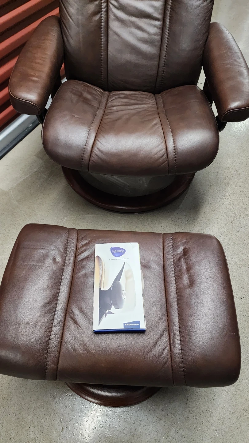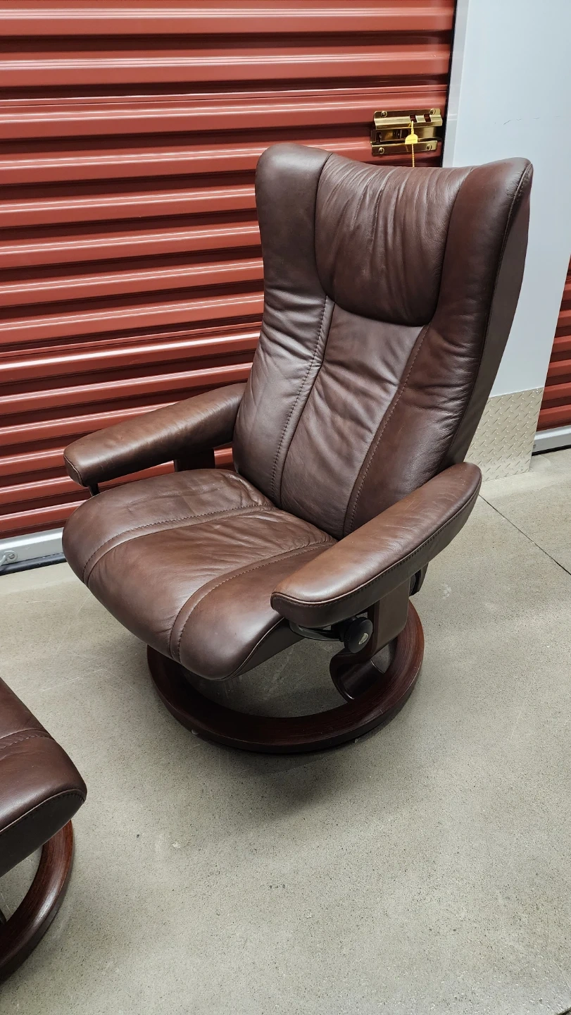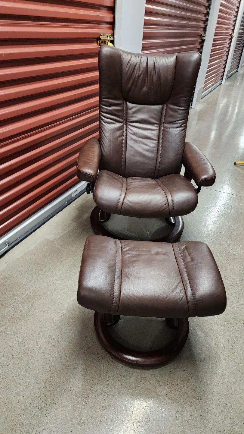 I'm selling a comfortable brown leather Stressless recliner chair with a matching ottoman. It's in great condition and ready to add a touch of luxury to your living space!