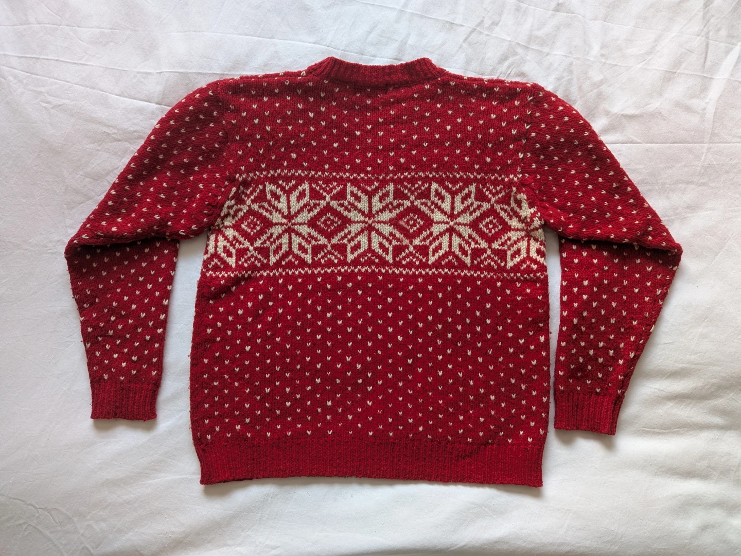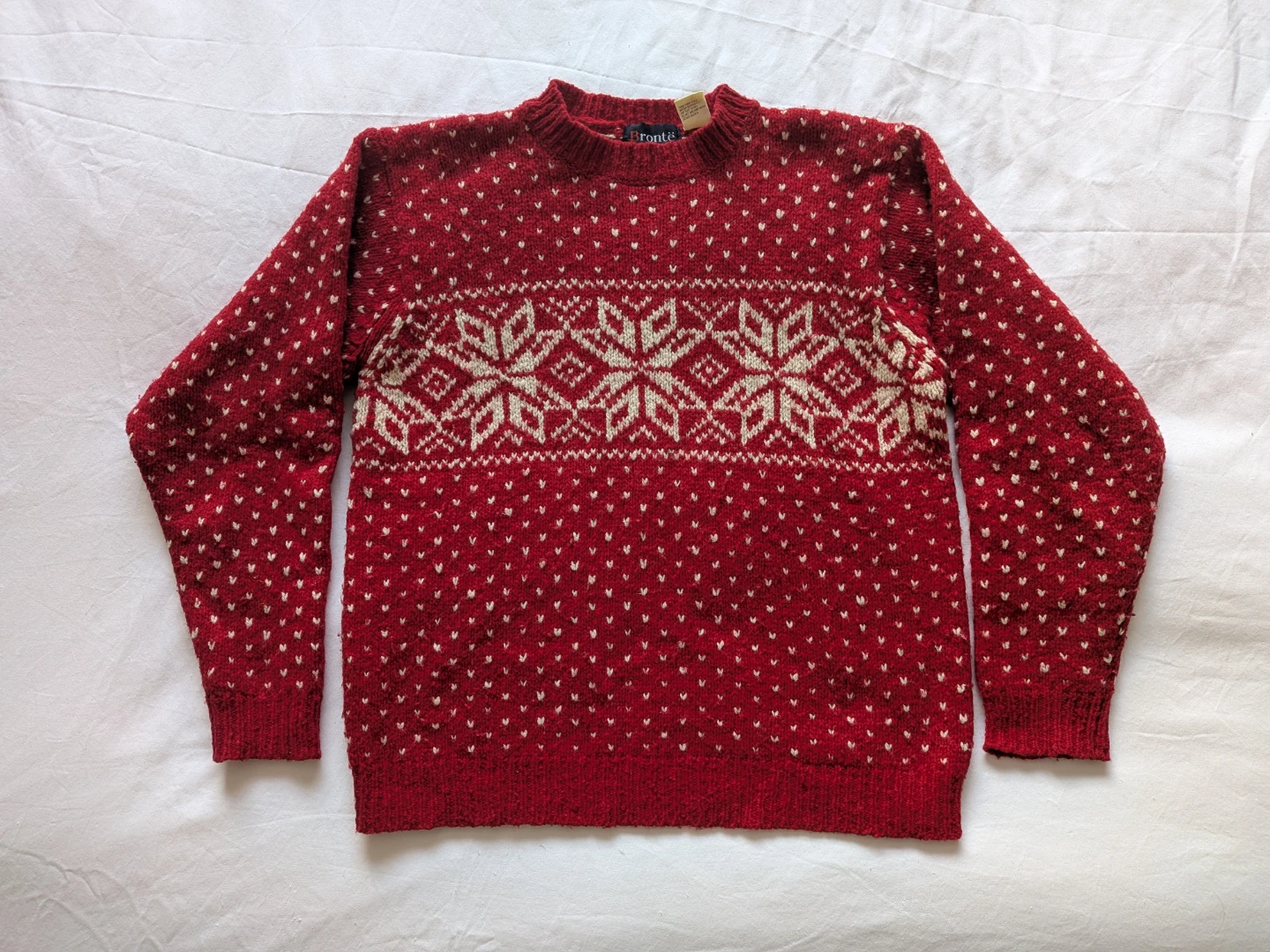 Selling a gently used vintage Brontë sweater in size L. It's a lovely red colour with a snowflake pattern. Made of 55% ramie wool and 45% cotton, it's sure to keep you warm and cozy!