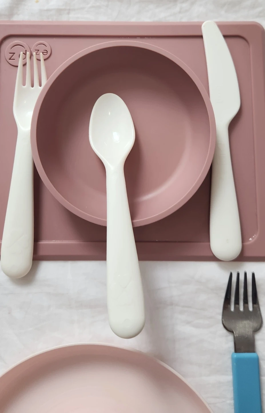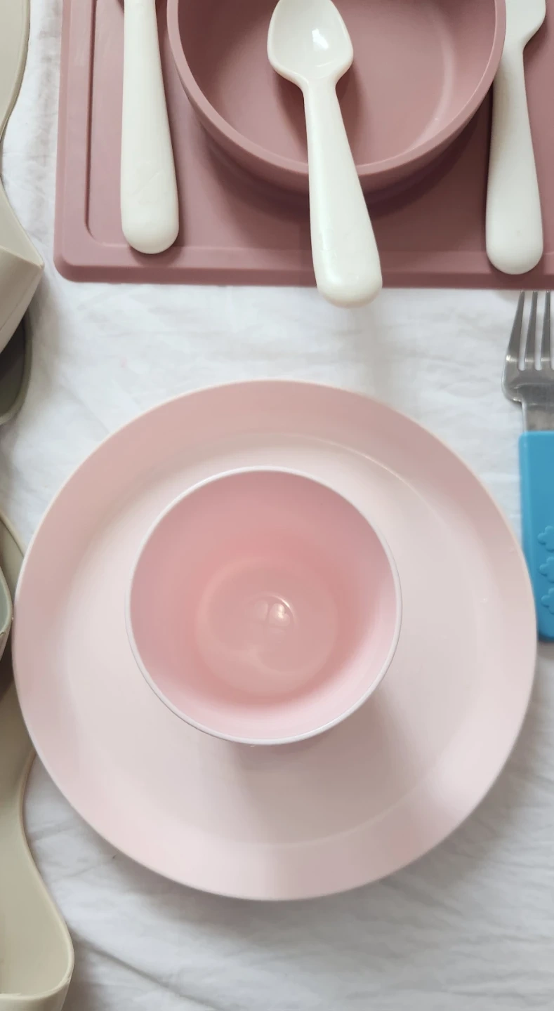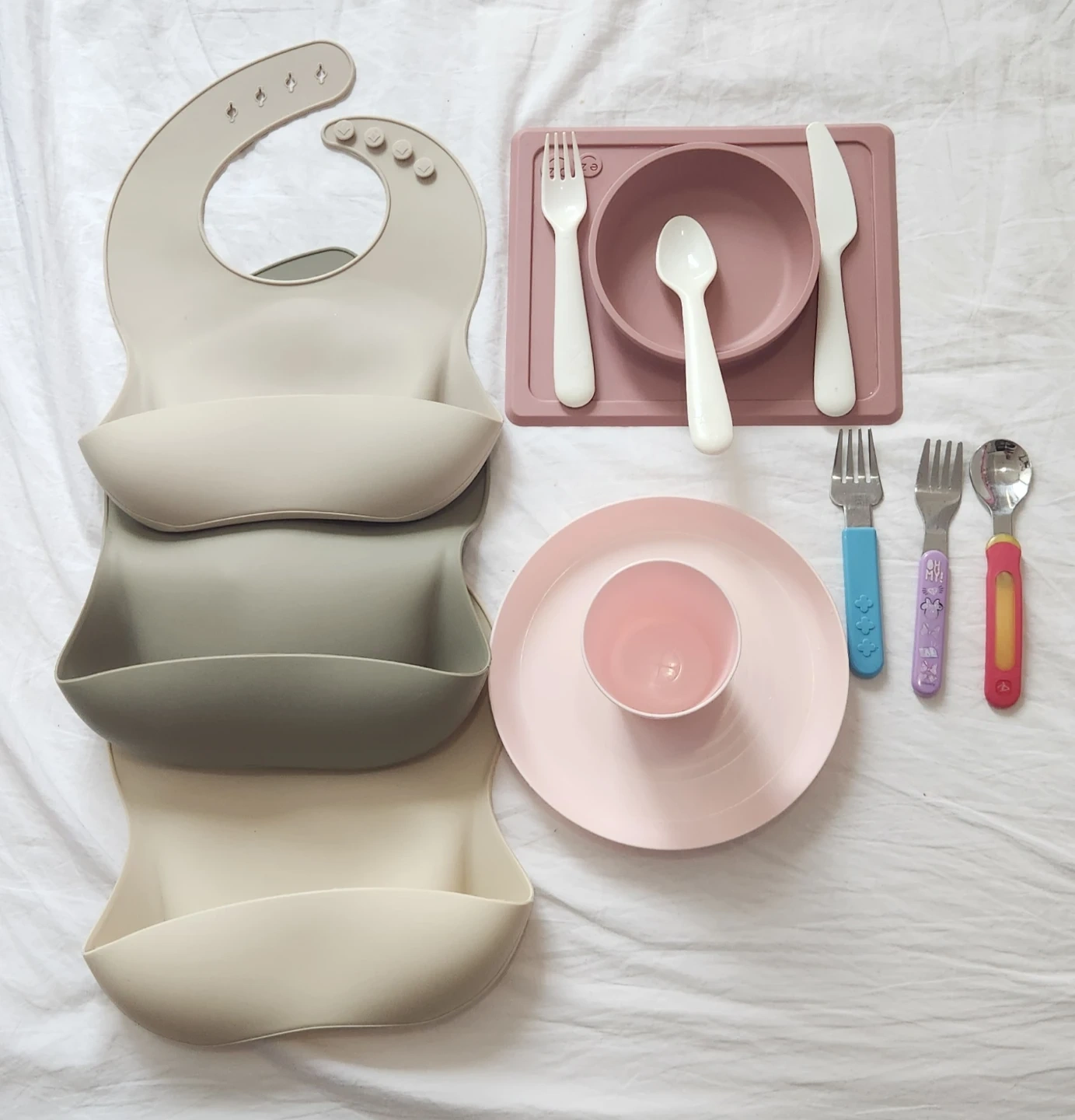 Selling a baby feeding set that includes ezpz bibs, plates, and utensils! Great condition and perfect for starting solids. Includes three bibs in neutral colours, a pink plate set and some colourful utensils.