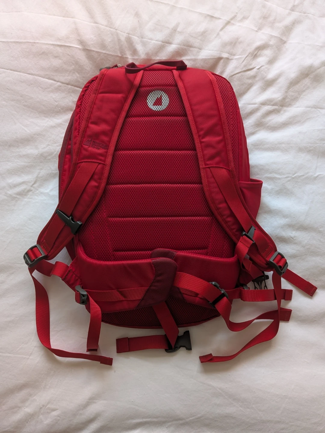 Selling a red Mountain Equipment Co-op (MEC) backpack. It's in good condition and ready for your next adventure or daily commute! It has a few minor marks (see close-ups).