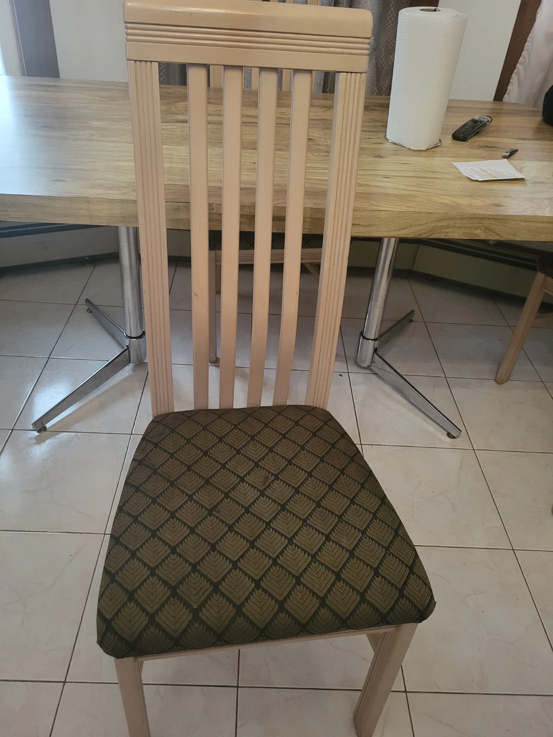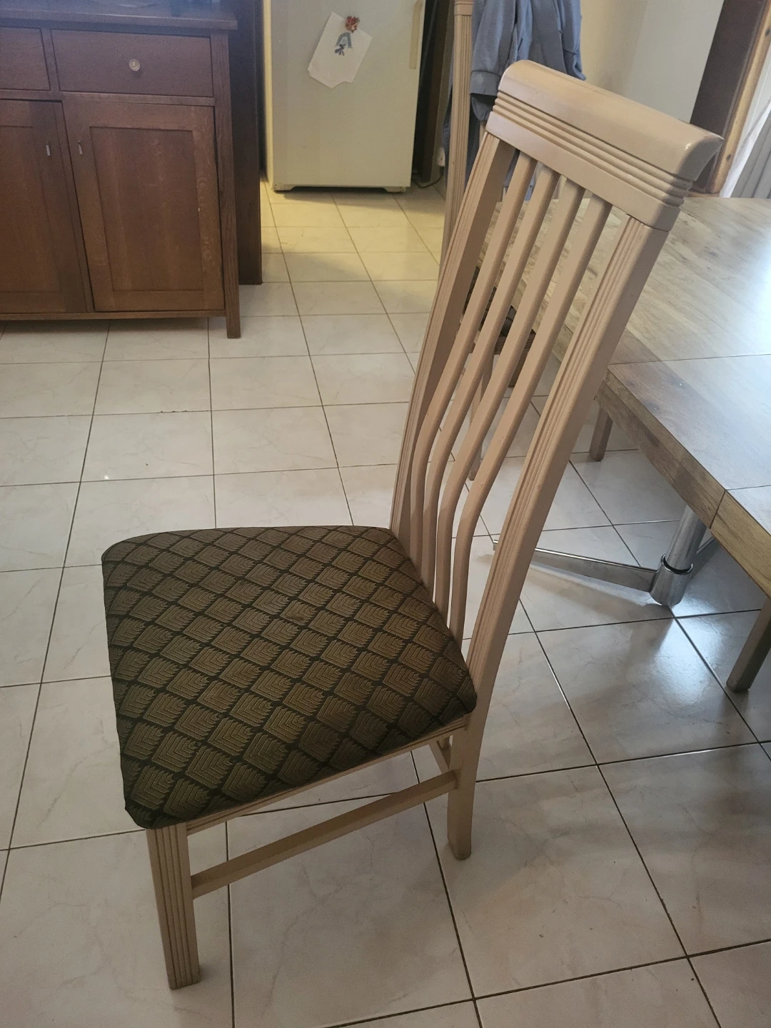 Selling 5 dining room chairs that would be perfect for your home! It features a beige wooden frame and a patterned cushion seat. It's in great shape and ready to use in your dining area or kitchen. $25. Each or $150 for all