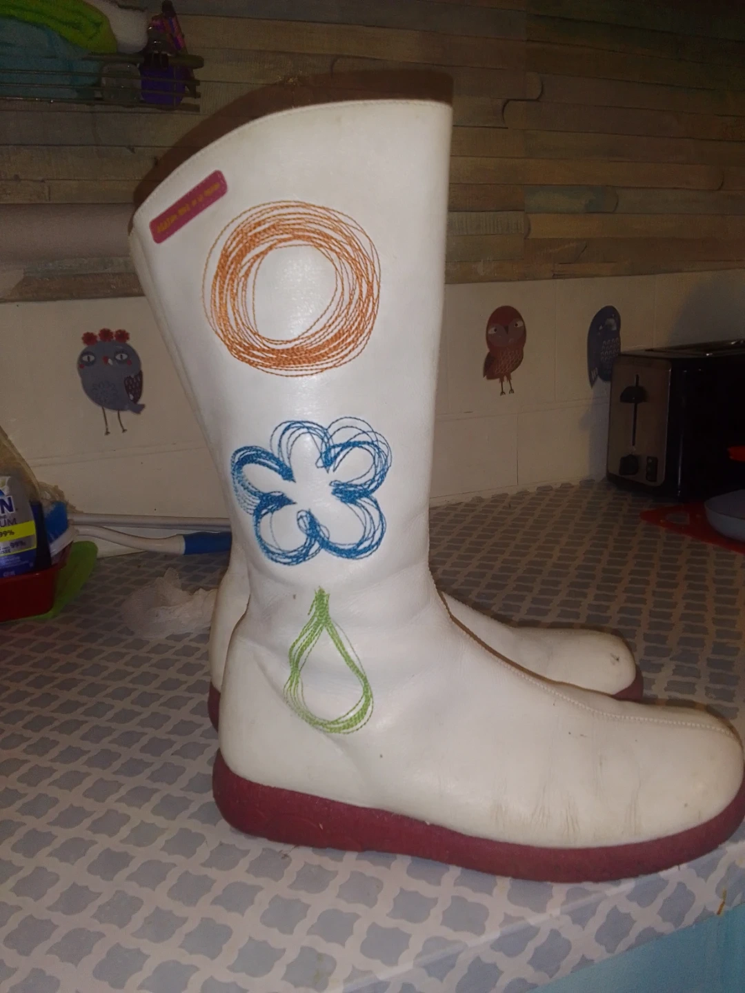 These are a pair of white boots with colourful shape designs on them. They have a red sole and brown trim. They're in good condition and ready for a new owner
