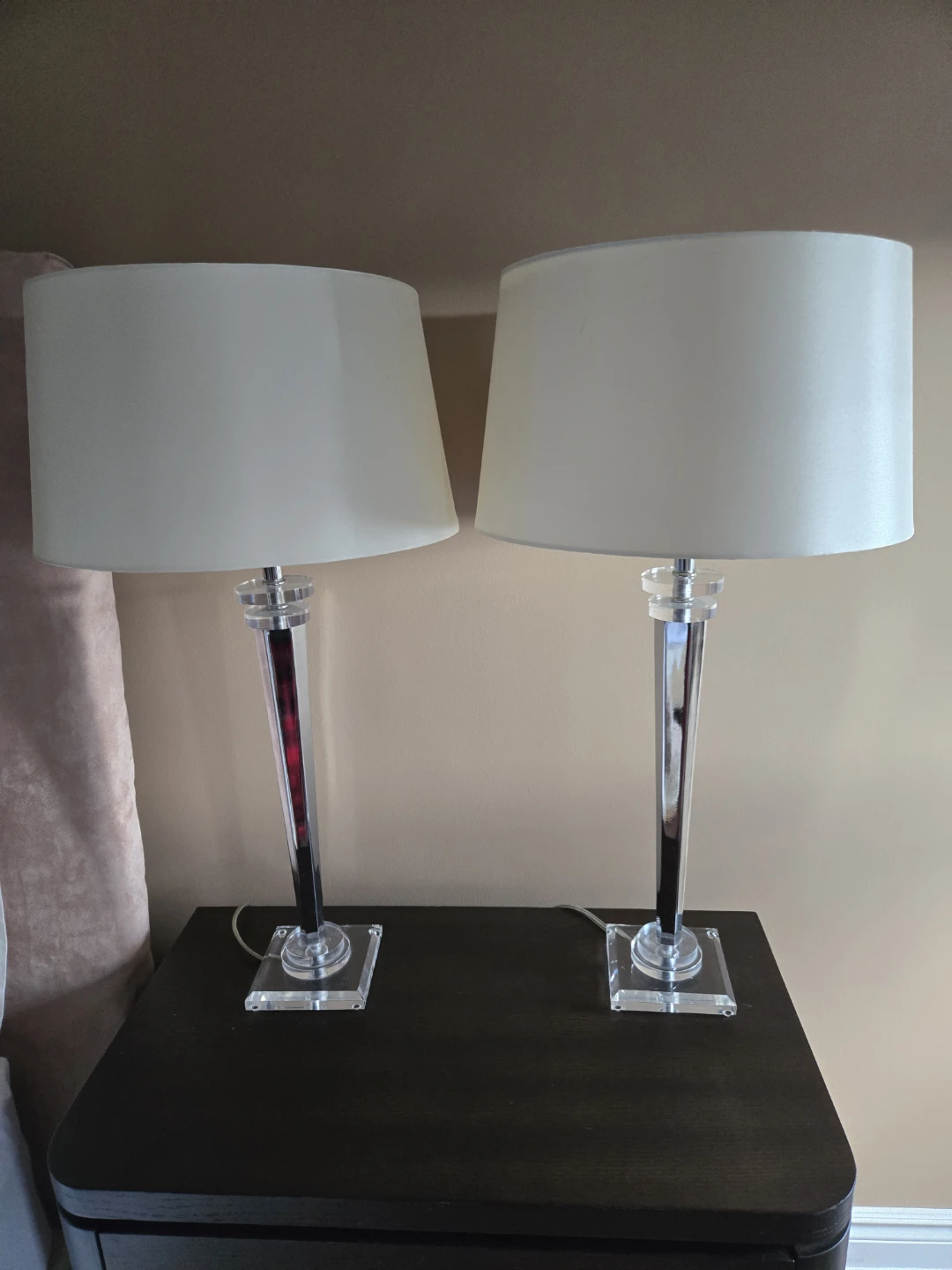 Selling a pair of lovely acrylic crystal lamps! They would be perfect for a bedroom or living room. They are in great condition and ready to brighten up your space.