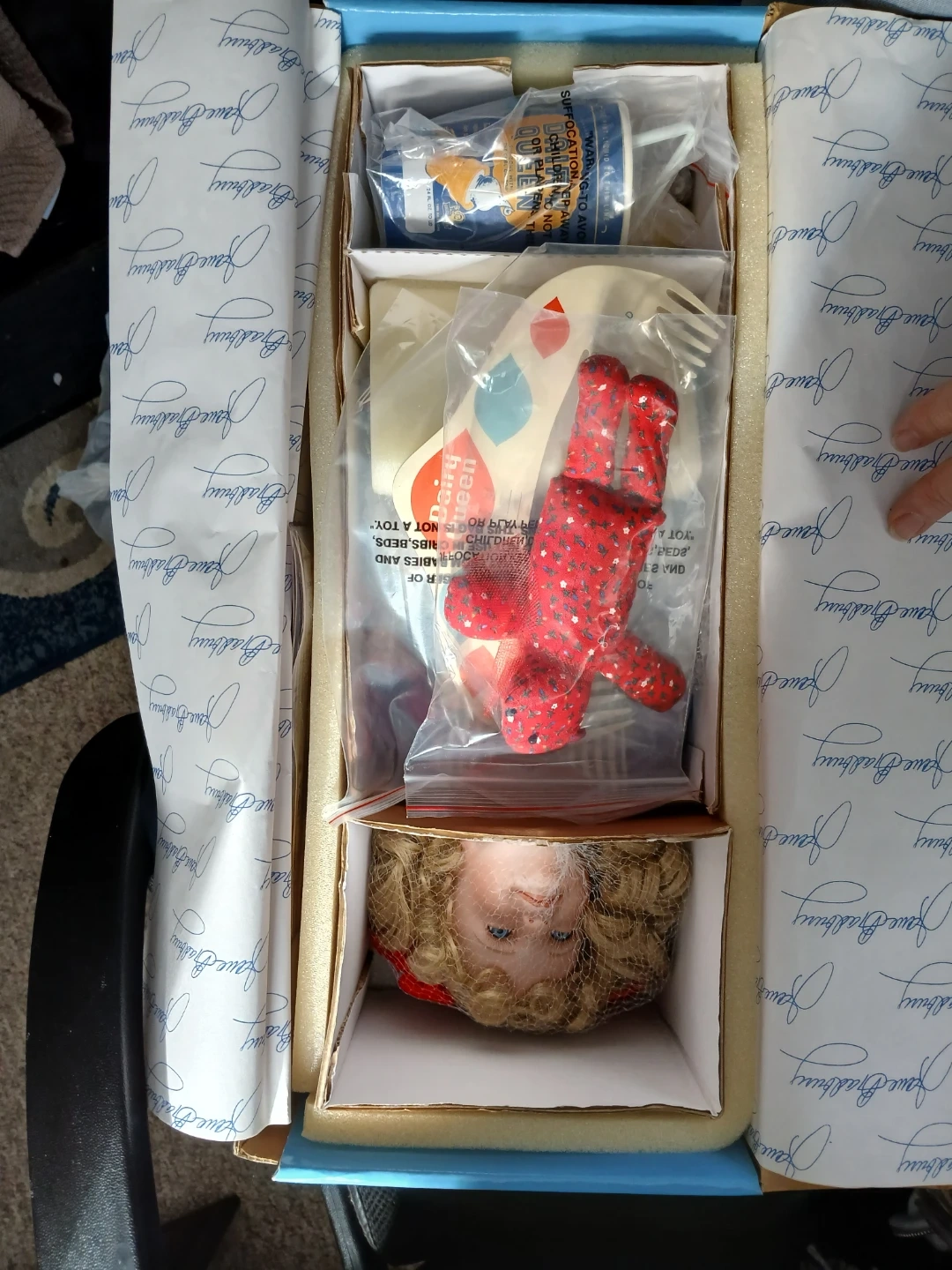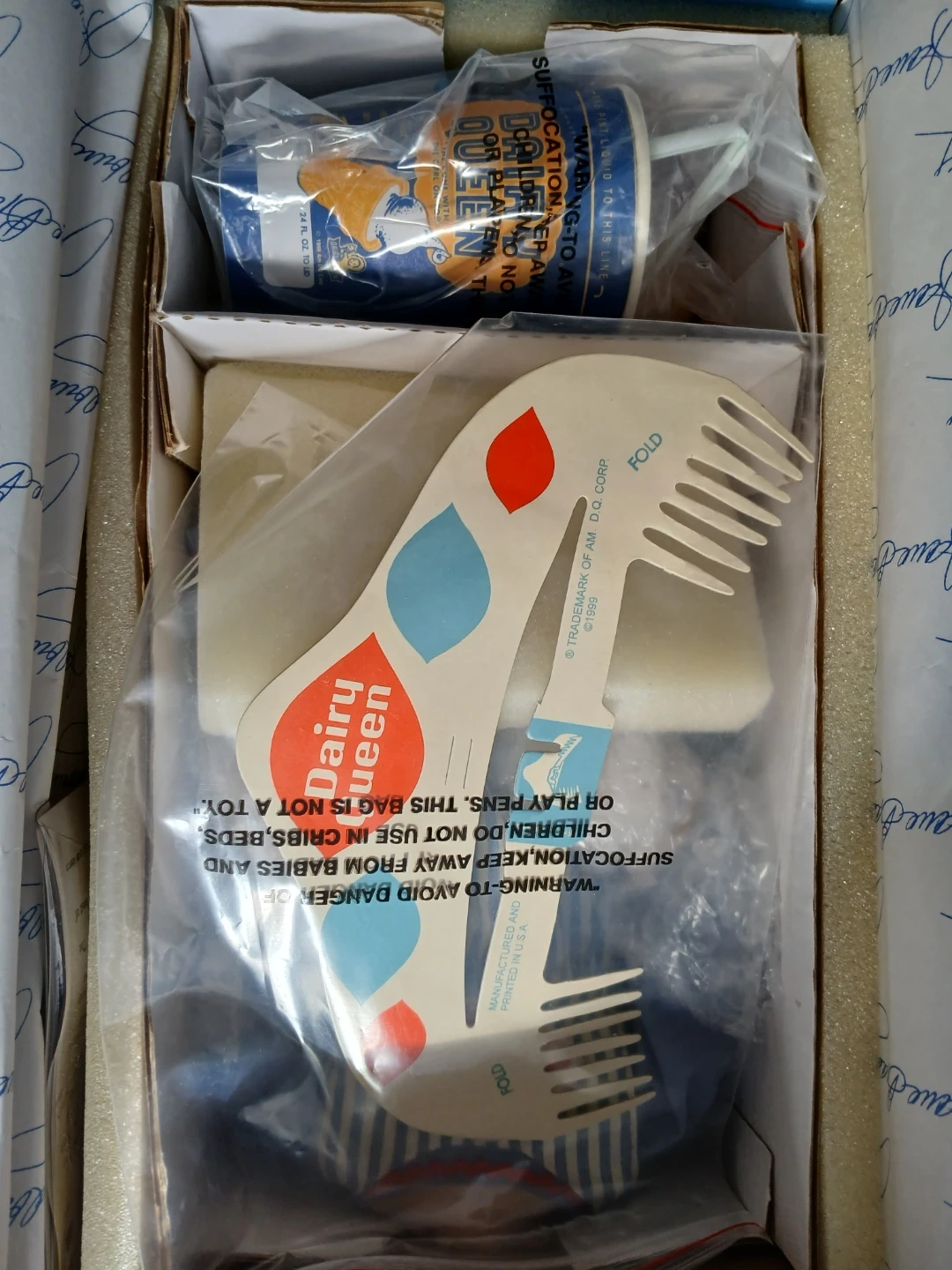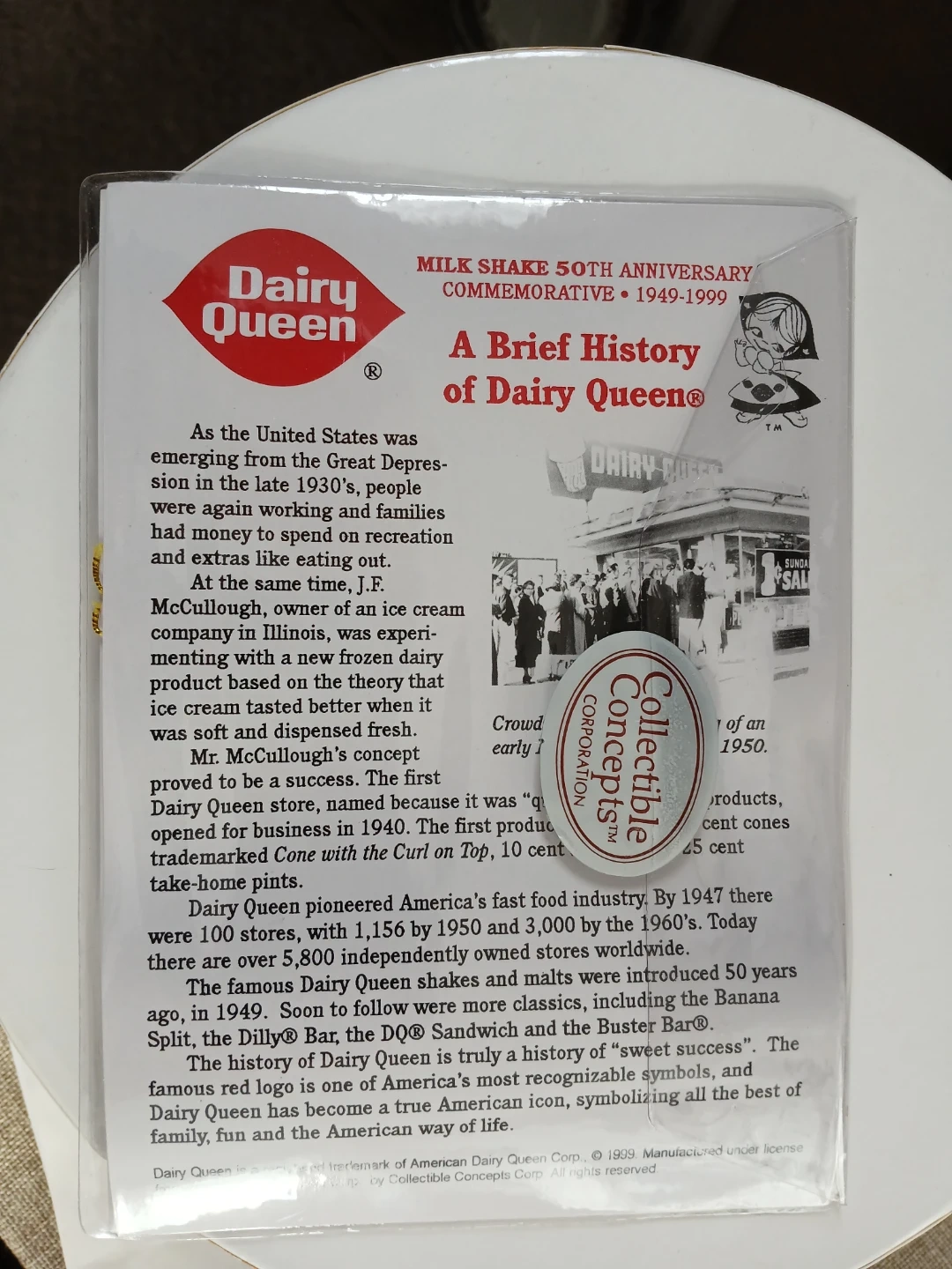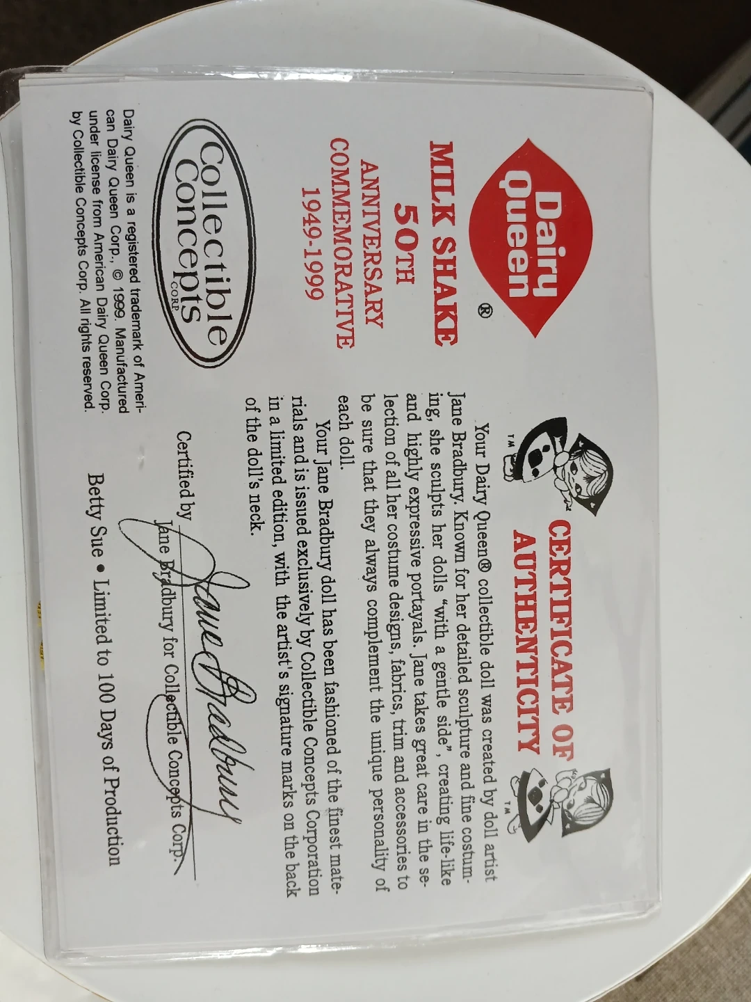 Selling a Dairy Queen 50th Anniversary Commemorative Collectible Doll from 1949-1999. The doll was created by doll artist Jane Bradbury Kioski. It has detailed sculpture and fine costume designs. It comes with a certificate of authenticity. New, top of box is torn some due to someone opened it the wrong way.