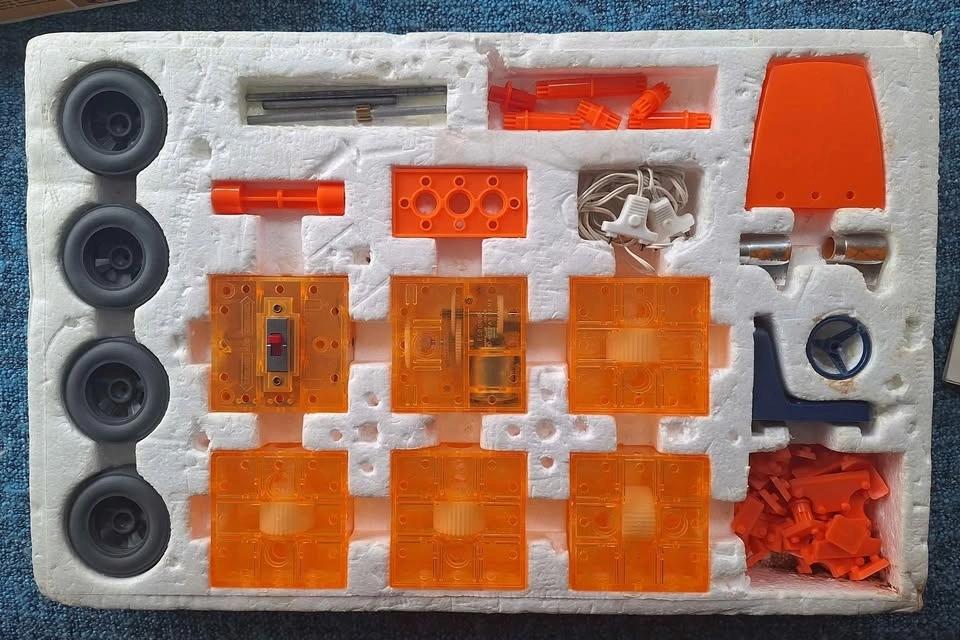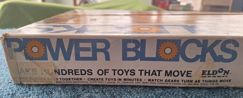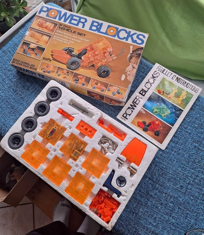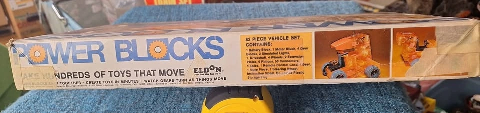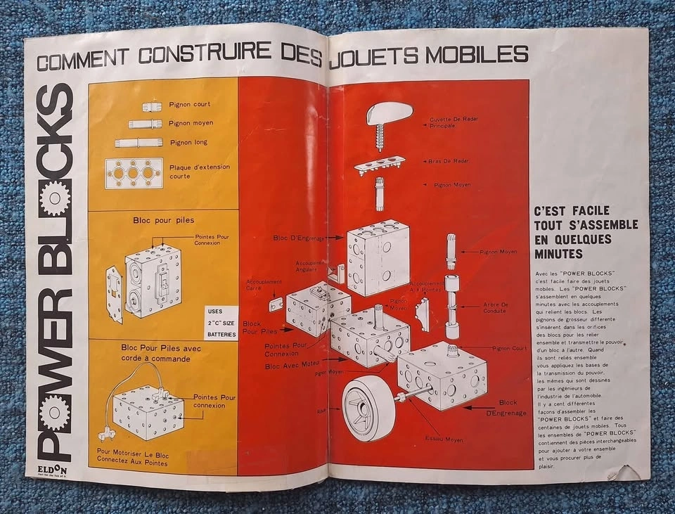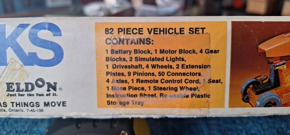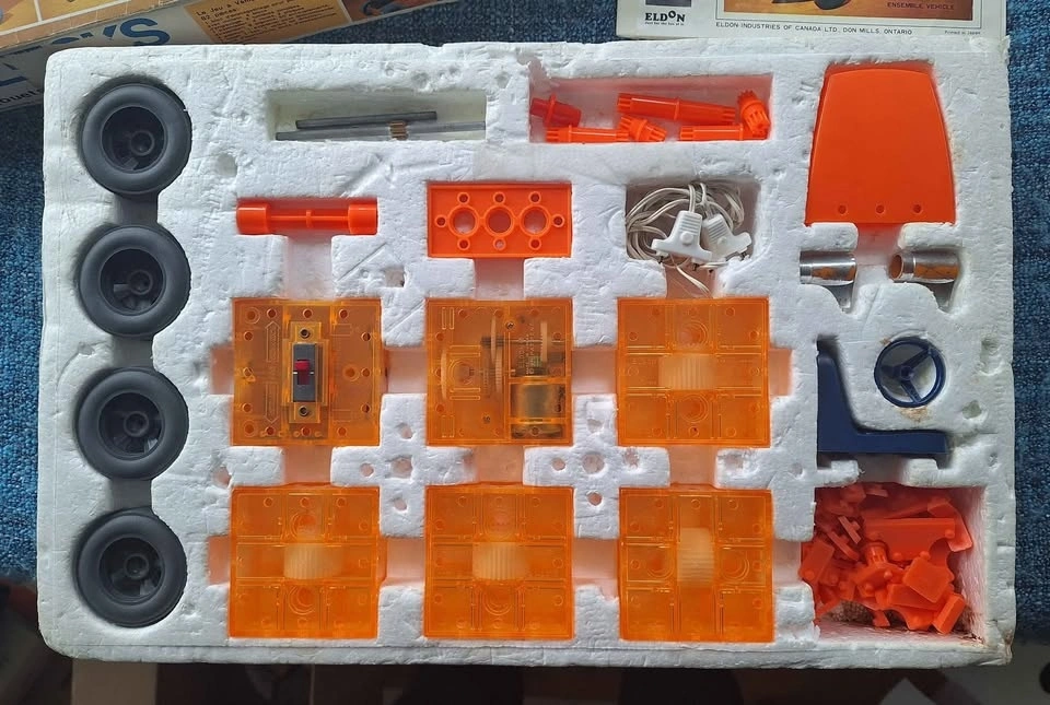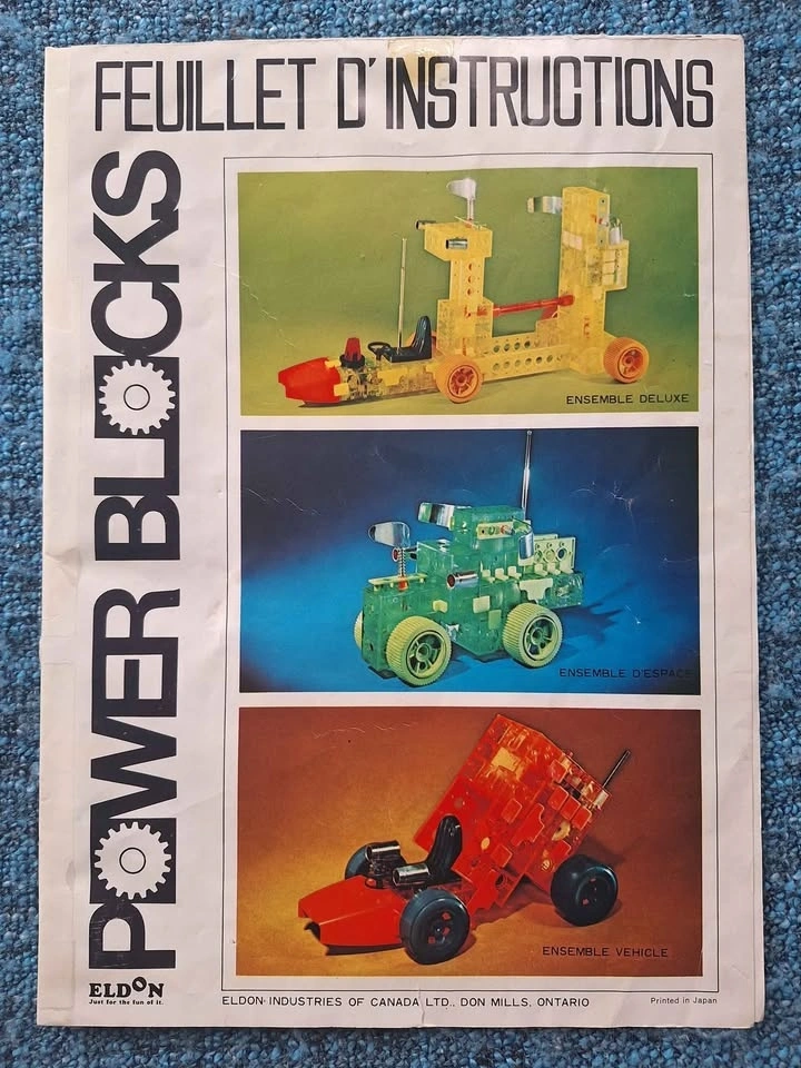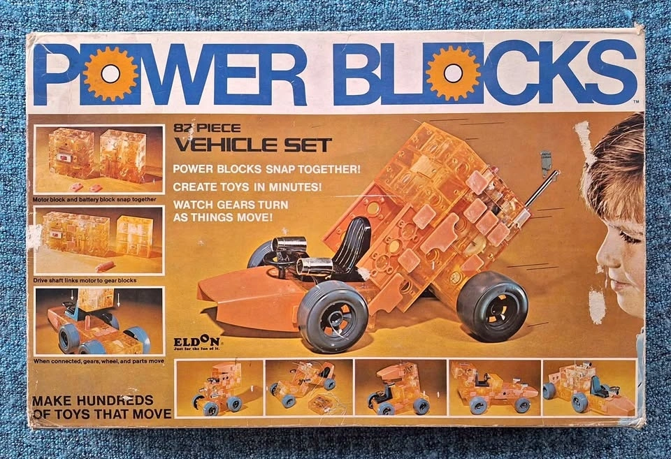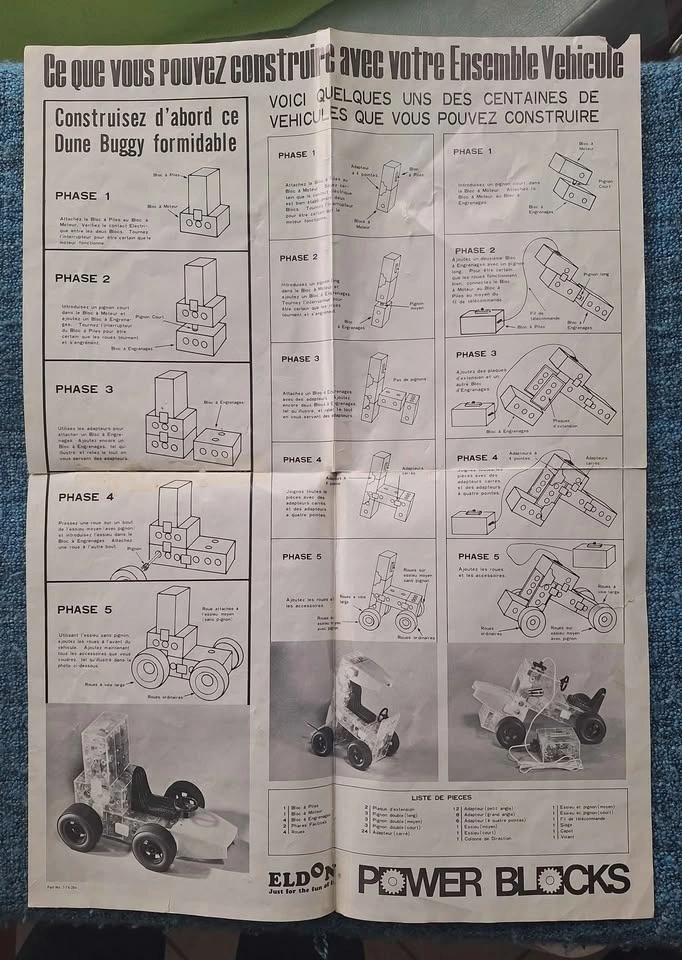 Vintage 1970 Power Blocks Vehicle Set by Eldon. 77 of 82 pieces included, all large pieces present with 5 small connectors missing. Box and instructions booklet (French only) have visibly been taped, power supply tested and does not work.