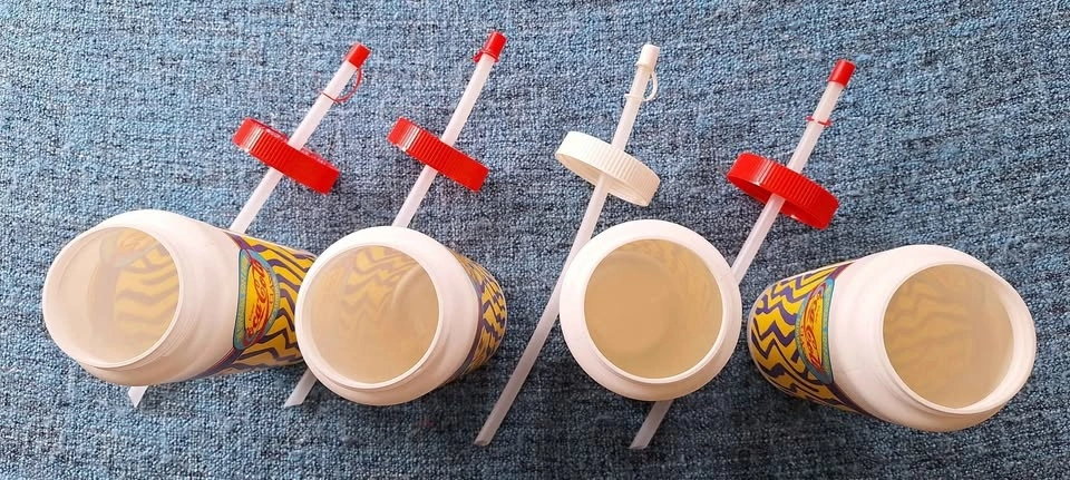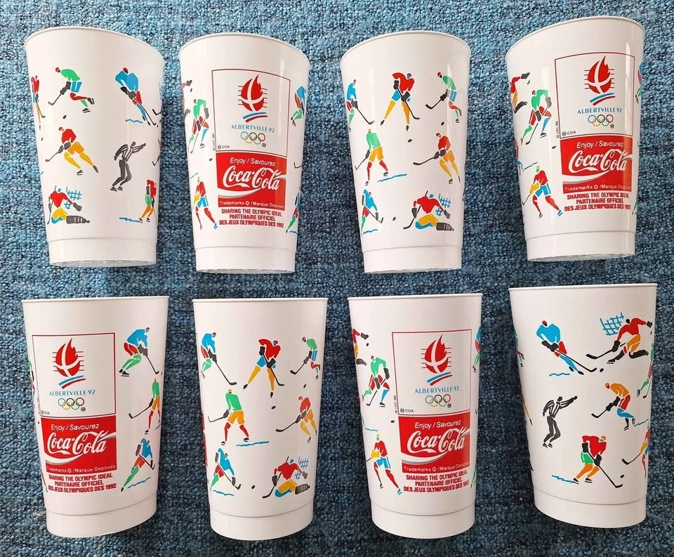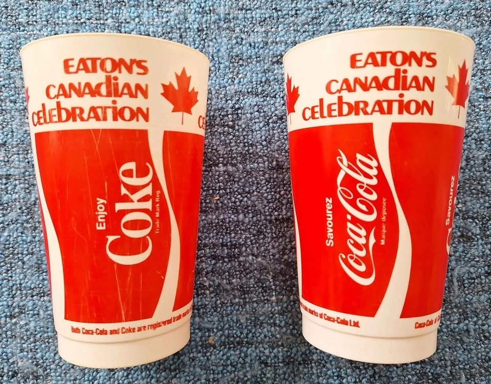 Plastic Coca Cola Bottles and Cups from 1980's & 1990's. Water bottles with straws are 8.5" tall snd 1992 Olympic & Eaton Cups are 5" tall. All 14 pieces are clean and scratch free, the 2 Eaton cups show time darkened plastic and 1 of them has some scratch lines from being stacked. Asking $20 for all.