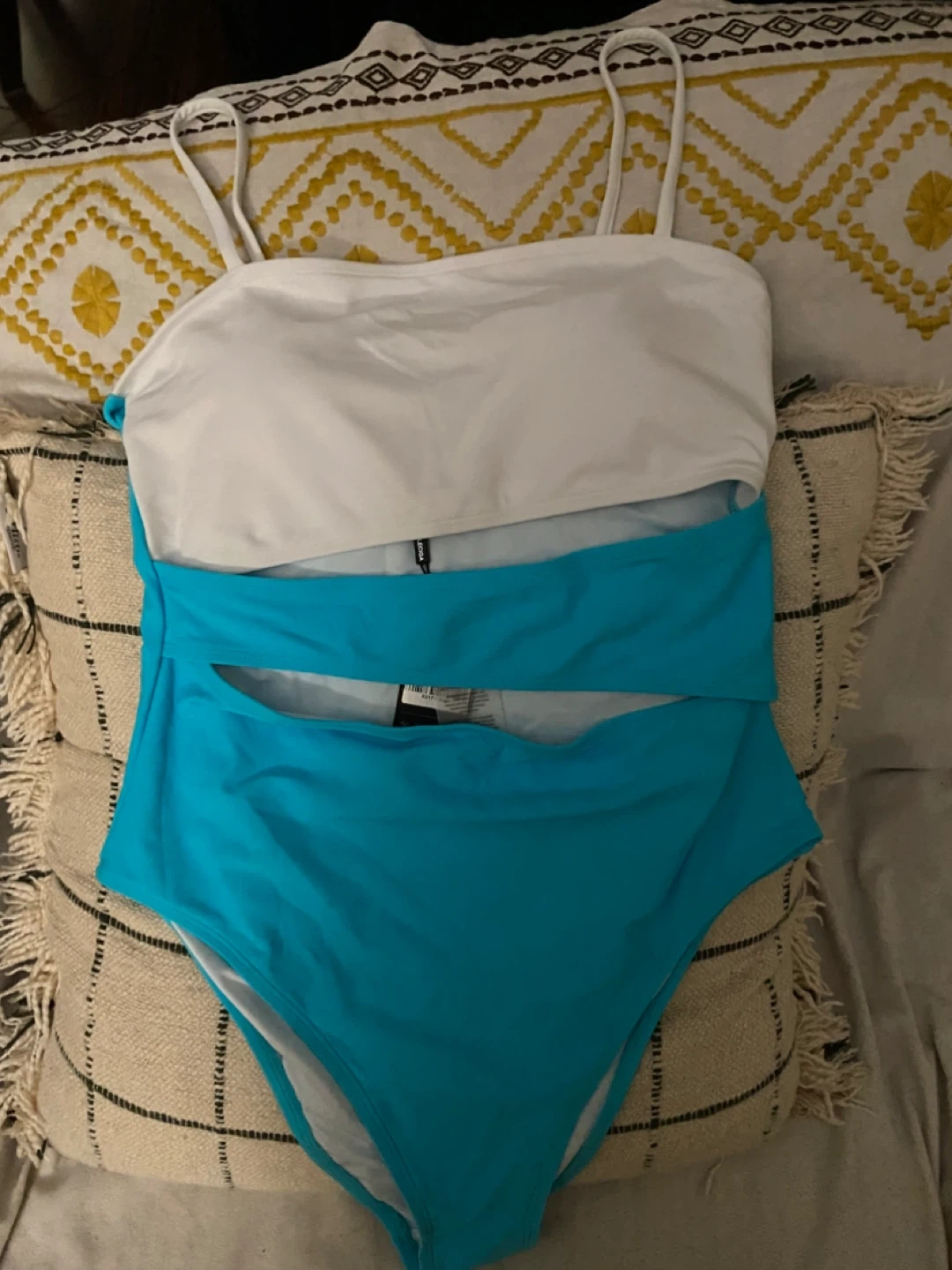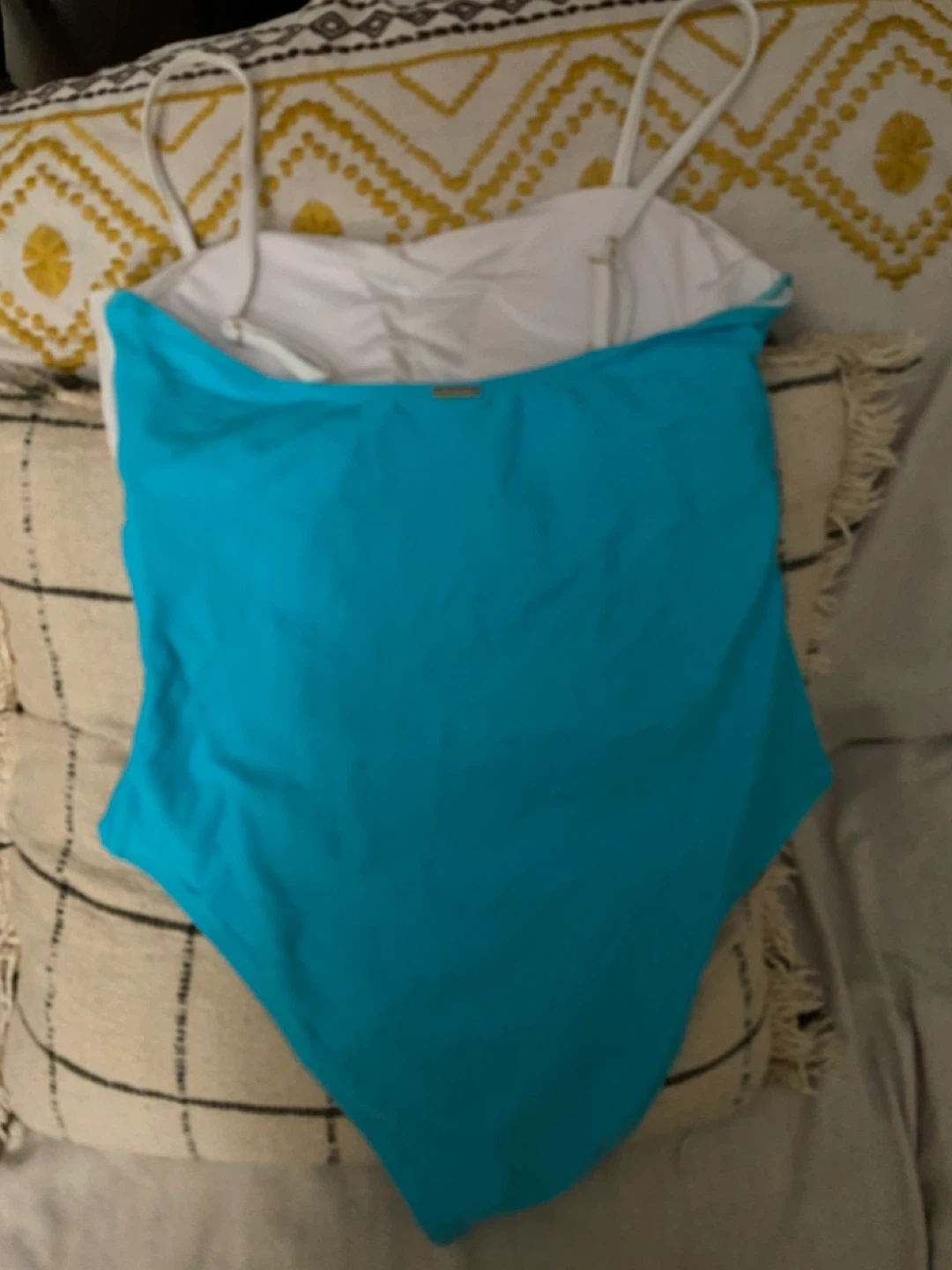 Selling a Belle Ciga one-piece swimsuit. It features a stylish cutout design and comes in a vibrant turquoise and white colour combination. Perfect for the summer season!