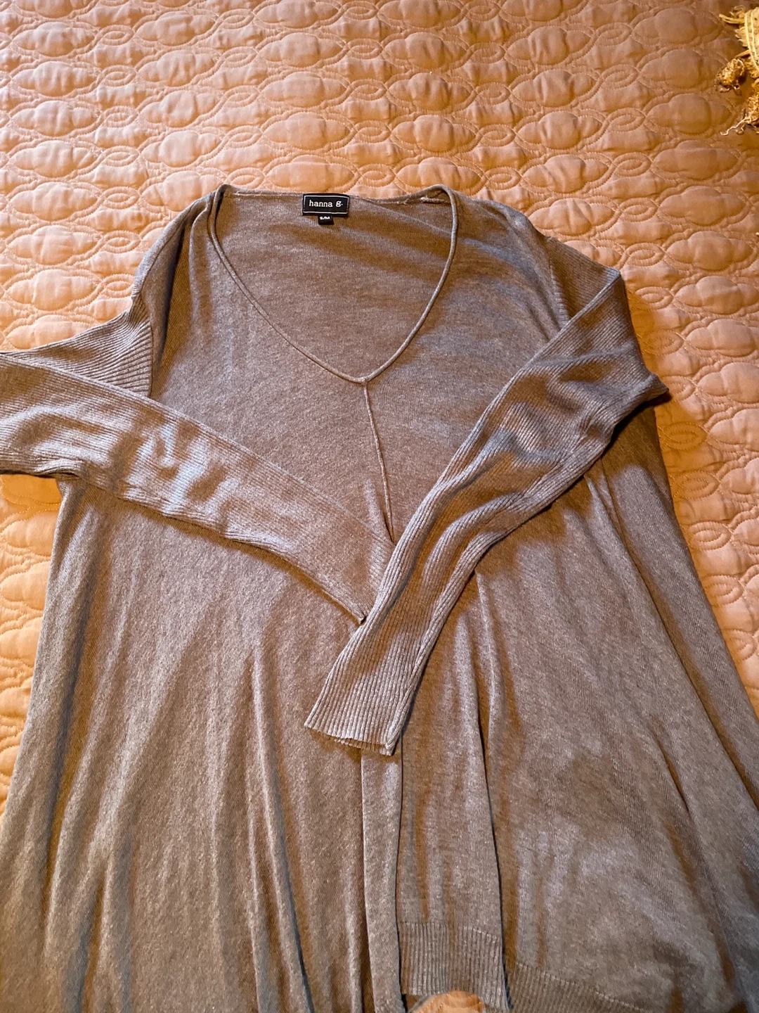 Here's a comfy Hanna Andersson tunic in a neutral grey colour! It's marked as a size S/M and features a flattering V-neck. Perfect for layering or wearing on its own
