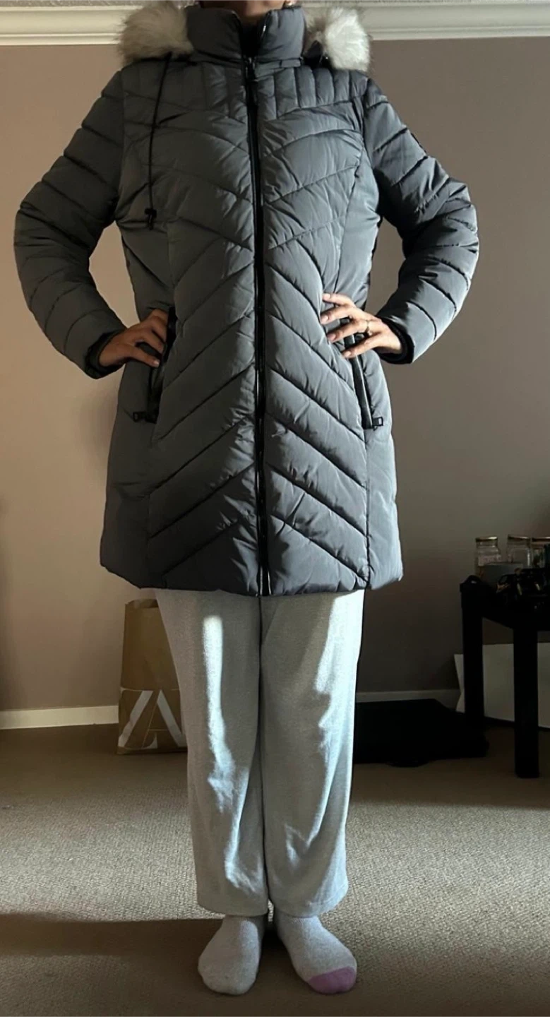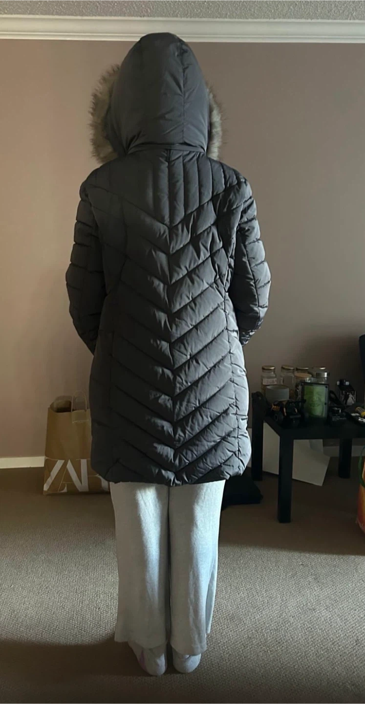 Here's a stylish grey puffer coat that's perfect for staying warm! It features a cozy fur hood to keep you extra snug during those chilly days. It's in great condition and ready for a new owner!