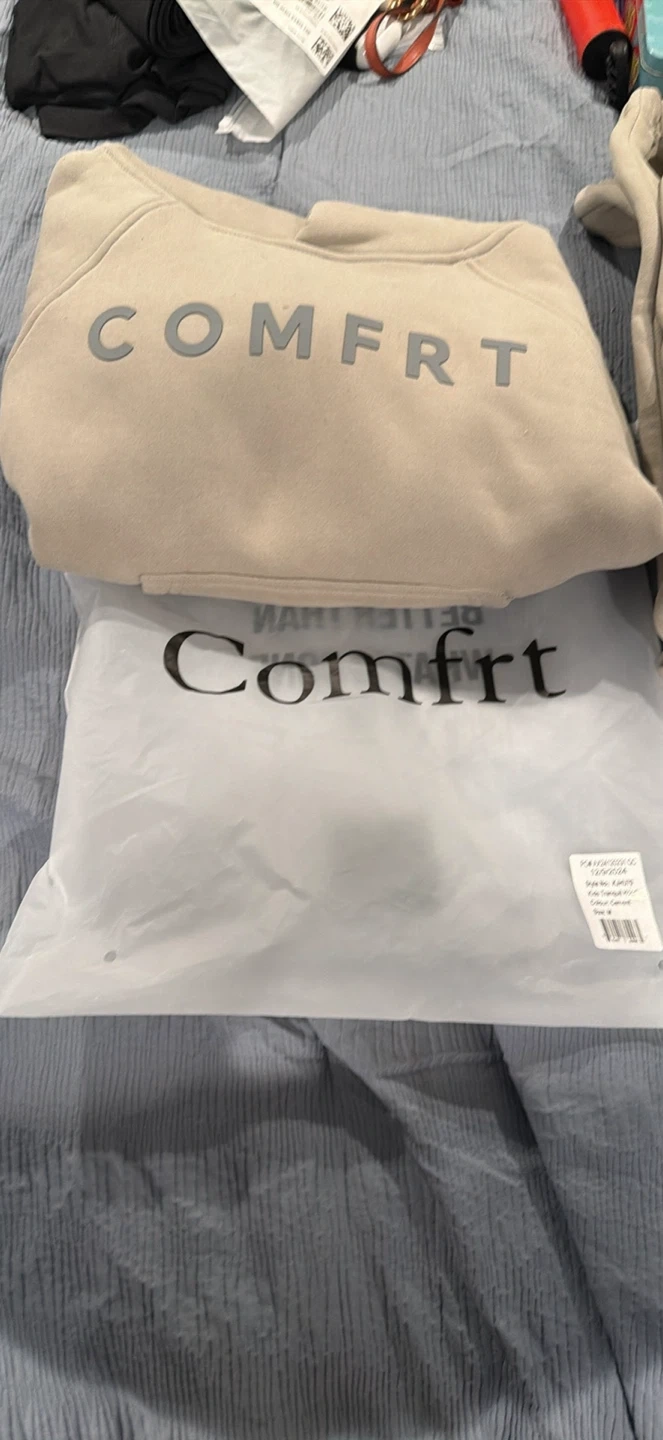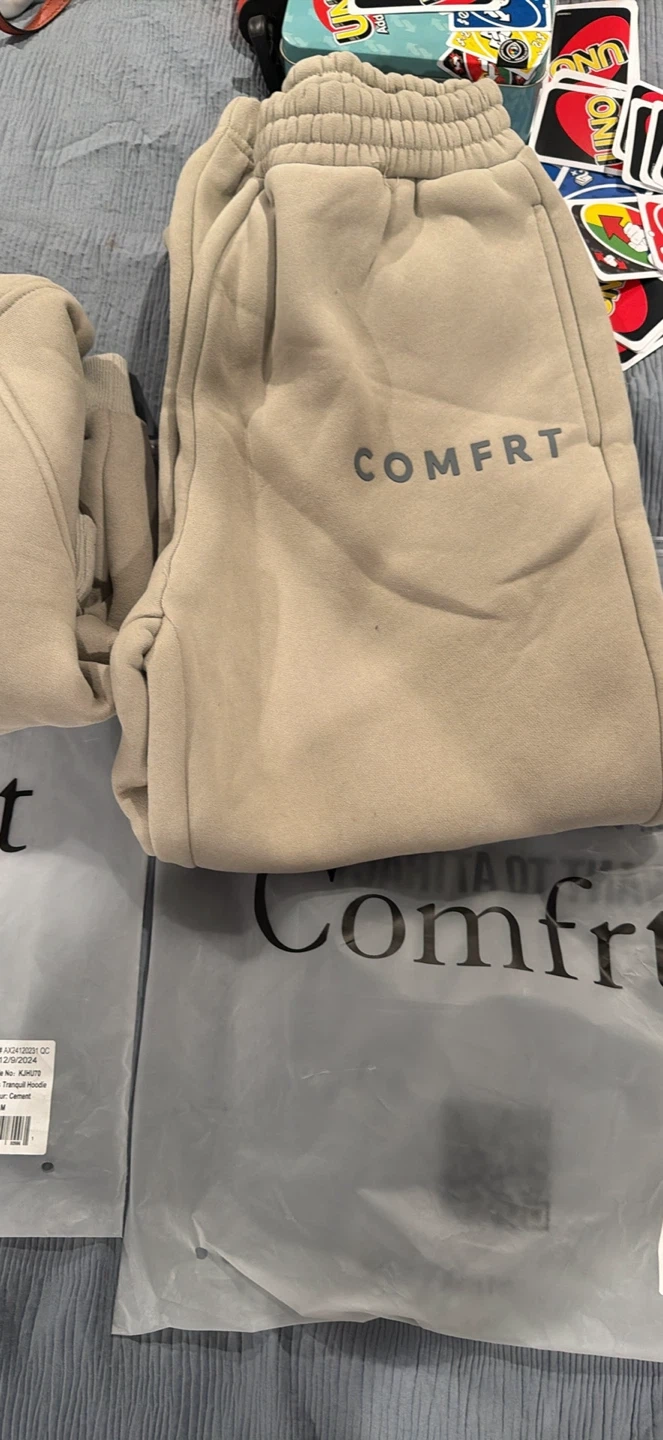 I'm selling a brand new Comfrt kids set! This includes the Tranquil hoodie and sweatpants in a cement color, size medium. The style numbers are KJHU70 for the hoodie and KJHU71 for the sweatpants. Great for keeping cozy!