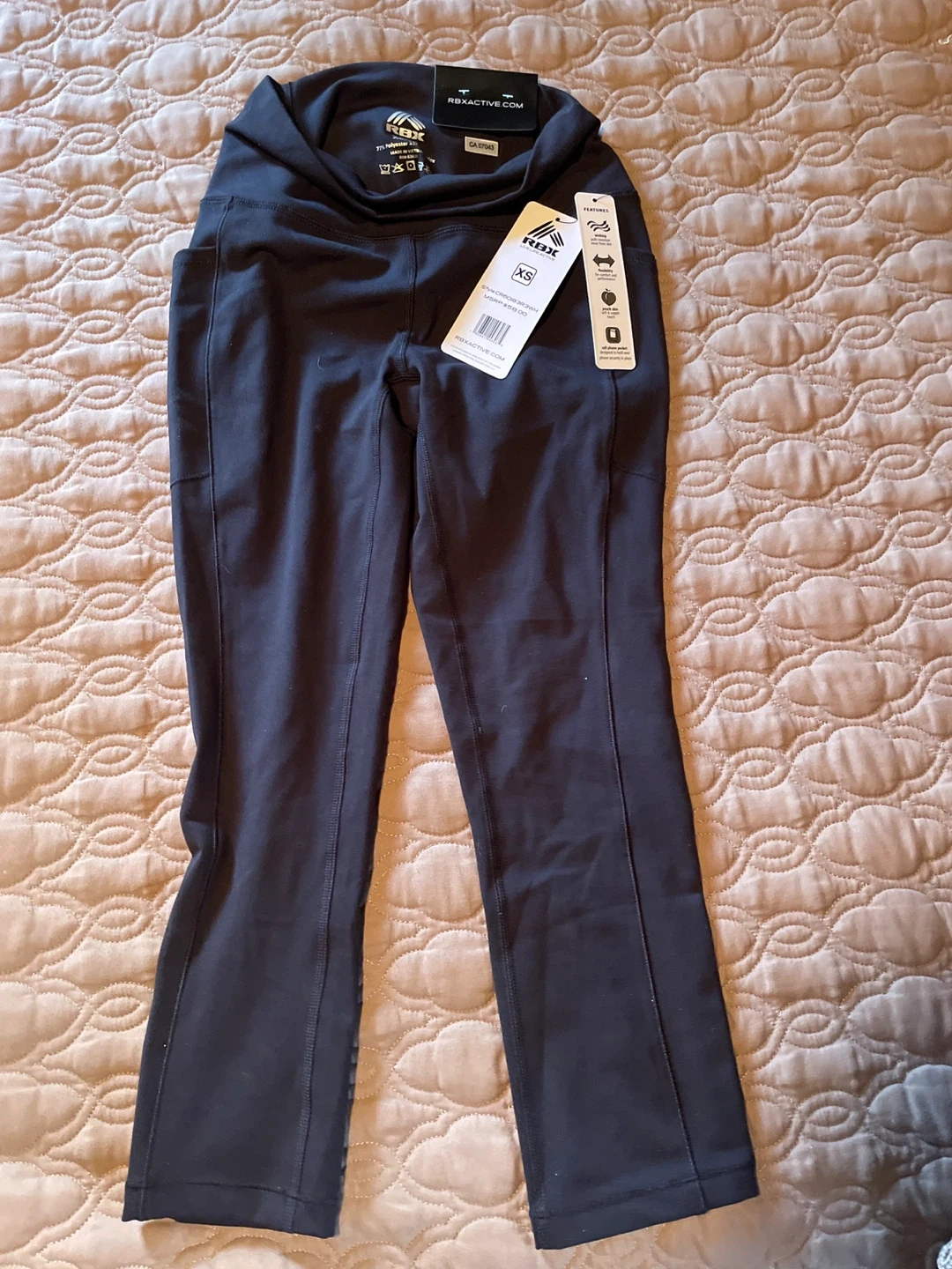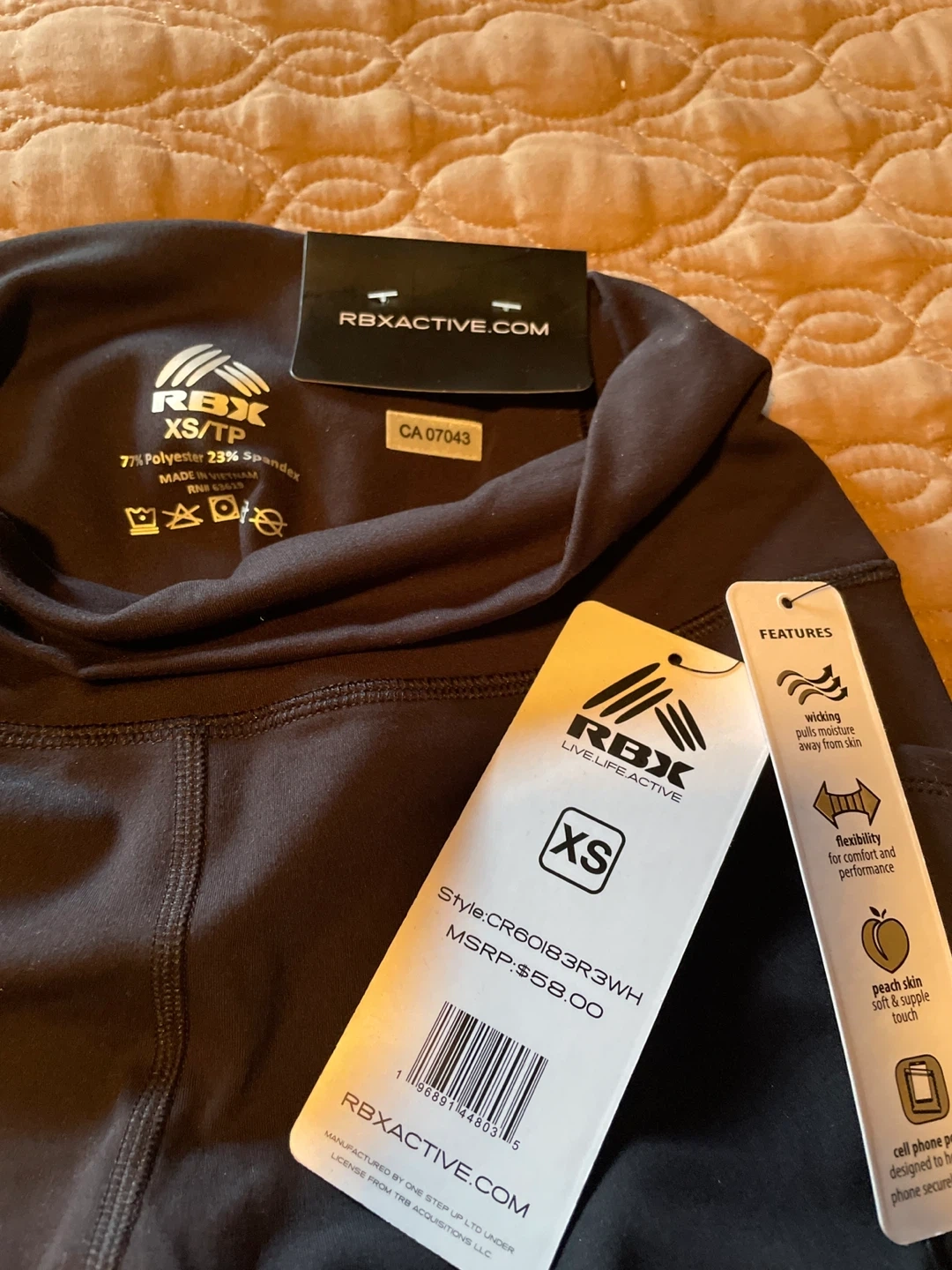 I'm selling a brand new pair of RBX Active leggings, still with the tags on! These leggings are a size XS and come in black. They're made of 77% polyester and 23% spandex, making them flexible and comfortable for performance. They also have wicking to pull moisture away from the skin, and a peach skin feel for a soft touch. Originally bought for $58!