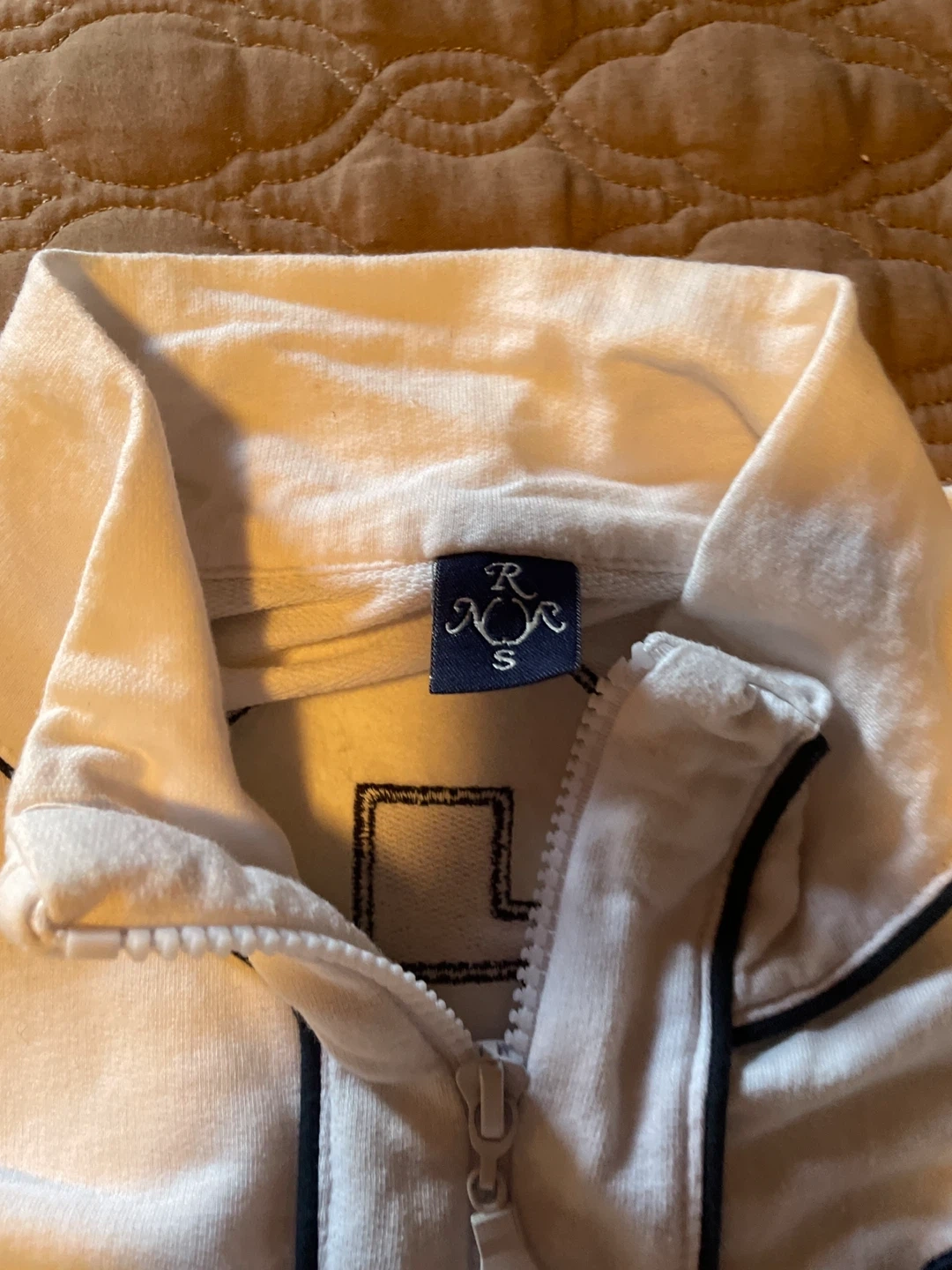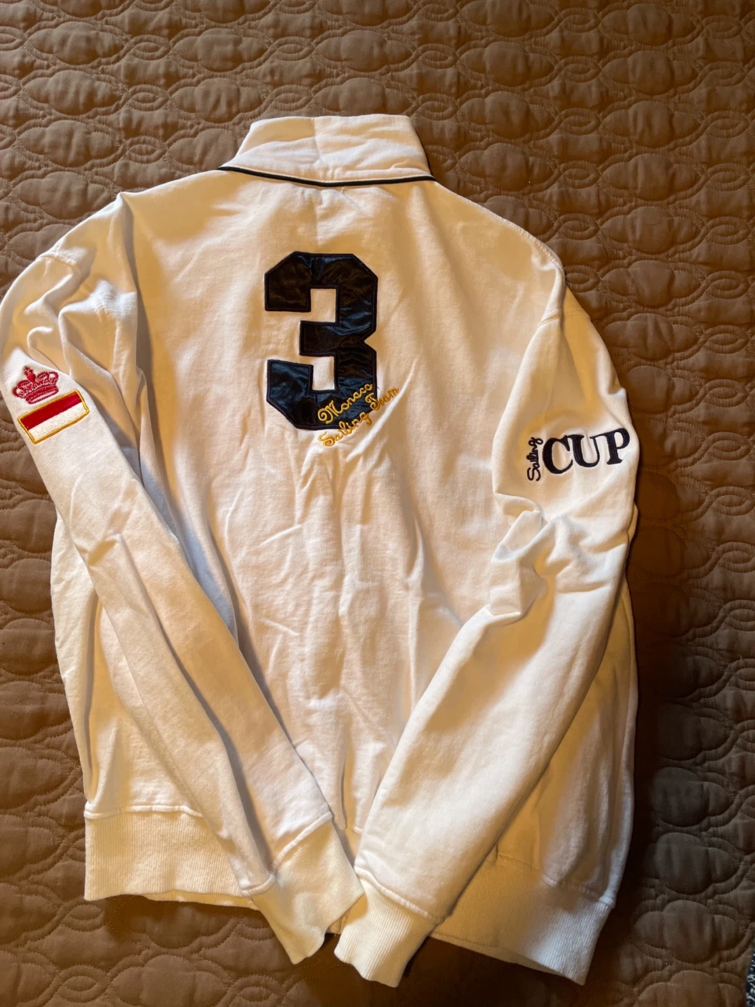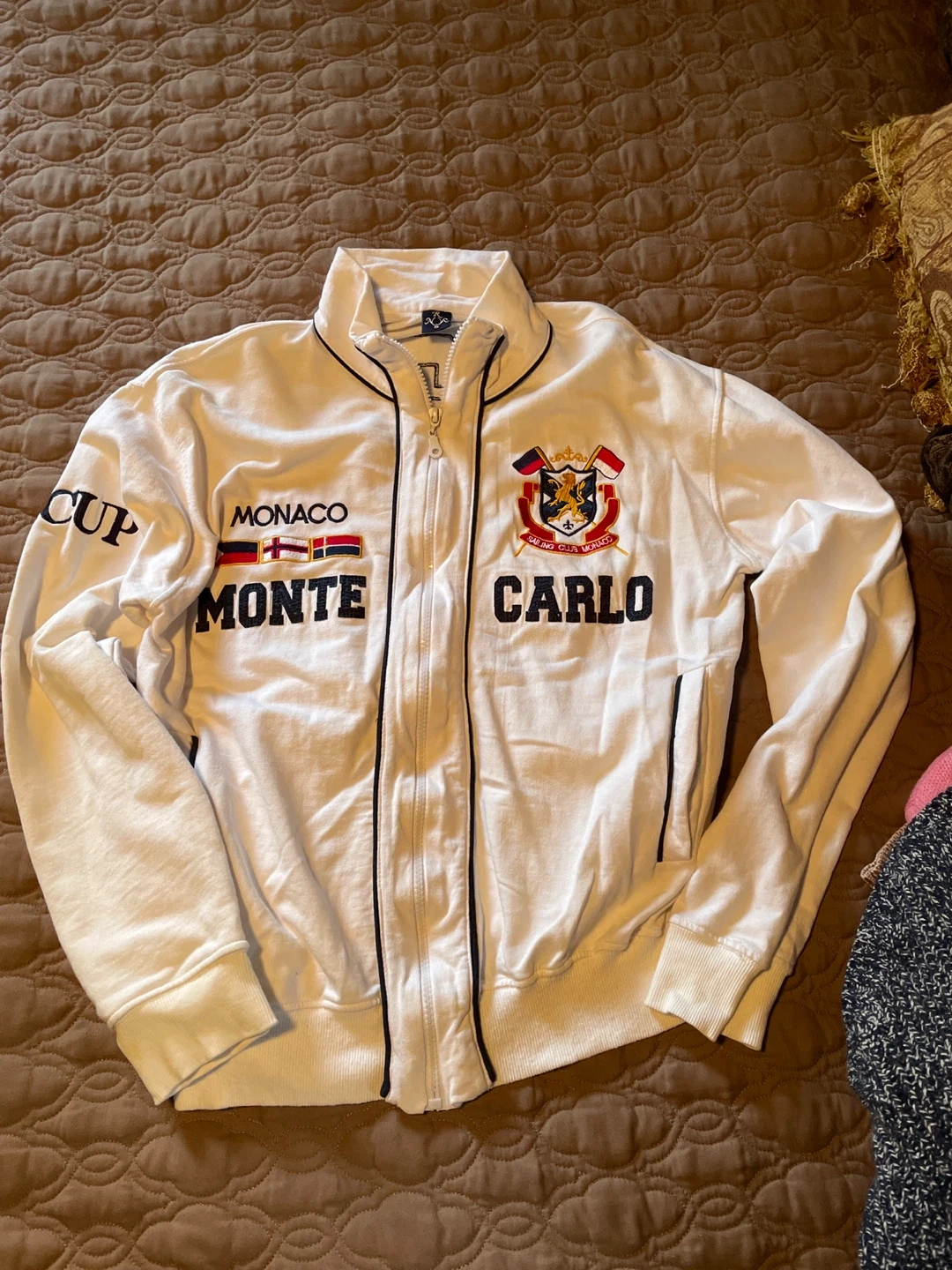 Selling a Reigning Champ Monte Carlo jacket in size small. It's white with black accents and has a sporty look with "MONTE CARLO" and other graphics on the front and back. Great for casual wear or a sporty outing