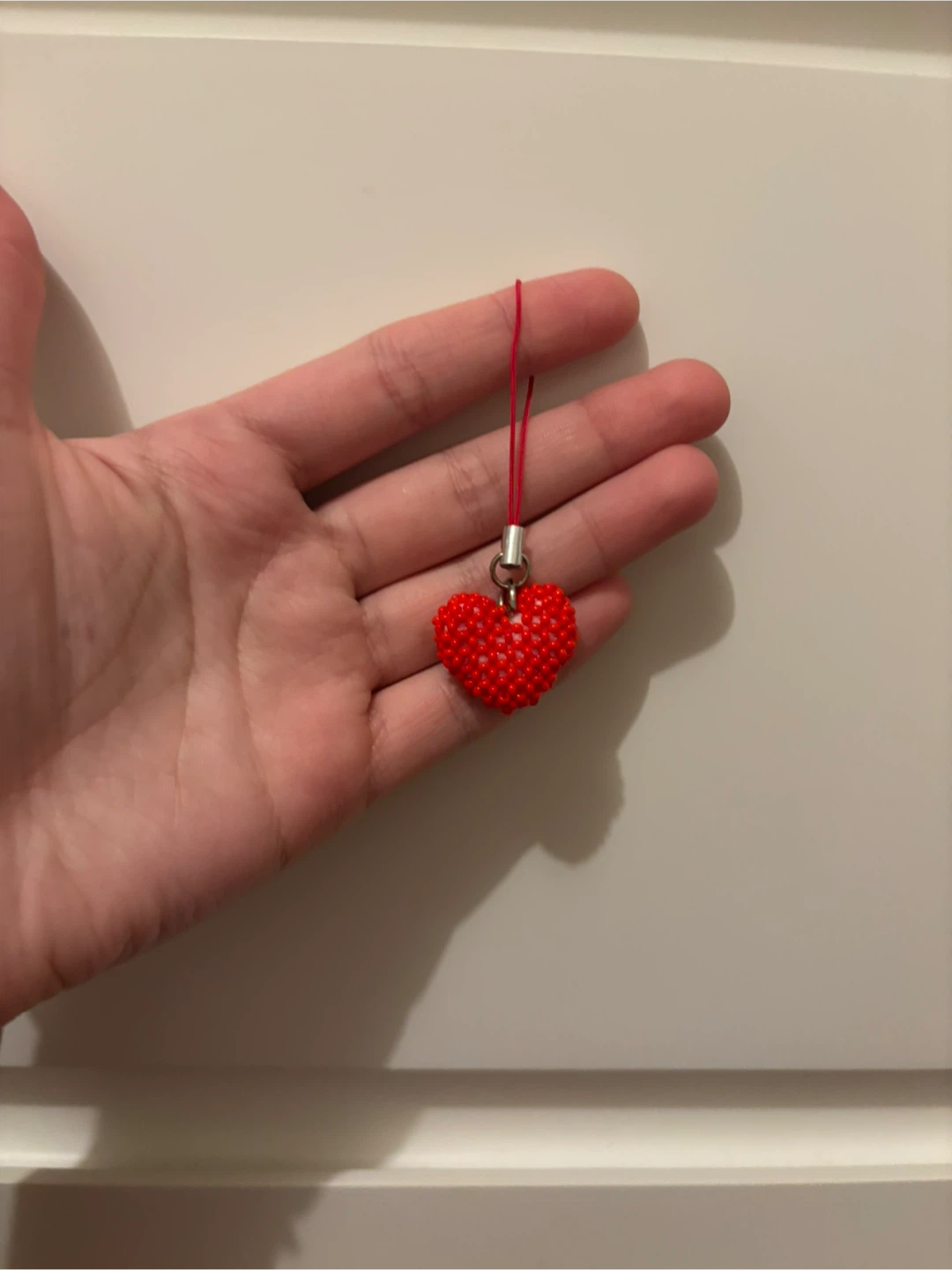 This is a super cute red beaded heart phone charm! It's perfect for adding a little sparkle to your phone or bag