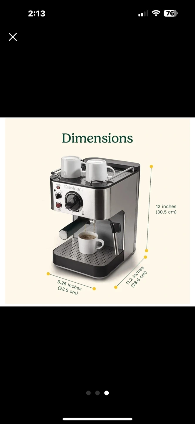 Selling a Cuisinart espresso machine in excellent condition! It has dimensions of 12 inches (30.5 cm) in height, 9.25 inches (23.5 cm) in width, and 11.2 inches (28.5 cm) in depth