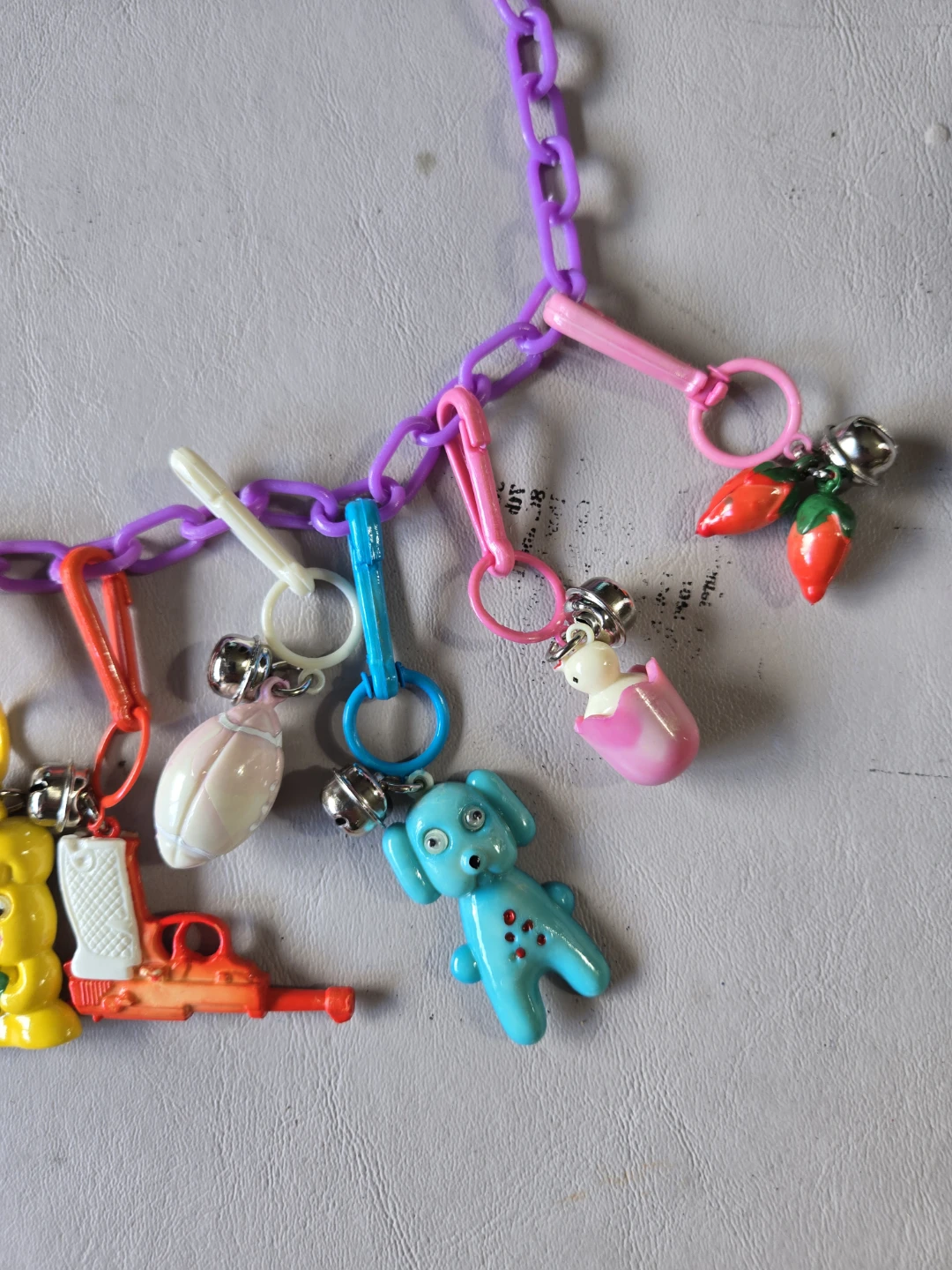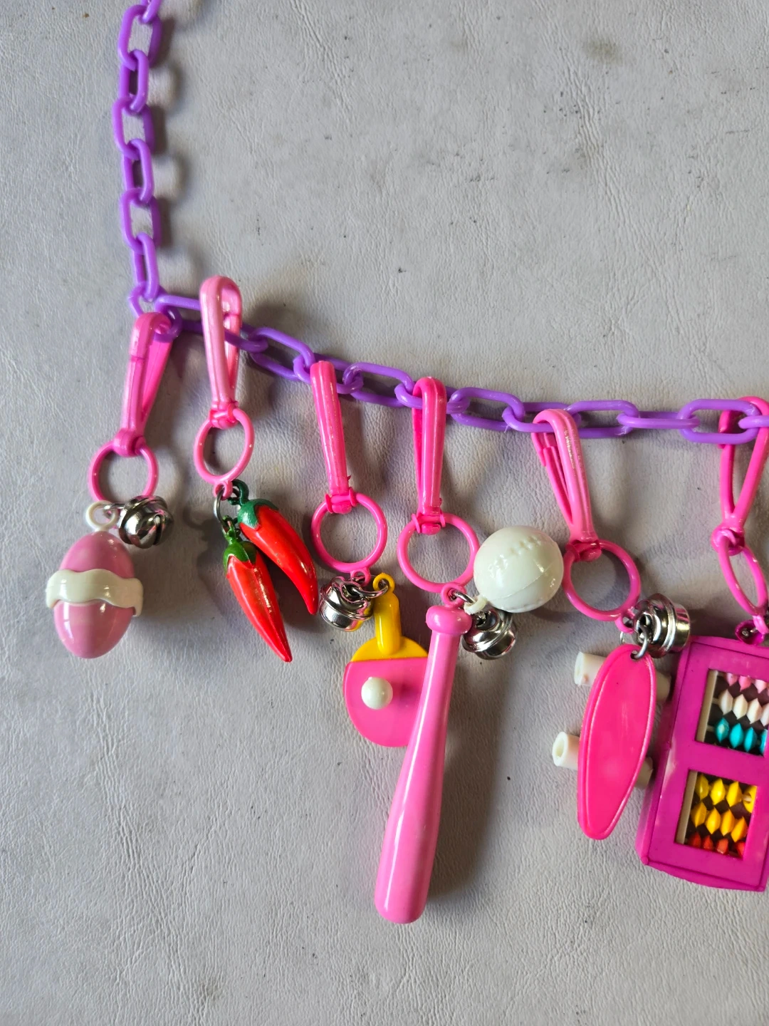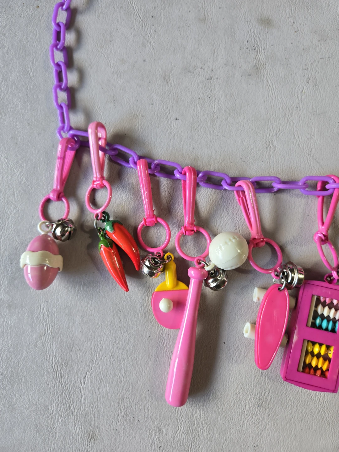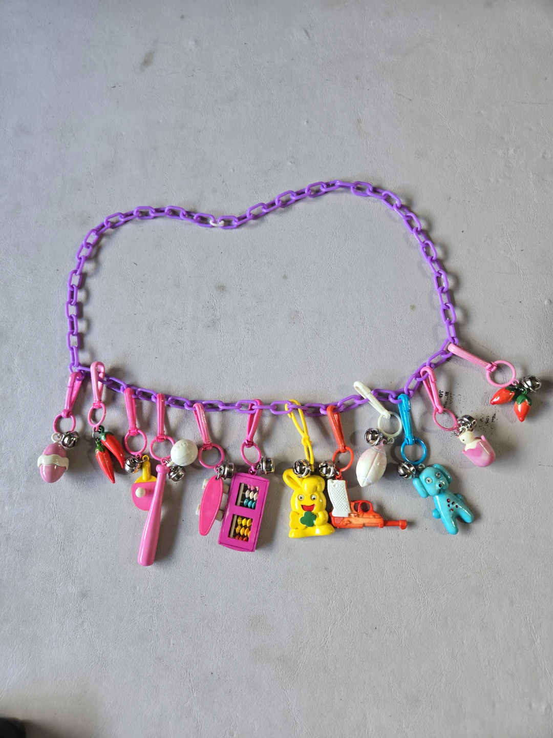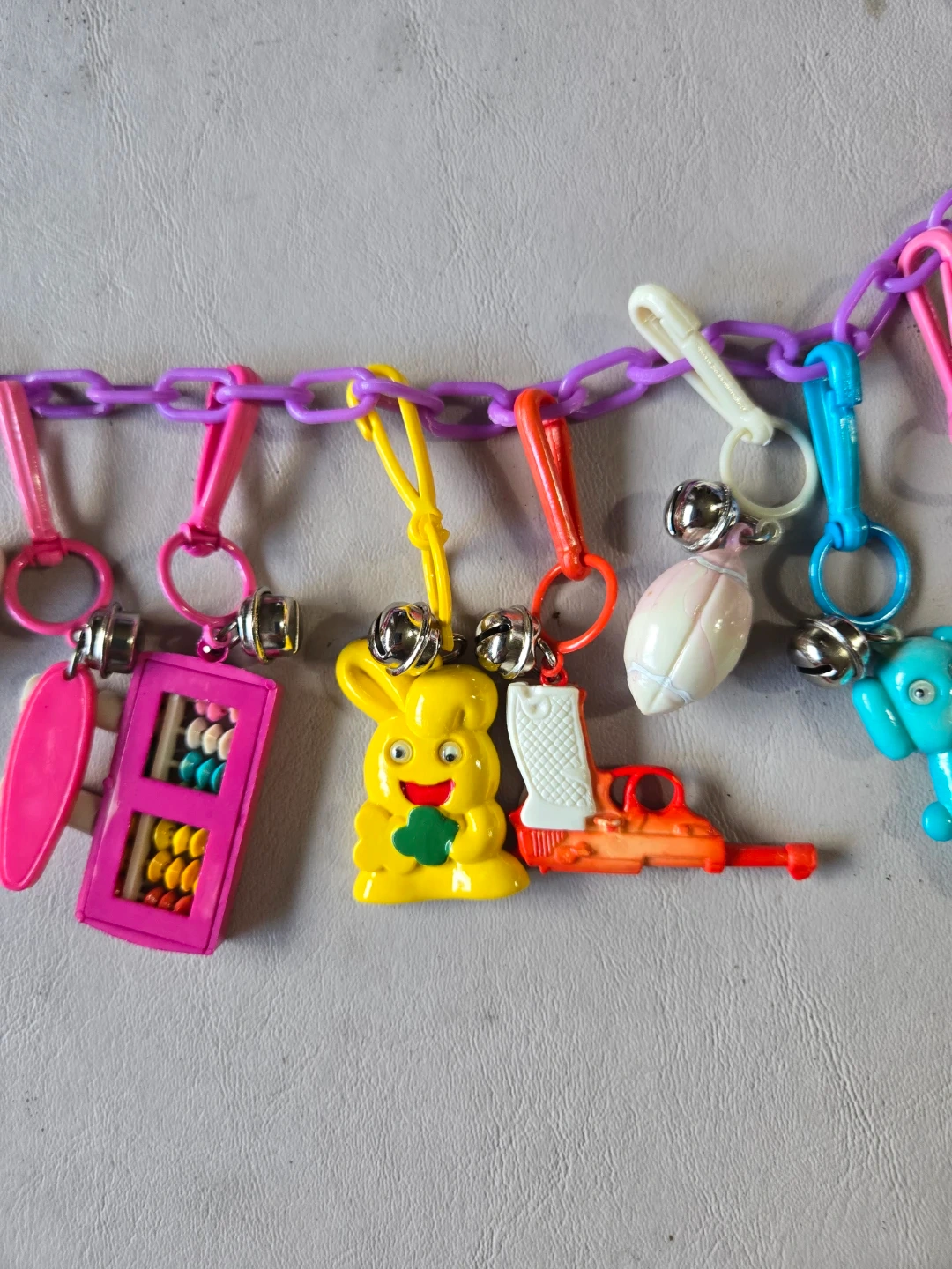 Selling a fun and colourful kids' toy necklace! It has a variety of cute charms attached, including an abacus, a bunny, a toy gun, and more. Perfect for dress-up or imaginative play!