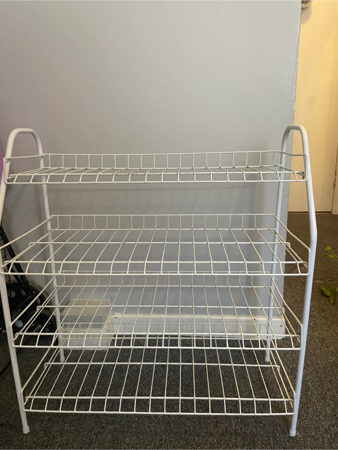 Selling a handy 4-tier shoe rack! It's made of white wire and is perfect for keeping your entryway or closet organized. Great for small spaces